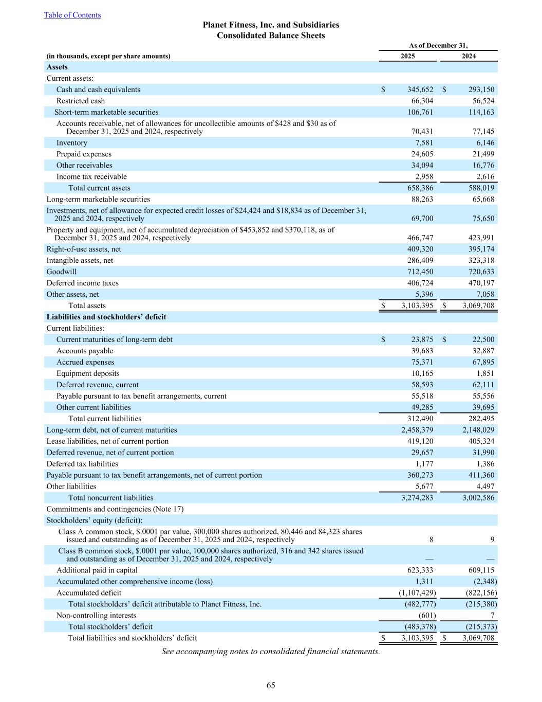 As of December 31, (in thousands, except per share amounts) 2025 2024 Assets Current assets: Cash and cash equivalents $ 345,652 $ 293,150 Restricted cash 66,304 56,524 Short-term marketable securities 106,761 114,163 Accounts receivable, net of allowances for uncollectible amounts of $428 and $30 as of December 31, 2025 and 2024, respectively 70,431 77,145 Inventory 7,581 6,146 Prepaid expenses 24,605 21,499 Other receivables 34,094 16,776 Income tax receivable 2,958 2,616 Total current assets 658,386 588,019 Long-term marketable securities 88,263 65,668 Investments, net of allowance for expected credit losses of $24,424 and $18,834 as of December 31, 2025 and 2024, respectively 69,700 75,650 Property and equipment, net of accumulated depreciation of $453,852 and $370,118, as of December 31, 2025 and 2024, respectively 466,747 423,991 Right-of-use assets, net 409,320 395,174 Intangible assets, net 286,409 323,318 Goodwill 712,450 720,633 Deferred income taxes 406,724 470,197 Other assets, net 5,396 7,058 Total assets $ 3,103,395 $ 3,069,708 Liabilities and stockholders’ deficit Current liabilities: Current maturities of long-term debt $ 23,875 $ 22,500 Accounts payable 39,683 32,887 Accrued expenses 75,371 67,895 Equipment deposits 10,165 1,851 Deferred revenue, current 58,593 62,111 Payable pursuant to tax benefit arrangements, current 55,518 55,556 Other current liabilities 49,285 39,695 Total current liabilities 312,490 282,495 Long-term debt, net of current maturities 2,458,379 2,148,029 Lease liabilities, net of current portion 419,120 405,324 Deferred revenue, net of current portion 29,657 31,990 Deferred tax liabilities 1,177 1,386 Payable pursuant to tax benefit arrangements, net of current portion 360,273 411,360 Other liabilities 5,677 4,497 Total noncurrent liabilities 3,274,283 3,002,586 Commitments and contingencies (Note 17) Stockholders’ equity (deficit): Class A common stock, $.0001 par value, 300,000 shares authorized, 80,446 and 84,323 shares issued and outstanding as of December 31, 2025 and 2024, respectively 8 9 Class B common stock, $.0001 par value, 100,000 shares authorized, 316 and 342 shares issued and outstanding as of December 31, 2025 and 2024, respectively — — Additional paid in capital 623,333 609,115 Accumulated other comprehensive income (loss) 1,311 (2,348) Accumulated deficit (1,107,429) (822,156) Total stockholders’ deficit attributable to Planet Fitness, Inc. (482,777) (215,380) Non-controlling interests (601) 7 Total stockholders’ deficit (483,378) (215,373) Total liabilities and stockholders’ deficit $ 3,103,395 $ 3,069,708 See accompanying notes to consolidated financial statements. Table of Contents Planet Fitness, Inc. and Subsidiaries Consolidated Balance Sheets 65
