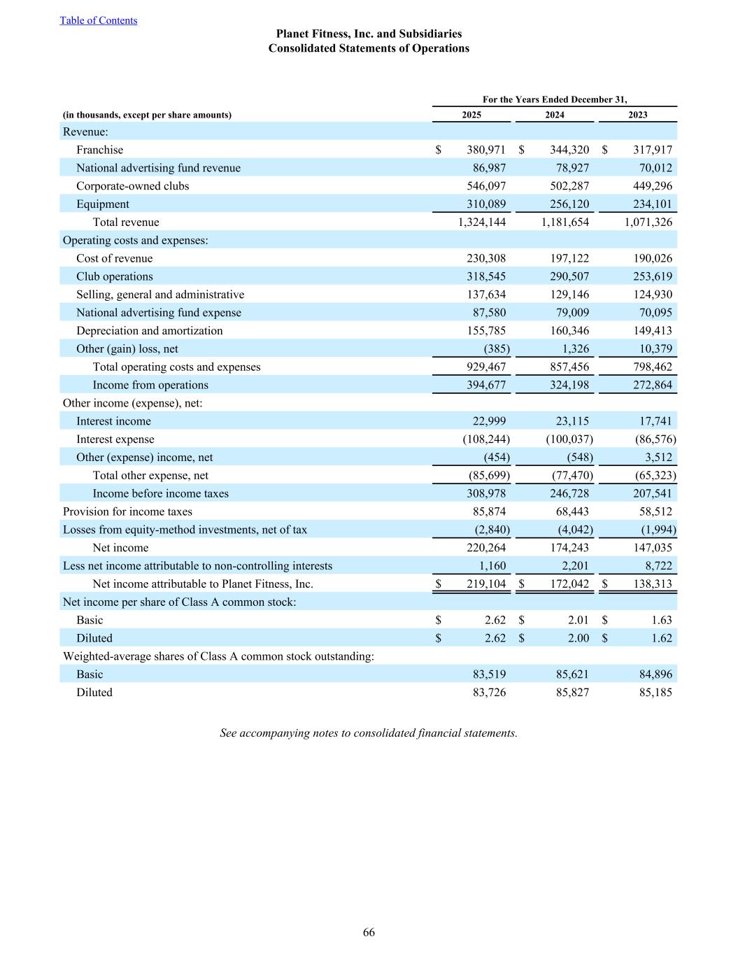 For the Years Ended December 31, (in thousands, except per share amounts) 2025 2024 2023 Revenue: Franchise $ 380,971 $ 344,320 $ 317,917 National advertising fund revenue 86,987 78,927 70,012 Corporate-owned clubs 546,097 502,287 449,296 Equipment 310,089 256,120 234,101 Total revenue 1,324,144 1,181,654 1,071,326 Operating costs and expenses: Cost of revenue 230,308 197,122 190,026 Club operations 318,545 290,507 253,619 Selling, general and administrative 137,634 129,146 124,930 National advertising fund expense 87,580 79,009 70,095 Depreciation and amortization 155,785 160,346 149,413 Other (gain) loss, net (385) 1,326 10,379 Total operating costs and expenses 929,467 857,456 798,462 Income from operations 394,677 324,198 272,864 Other income (expense), net: Interest income 22,999 23,115 17,741 Interest expense (108,244) (100,037) (86,576) Other (expense) income, net (454) (548) 3,512 Total other expense, net (85,699) (77,470) (65,323) Income before income taxes 308,978 246,728 207,541 Provision for income taxes 85,874 68,443 58,512 Losses from equity-method investments, net of tax (2,840) (4,042) (1,994) Net income 220,264 174,243 147,035 Less net income attributable to non-controlling interests 1,160 2,201 8,722 Net income attributable to Planet Fitness, Inc. $ 219,104 $ 172,042 $ 138,313 Net income per share of Class A common stock: Basic $ 2.62 $ 2.01 $ 1.63 Diluted $ 2.62 $ 2.00 $ 1.62 Weighted-average shares of Class A common stock outstanding: Basic 83,519 85,621 84,896 Diluted 83,726 85,827 85,185 See accompanying notes to consolidated financial statements. Table of Contents Planet Fitness, Inc. and Subsidiaries Consolidated Statements of Operations 66