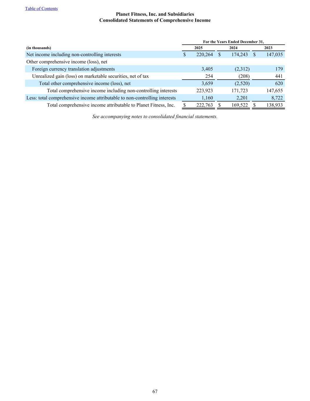 For the Years Ended December 31, (in thousands) 2025 2024 2023 Net income including non-controlling interests $ 220,264 $ 174,243 $ 147,035 Other comprehensive income (loss), net Foreign currency translation adjustments 3,405 (2,312) 179 Unrealized gain (loss) on marketable securities, net of tax 254 (208) 441 Total other comprehensive income (loss), net 3,659 (2,520) 620 Total comprehensive income including non-controlling interests 223,923 171,723 147,655 Less: total comprehensive income attributable to non-controlling interests 1,160 2,201 8,722 Total comprehensive income attributable to Planet Fitness, Inc. $ 222,763 $ 169,522 $ 138,933 See accompanying notes to consolidated financial statements. Table of Contents Planet Fitness, Inc. and Subsidiaries Consolidated Statements of Comprehensive Income 67