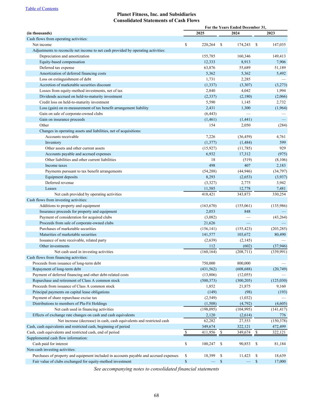 For the Years Ended December 31, (in thousands) 2025 2024 2023 Cash flows from operating activities: Net income $ 220,264 $ 174,243 $ 147,035 Adjustments to reconcile net income to net cash provided by operating activities: Depreciation and amortization 155,785 160,346 149,413 Equity-based compensation 12,333 8,913 7,906 Deferred tax expense 63,876 55,689 51,189 Amortization of deferred financing costs 5,362 5,362 5,492 Loss on extinguishment of debt 1,731 2,285 — Accretion of marketable securities discount (1,337) (3,307) (3,273) Losses from equity-method investments, net of tax 2,840 4,042 1,994 Dividends accrued on held-to-maturity investment (2,337) (2,180) (2,066) Credit loss on held-to-maturity investment 5,590 1,145 2,732 Loss (gain) on re-measurement of tax benefit arrangement liability 2,431 1,300 (1,964) Gain on sale of corporate-owned clubs (6,443) — — Gain on insurance proceeds (1,461) (1,441) — Other 154 2,050 (284) Changes in operating assets and liabilities, net of acquisitions: Accounts receivable 7,226 (36,459) 4,761 Inventory (1,377) (1,484) 599 Other assets and other current assets (15,927) (11,785) 929 Accounts payable and accrued expenses 6,932 17,312 (975) Other liabilities and other current liabilities 18 (519) (8,106) Income taxes 498 407 2,183 Payments pursuant to tax benefit arrangements (54,288) (44,946) (34,797) Equipment deposits 8,293 (2,653) (3,937) Deferred revenue (3,327) 2,775 3,942 Leases 11,585 12,778 7,481 Net cash provided by operating activities 418,421 343,873 330,254 Cash flows from investing activities: Additions to property and equipment (163,670) (155,061) (135,986) Insurance proceeds for property and equipment 2,053 848 — Payment of consideration for acquired clubs (3,082) — (43,264) Proceeds from sale of corporate-owned clubs 21,626 — — Purchases of marketable securities (156,141) (155,423) (203,285) Maturities of marketable securities 141,577 103,672 80,490 Issuance of note receivable, related party (2,639) (2,145) — Other investments 112 (602) (37,946) Net cash used in investing activities (160,164) (208,711) (339,991) Cash flows from financing activities: Proceeds from issuance of long-term debt 750,000 800,000 — Repayment of long-term debt (431,562) (608,688) (20,749) Payment of deferred financing and other debt-related costs (13,806) (12,055) — Repurchase and retirement of Class A common stock (500,373) (300,205) (125,030) Proceeds from issuance of Class A common stock 1,852 21,875 9,160 Principal payments on capital lease obligations (149) (98) (193) Payment of share repurchase excise tax (2,549) (1,032) — Distributions to members of Pla-Fit Holdings (1,508) (4,792) (4,605) Net cash used in financing activities (198,095) (104,995) (141,417) Effects of exchange rate changes on cash and cash equivalents 2,120 (2,614) 776 Net increase (decrease) in cash, cash equivalents and restricted cash 62,282 27,553 (150,378) Cash, cash equivalents and restricted cash, beginning of period 349,674 322,121 472,499 Cash, cash equivalents and restricted cash, end of period $ 411,956 $ 349,674 $ 322,121 Supplemental cash flow information: Cash paid for interest $ 100,247 $ 90,853 $ 81,184 Non-cash investing activities: Purchases of property and equipment included in accounts payable and accrued expenses $ 18,399 $ 11,423 $ 18,639 Fair value of clubs exchanged for equity-method investment $ — $ — $ 17,000 See accompanying notes to consolidated financial statements Table of Contents Planet Fitness, Inc. and Subsidiaries Consolidated Statements of Cash Flows 68