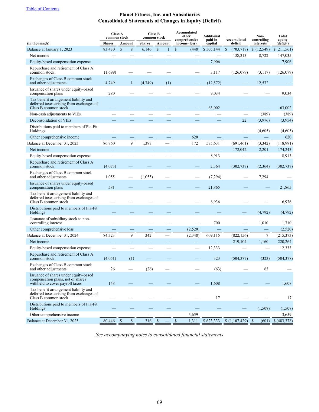Class A common stock Class B common stock Accumulated other comprehensive income (loss) Additional paid-in capital Accumulated deficit Non- controlling interests Total equity (deficit)(in thousands) Shares Amount Shares Amount Balance at January 1, 2023 83,430 $ 8 6,146 $ 1 $ (448) $ 505,144 $ (703,717) $ (12,549) $ (211,561) Net income — — — — — — 138,313 8,722 147,035 Equity-based compensation expense — — — — — 7,906 — — 7,906 Repurchase and retirement of Class A common stock (1,699) — — — — 3,117 (126,079) (3,117) (126,079) Exchanges of Class B common stock and other adjustments 4,749 1 (4,749) (1) — (12,572) — 12,572 — Issuance of shares under equity-based compensation plans 280 — — — — 9,034 — — 9,034 Tax benefit arrangement liability and deferred taxes arising from exchanges of Class B common stock — — — — — 63,002 — — 63,002 Non-cash adjustments to VIEs — — — — — — — (389) (389) Deconsolidation of VIEs — — — — — — 22 (3,976) (3,954) Distributions paid to members of Pla-Fit Holdings — — — — — — — (4,605) (4,605) Other comprehensive income — — — — 620 — — — 620 Balance at December 31, 2023 86,760 9 1,397 — 172 575,631 (691,461) (3,342) (118,991) Net income — — — — — — 172,042 2,201 174,243 Equity-based compensation expense — — — — — 8,913 — — 8,913 Repurchase and retirement of Class A common stock (4,073) — — — — 2,364 (302,737) (2,364) (302,737) Exchanges of Class B common stock and other adjustments 1,055 — (1,055) — — (7,294) — 7,294 — Issuance of shares under equity-based compensation plans 581 — — — — 21,865 — — 21,865 Tax benefit arrangement liability and deferred taxes arising from exchanges of Class B common stock — — — — — 6,936 — — 6,936 Distributions paid to members of Pla-Fit Holdings — — — — — — — (4,792) (4,792) Issuance of subsidiary stock to non- controlling interest — — — — — 700 — 1,010 1,710 Other comprehensive loss — — — — (2,520) — — — (2,520) Balance at December 31, 2024 84,323 9 342 — (2,348) 609,115 (822,156) 7 (215,373) Net income — — — — — — 219,104 1,160 220,264 Equity-based compensation expense — — — — — 12,333 — — 12,333 Repurchase and retirement of Class A common stock (4,051) (1) — — — 323 (504,377) (323) (504,378) Exchanges of Class B common stock and other adjustments 26 — (26) — — (63) — 63 — Issuance of shares under equity-based compensation plans, net of shares withheld to cover payroll taxes 148 — — — — 1,608 — — 1,608 Tax benefit arrangement liability and deferred taxes arising from exchanges of Class B common stock — — — — — 17 — — 17 Distributions paid to members of Pla-Fit Holdings — — — — — — — (1,508) (1,508) Other comprehensive income — — — — 3,659 — — — 3,659 Balance at December 31, 2025 80,446 $ 8 316 $ — $ 1,311 $ 623,333 $ (1,107,429) $ (601) $ (483,378) See accompanying notes to consolidated financial statements Table of Contents Planet Fitness, Inc. and Subsidiaries Consolidated Statements of Changes in Equity (Deficit) 69