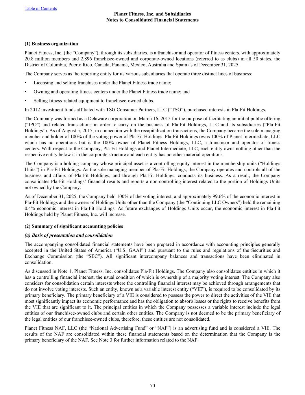 (1) Business organization Planet Fitness, Inc. (the “Company”), through its subsidiaries, is a franchisor and operator of fitness centers, with approximately 20.8 million members and 2,896 franchisee-owned and corporate-owned locations (referred to as clubs) in all 50 states, the District of Columbia, Puerto Rico, Canada, Panama, Mexico, Australia and Spain as of December 31, 2025. The Company serves as the reporting entity for its various subsidiaries that operate three distinct lines of business: • Licensing and selling franchises under the Planet Fitness trade name; • Owning and operating fitness centers under the Planet Fitness trade name; and • Selling fitness-related equipment to franchisee-owned clubs. In 2012 investment funds affiliated with TSG Consumer Partners, LLC (“TSG”), purchased interests in Pla-Fit Holdings. The Company was formed as a Delaware corporation on March 16, 2015 for the purpose of facilitating an initial public offering (“IPO”) and related transactions in order to carry on the business of Pla-Fit Holdings, LLC and its subsidiaries (“Pla-Fit Holdings”). As of August 5, 2015, in connection with the recapitalization transactions, the Company became the sole managing member and holder of 100% of the voting power of Pla-Fit Holdings. Pla-Fit Holdings owns 100% of Planet Intermediate, LLC which has no operations but is the 100% owner of Planet Fitness Holdings, LLC, a franchisor and operator of fitness centers. With respect to the Company, Pla-Fit Holdings and Planet Intermediate, LLC, each entity owns nothing other than the respective entity below it in the corporate structure and each entity has no other material operations. The Company is a holding company whose principal asset is a controlling equity interest in the membership units (“Holdings Units”) in Pla-Fit Holdings. As the sole managing member of Pla-Fit Holdings, the Company operates and controls all of the business and affairs of Pla-Fit Holdings, and through Pla-Fit Holdings, conducts its business. As a result, the Company consolidates Pla-Fit Holdings’ financial results and reports a non-controlling interest related to the portion of Holdings Units not owned by the Company. As of December 31, 2025, the Company held 100% of the voting interest, and approximately 99.6% of the economic interest in Pla-Fit Holdings and the owners of Holdings Units other than the Company (the “Continuing LLC Owners”) held the remaining 0.4% economic interest in Pla-Fit Holdings. As future exchanges of Holdings Units occur, the economic interest in Pla-Fit Holdings held by Planet Fitness, Inc. will increase. (2) Summary of significant accounting policies (a) Basis of presentation and consolidation The accompanying consolidated financial statements have been prepared in accordance with accounting principles generally accepted in the United States of America (“U.S. GAAP”) and pursuant to the rules and regulations of the Securities and Exchange Commission (the “SEC”). All significant intercompany balances and transactions have been eliminated in consolidation. As discussed in Note 1, Planet Fitness, Inc. consolidates Pla-Fit Holdings. The Company also consolidates entities in which it has a controlling financial interest, the usual condition of which is ownership of a majority voting interest. The Company also considers for consolidation certain interests where the controlling financial interest may be achieved through arrangements that do not involve voting interests. Such an entity, known as a variable interest entity (“VIE”), is required to be consolidated by its primary beneficiary. The primary beneficiary of a VIE is considered to possess the power to direct the activities of the VIE that most significantly impact its economic performance and has the obligation to absorb losses or the rights to receive benefits from the VIE that are significant to it. The principal entities in which the Company possesses a variable interest include the legal entities of our franchisee-owned clubs and certain other entities. The Company is not deemed to be the primary beneficiary of the legal entities of our franchisee-owned clubs, therefore, these entities are not consolidated. Planet Fitness NAF, LLC (the “National Advertising Fund” or “NAF”) is an advertising fund and is considered a VIE. The results of the NAF are consolidated within these financial statements based on the determination that the Company is the primary beneficiary of the NAF. See Note 3 for further information related to the NAF. Table of Contents Planet Fitness, Inc. and Subsidiaries Notes to Consolidated Financial Statements 70