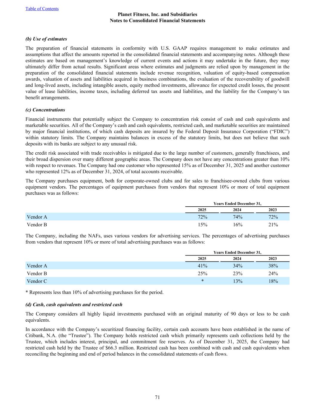 (b) Use of estimates The preparation of financial statements in conformity with U.S. GAAP requires management to make estimates and assumptions that affect the amounts reported in the consolidated financial statements and accompanying notes. Although these estimates are based on management’s knowledge of current events and actions it may undertake in the future, they may ultimately differ from actual results. Significant areas where estimates and judgments are relied upon by management in the preparation of the consolidated financial statements include revenue recognition, valuation of equity-based compensation awards, valuation of assets and liabilities acquired in business combinations, the evaluation of the recoverability of goodwill and long-lived assets, including intangible assets, equity method investments, allowance for expected credit losses, the present value of lease liabilities, income taxes, including deferred tax assets and liabilities, and the liability for the Company’s tax benefit arrangements. (c) Concentrations Financial instruments that potentially subject the Company to concentration risk consist of cash and cash equivalents and marketable securities. All of the Company’s cash and cash equivalents, restricted cash, and marketable securities are maintained by major financial institutions, of which cash deposits are insured by the Federal Deposit Insurance Corporation (“FDIC”) within statutory limits. The Company maintains balances in excess of the statutory limits, but does not believe that such deposits with its banks are subject to any unusual risk. The credit risk associated with trade receivables is mitigated due to the large number of customers, generally franchisees, and their broad dispersion over many different geographic areas. The Company does not have any concentrations greater than 10% with respect to revenues. The Company had one customer who represented 15% as of December 31, 2025 and another customer who represented 12% as of December 31, 2024, of total accounts receivable. The Company purchases equipment, both for corporate-owned clubs and for sales to franchisee-owned clubs from various equipment vendors. The percentages of equipment purchases from vendors that represent 10% or more of total equipment purchases was as follows: Years Ended December 31, 2025 2024 2023 Vendor A 72% 74% 72% Vendor B 15% 16% 21% The Company, including the NAFs, uses various vendors for advertising services. The percentages of advertising purchases from vendors that represent 10% or more of total advertising purchases was as follows: Years Ended December 31, 2025 2024 2023 Vendor A 41% 34% 38% Vendor B 25% 23% 24% Vendor C * 13% 18% * Represents less than 10% of advertising purchases for the period. (d) Cash, cash equivalents and restricted cash The Company considers all highly liquid investments purchased with an original maturity of 90 days or less to be cash equivalents. In accordance with the Company’s securitized financing facility, certain cash accounts have been established in the name of Citibank, N.A. (the “Trustee”). The Company holds restricted cash which primarily represents cash collections held by the Trustee, which includes interest, principal, and commitment fee reserves. As of December 31, 2025, the Company had restricted cash held by the Trustee of $66.3 million. Restricted cash has been combined with cash and cash equivalents when reconciling the beginning and end of period balances in the consolidated statements of cash flows. Table of Contents Planet Fitness, Inc. and Subsidiaries Notes to Consolidated Financial Statements 71