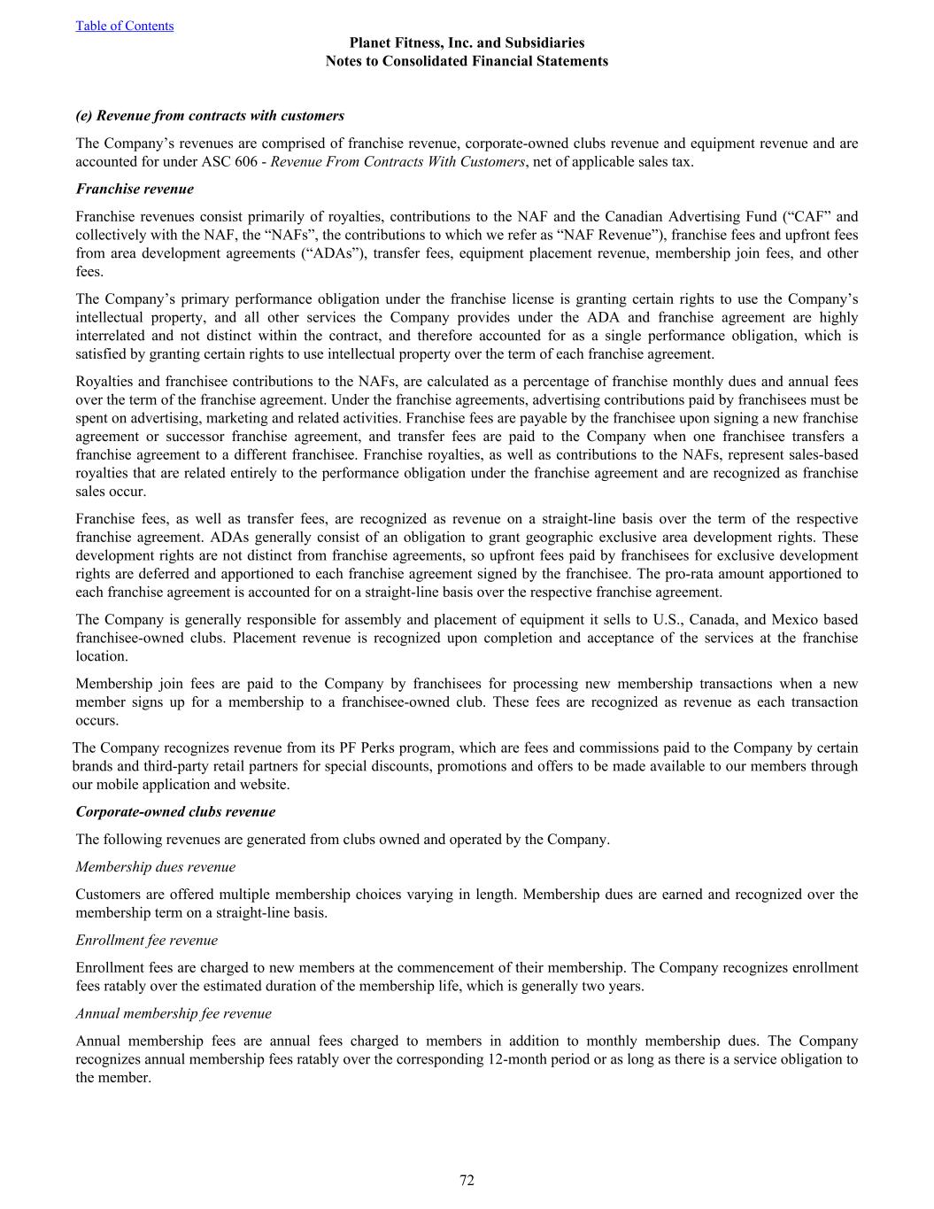 (e) Revenue from contracts with customers The Company’s revenues are comprised of franchise revenue, corporate-owned clubs revenue and equipment revenue and are accounted for under ASC 606 - Revenue From Contracts With Customers, net of applicable sales tax. Franchise revenue Franchise revenues consist primarily of royalties, contributions to the NAF and the Canadian Advertising Fund (“CAF” and collectively with the NAF, the “NAFs”, the contributions to which we refer as “NAF Revenue”), franchise fees and upfront fees from area development agreements (“ADAs”), transfer fees, equipment placement revenue, membership join fees, and other fees. The Company’s primary performance obligation under the franchise license is granting certain rights to use the Company’s intellectual property, and all other services the Company provides under the ADA and franchise agreement are highly interrelated and not distinct within the contract, and therefore accounted for as a single performance obligation, which is satisfied by granting certain rights to use intellectual property over the term of each franchise agreement. Royalties and franchisee contributions to the NAFs, are calculated as a percentage of franchise monthly dues and annual fees over the term of the franchise agreement. Under the franchise agreements, advertising contributions paid by franchisees must be spent on advertising, marketing and related activities. Franchise fees are payable by the franchisee upon signing a new franchise agreement or successor franchise agreement, and transfer fees are paid to the Company when one franchisee transfers a franchise agreement to a different franchisee. Franchise royalties, as well as contributions to the NAFs, represent sales-based royalties that are related entirely to the performance obligation under the franchise agreement and are recognized as franchise sales occur. Franchise fees, as well as transfer fees, are recognized as revenue on a straight-line basis over the term of the respective franchise agreement. ADAs generally consist of an obligation to grant geographic exclusive area development rights. These development rights are not distinct from franchise agreements, so upfront fees paid by franchisees for exclusive development rights are deferred and apportioned to each franchise agreement signed by the franchisee. The pro-rata amount apportioned to each franchise agreement is accounted for on a straight-line basis over the respective franchise agreement. The Company is generally responsible for assembly and placement of equipment it sells to U.S., Canada, and Mexico based franchisee-owned clubs. Placement revenue is recognized upon completion and acceptance of the services at the franchise location. Membership join fees are paid to the Company by franchisees for processing new membership transactions when a new member signs up for a membership to a franchisee-owned club. These fees are recognized as revenue as each transaction occurs. The Company recognizes revenue from its PF Perks program, which are fees and commissions paid to the Company by certain brands and third-party retail partners for special discounts, promotions and offers to be made available to our members through our mobile application and website. Corporate-owned clubs revenue The following revenues are generated from clubs owned and operated by the Company. Membership dues revenue Customers are offered multiple membership choices varying in length. Membership dues are earned and recognized over the membership term on a straight-line basis. Enrollment fee revenue Enrollment fees are charged to new members at the commencement of their membership. The Company recognizes enrollment fees ratably over the estimated duration of the membership life, which is generally two years. Annual membership fee revenue Annual membership fees are annual fees charged to members in addition to monthly membership dues. The Company recognizes annual membership fees ratably over the corresponding 12-month period or as long as there is a service obligation to the member. Table of Contents Planet Fitness, Inc. and Subsidiaries Notes to Consolidated Financial Statements 72