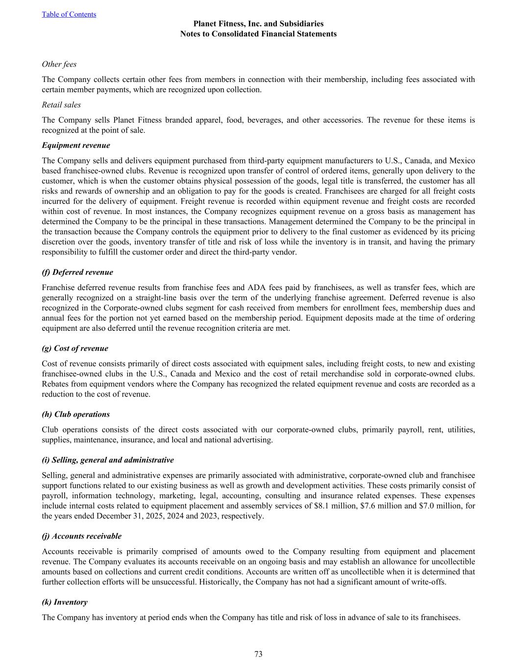 Other fees The Company collects certain other fees from members in connection with their membership, including fees associated with certain member payments, which are recognized upon collection. Retail sales The Company sells Planet Fitness branded apparel, food, beverages, and other accessories. The revenue for these items is recognized at the point of sale. Equipment revenue The Company sells and delivers equipment purchased from third-party equipment manufacturers to U.S., Canada, and Mexico based franchisee-owned clubs. Revenue is recognized upon transfer of control of ordered items, generally upon delivery to the customer, which is when the customer obtains physical possession of the goods, legal title is transferred, the customer has all risks and rewards of ownership and an obligation to pay for the goods is created. Franchisees are charged for all freight costs incurred for the delivery of equipment. Freight revenue is recorded within equipment revenue and freight costs are recorded within cost of revenue. In most instances, the Company recognizes equipment revenue on a gross basis as management has determined the Company to be the principal in these transactions. Management determined the Company to be the principal in the transaction because the Company controls the equipment prior to delivery to the final customer as evidenced by its pricing discretion over the goods, inventory transfer of title and risk of loss while the inventory is in transit, and having the primary responsibility to fulfill the customer order and direct the third-party vendor. (f) Deferred revenue Franchise deferred revenue results from franchise fees and ADA fees paid by franchisees, as well as transfer fees, which are generally recognized on a straight-line basis over the term of the underlying franchise agreement. Deferred revenue is also recognized in the Corporate-owned clubs segment for cash received from members for enrollment fees, membership dues and annual fees for the portion not yet earned based on the membership period. Equipment deposits made at the time of ordering equipment are also deferred until the revenue recognition criteria are met. (g) Cost of revenue Cost of revenue consists primarily of direct costs associated with equipment sales, including freight costs, to new and existing franchisee-owned clubs in the U.S., Canada and Mexico and the cost of retail merchandise sold in corporate-owned clubs. Rebates from equipment vendors where the Company has recognized the related equipment revenue and costs are recorded as a reduction to the cost of revenue. (h) Club operations Club operations consists of the direct costs associated with our corporate-owned clubs, primarily payroll, rent, utilities, supplies, maintenance, insurance, and local and national advertising. (i) Selling, general and administrative Selling, general and administrative expenses are primarily associated with administrative, corporate-owned club and franchisee support functions related to our existing business as well as growth and development activities. These costs primarily consist of payroll, information technology, marketing, legal, accounting, consulting and insurance related expenses. These expenses include internal costs related to equipment placement and assembly services of $8.1 million, $7.6 million and $7.0 million, for the years ended December 31, 2025, 2024 and 2023, respectively. (j) Accounts receivable Accounts receivable is primarily comprised of amounts owed to the Company resulting from equipment and placement revenue. The Company evaluates its accounts receivable on an ongoing basis and may establish an allowance for uncollectible amounts based on collections and current credit conditions. Accounts are written off as uncollectible when it is determined that further collection efforts will be unsuccessful. Historically, the Company has not had a significant amount of write-offs. (k) Inventory The Company has inventory at period ends when the Company has title and risk of loss in advance of sale to its franchisees. Table of Contents Planet Fitness, Inc. and Subsidiaries Notes to Consolidated Financial Statements 73
