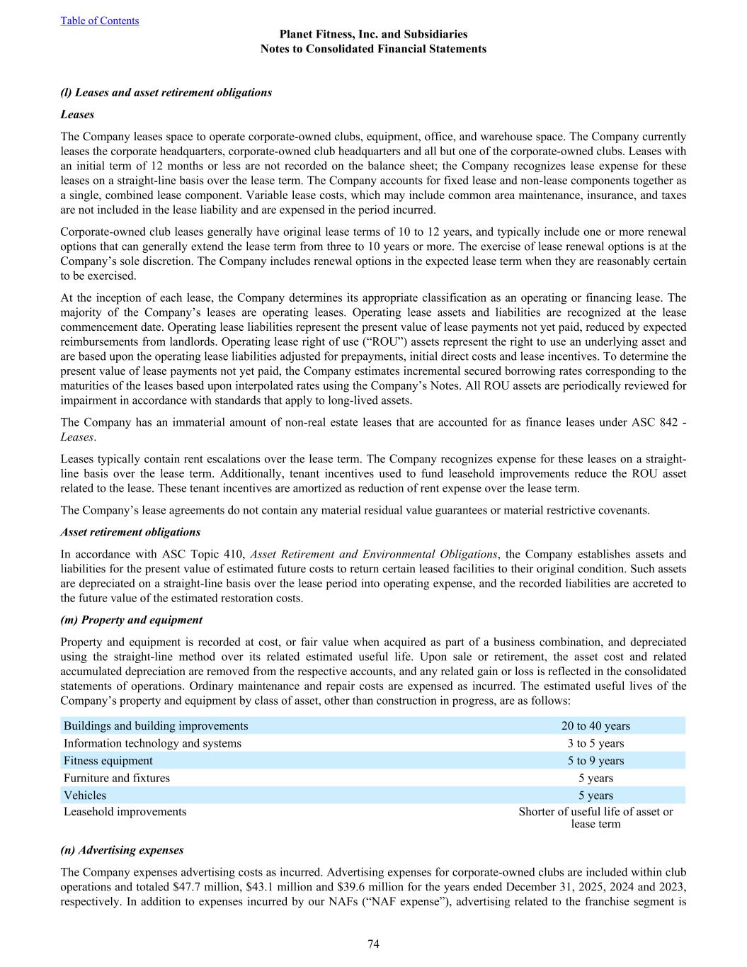 (l) Leases and asset retirement obligations Leases The Company leases space to operate corporate-owned clubs, equipment, office, and warehouse space. The Company currently leases the corporate headquarters, corporate-owned club headquarters and all but one of the corporate-owned clubs. Leases with an initial term of 12 months or less are not recorded on the balance sheet; the Company recognizes lease expense for these leases on a straight-line basis over the lease term. The Company accounts for fixed lease and non-lease components together as a single, combined lease component. Variable lease costs, which may include common area maintenance, insurance, and taxes are not included in the lease liability and are expensed in the period incurred. Corporate-owned club leases generally have original lease terms of 10 to 12 years, and typically include one or more renewal options that can generally extend the lease term from three to 10 years or more. The exercise of lease renewal options is at the Company’s sole discretion. The Company includes renewal options in the expected lease term when they are reasonably certain to be exercised. At the inception of each lease, the Company determines its appropriate classification as an operating or financing lease. The majority of the Company’s leases are operating leases. Operating lease assets and liabilities are recognized at the lease commencement date. Operating lease liabilities represent the present value of lease payments not yet paid, reduced by expected reimbursements from landlords. Operating lease right of use (“ROU”) assets represent the right to use an underlying asset and are based upon the operating lease liabilities adjusted for prepayments, initial direct costs and lease incentives. To determine the present value of lease payments not yet paid, the Company estimates incremental secured borrowing rates corresponding to the maturities of the leases based upon interpolated rates using the Company’s Notes. All ROU assets are periodically reviewed for impairment in accordance with standards that apply to long-lived assets. The Company has an immaterial amount of non-real estate leases that are accounted for as finance leases under ASC 842 - Leases. Leases typically contain rent escalations over the lease term. The Company recognizes expense for these leases on a straight- line basis over the lease term. Additionally, tenant incentives used to fund leasehold improvements reduce the ROU asset related to the lease. These tenant incentives are amortized as reduction of rent expense over the lease term. The Company’s lease agreements do not contain any material residual value guarantees or material restrictive covenants. Asset retirement obligations In accordance with ASC Topic 410, Asset Retirement and Environmental Obligations, the Company establishes assets and liabilities for the present value of estimated future costs to return certain leased facilities to their original condition. Such assets are depreciated on a straight-line basis over the lease period into operating expense, and the recorded liabilities are accreted to the future value of the estimated restoration costs. (m) Property and equipment Property and equipment is recorded at cost, or fair value when acquired as part of a business combination, and depreciated using the straight-line method over its related estimated useful life. Upon sale or retirement, the asset cost and related accumulated depreciation are removed from the respective accounts, and any related gain or loss is reflected in the consolidated statements of operations. Ordinary maintenance and repair costs are expensed as incurred. The estimated useful lives of the Company’s property and equipment by class of asset, other than construction in progress, are as follows: Buildings and building improvements 20 to 40 years Information technology and systems 3 to 5 years Fitness equipment 5 to 9 years Furniture and fixtures 5 years Vehicles 5 years Leasehold improvements Shorter of useful life of asset or lease term (n) Advertising expenses The Company expenses advertising costs as incurred. Advertising expenses for corporate-owned clubs are included within club operations and totaled $47.7 million, $43.1 million and $39.6 million for the years ended December 31, 2025, 2024 and 2023, respectively. In addition to expenses incurred by our NAFs (“NAF expense”), advertising related to the franchise segment is Table of Contents Planet Fitness, Inc. and Subsidiaries Notes to Consolidated Financial Statements 74