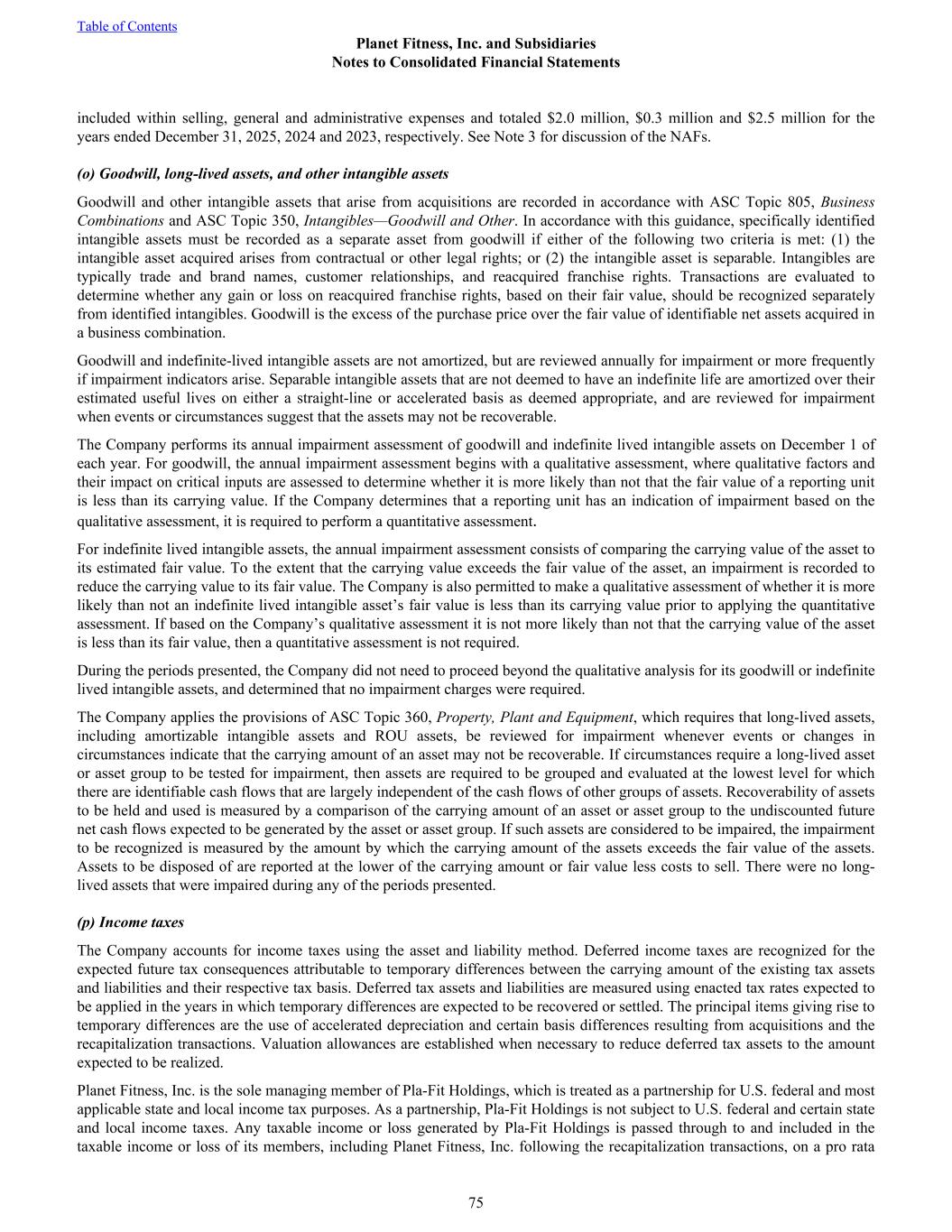 included within selling, general and administrative expenses and totaled $2.0 million, $0.3 million and $2.5 million for the years ended December 31, 2025, 2024 and 2023, respectively. See Note 3 for discussion of the NAFs. (o) Goodwill, long-lived assets, and other intangible assets Goodwill and other intangible assets that arise from acquisitions are recorded in accordance with ASC Topic 805, Business Combinations and ASC Topic 350, Intangibles—Goodwill and Other. In accordance with this guidance, specifically identified intangible assets must be recorded as a separate asset from goodwill if either of the following two criteria is met: (1) the intangible asset acquired arises from contractual or other legal rights; or (2) the intangible asset is separable. Intangibles are typically trade and brand names, customer relationships, and reacquired franchise rights. Transactions are evaluated to determine whether any gain or loss on reacquired franchise rights, based on their fair value, should be recognized separately from identified intangibles. Goodwill is the excess of the purchase price over the fair value of identifiable net assets acquired in a business combination. Goodwill and indefinite-lived intangible assets are not amortized, but are reviewed annually for impairment or more frequently if impairment indicators arise. Separable intangible assets that are not deemed to have an indefinite life are amortized over their estimated useful lives on either a straight-line or accelerated basis as deemed appropriate, and are reviewed for impairment when events or circumstances suggest that the assets may not be recoverable. The Company performs its annual impairment assessment of goodwill and indefinite lived intangible assets on December 1 of each year. For goodwill, the annual impairment assessment begins with a qualitative assessment, where qualitative factors and their impact on critical inputs are assessed to determine whether it is more likely than not that the fair value of a reporting unit is less than its carrying value. If the Company determines that a reporting unit has an indication of impairment based on the qualitative assessment, it is required to perform a quantitative assessment. For indefinite lived intangible assets, the annual impairment assessment consists of comparing the carrying value of the asset to its estimated fair value. To the extent that the carrying value exceeds the fair value of the asset, an impairment is recorded to reduce the carrying value to its fair value. The Company is also permitted to make a qualitative assessment of whether it is more likely than not an indefinite lived intangible asset’s fair value is less than its carrying value prior to applying the quantitative assessment. If based on the Company’s qualitative assessment it is not more likely than not that the carrying value of the asset is less than its fair value, then a quantitative assessment is not required. During the periods presented, the Company did not need to proceed beyond the qualitative analysis for its goodwill or indefinite lived intangible assets, and determined that no impairment charges were required. The Company applies the provisions of ASC Topic 360, Property, Plant and Equipment, which requires that long-lived assets, including amortizable intangible assets and ROU assets, be reviewed for impairment whenever events or changes in circumstances indicate that the carrying amount of an asset may not be recoverable. If circumstances require a long-lived asset or asset group to be tested for impairment, then assets are required to be grouped and evaluated at the lowest level for which there are identifiable cash flows that are largely independent of the cash flows of other groups of assets. Recoverability of assets to be held and used is measured by a comparison of the carrying amount of an asset or asset group to the undiscounted future net cash flows expected to be generated by the asset or asset group. If such assets are considered to be impaired, the impairment to be recognized is measured by the amount by which the carrying amount of the assets exceeds the fair value of the assets. Assets to be disposed of are reported at the lower of the carrying amount or fair value less costs to sell. There were no long- lived assets that were impaired during any of the periods presented. (p) Income taxes The Company accounts for income taxes using the asset and liability method. Deferred income taxes are recognized for the expected future tax consequences attributable to temporary differences between the carrying amount of the existing tax assets and liabilities and their respective tax basis. Deferred tax assets and liabilities are measured using enacted tax rates expected to be applied in the years in which temporary differences are expected to be recovered or settled. The principal items giving rise to temporary differences are the use of accelerated depreciation and certain basis differences resulting from acquisitions and the recapitalization transactions. Valuation allowances are established when necessary to reduce deferred tax assets to the amount expected to be realized. Planet Fitness, Inc. is the sole managing member of Pla-Fit Holdings, which is treated as a partnership for U.S. federal and most applicable state and local income tax purposes. As a partnership, Pla-Fit Holdings is not subject to U.S. federal and certain state and local income taxes. Any taxable income or loss generated by Pla-Fit Holdings is passed through to and included in the taxable income or loss of its members, including Planet Fitness, Inc. following the recapitalization transactions, on a pro rata Table of Contents Planet Fitness, Inc. and Subsidiaries Notes to Consolidated Financial Statements 75