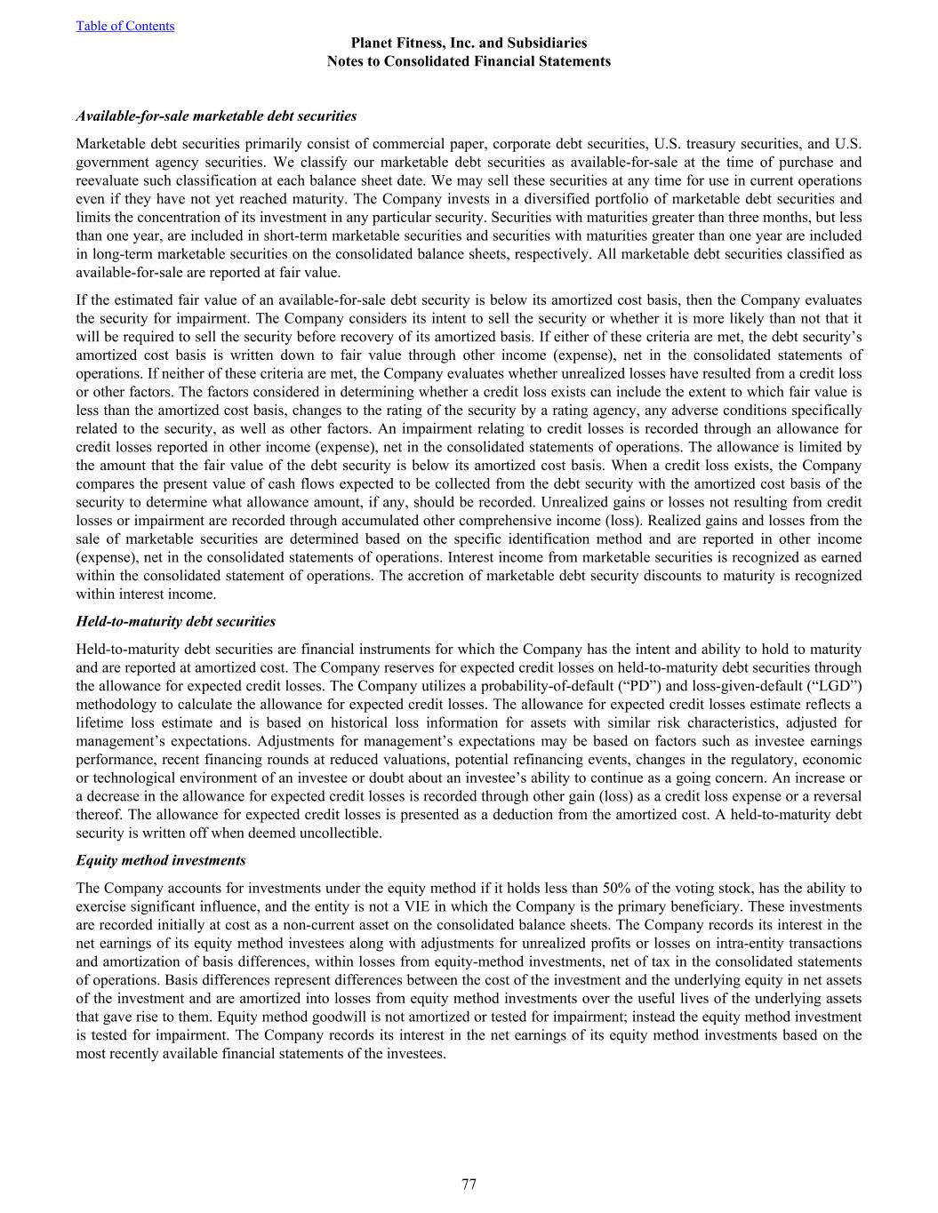 Available-for-sale marketable debt securities Marketable debt securities primarily consist of commercial paper, corporate debt securities, U.S. treasury securities, and U.S. government agency securities. We classify our marketable debt securities as available-for-sale at the time of purchase and reevaluate such classification at each balance sheet date. We may sell these securities at any time for use in current operations even if they have not yet reached maturity. The Company invests in a diversified portfolio of marketable debt securities and limits the concentration of its investment in any particular security. Securities with maturities greater than three months, but less than one year, are included in short-term marketable securities and securities with maturities greater than one year are included in long-term marketable securities on the consolidated balance sheets, respectively. All marketable debt securities classified as available-for-sale are reported at fair value. If the estimated fair value of an available-for-sale debt security is below its amortized cost basis, then the Company evaluates the security for impairment. The Company considers its intent to sell the security or whether it is more likely than not that it will be required to sell the security before recovery of its amortized basis. If either of these criteria are met, the debt security’s amortized cost basis is written down to fair value through other income (expense), net in the consolidated statements of operations. If neither of these criteria are met, the Company evaluates whether unrealized losses have resulted from a credit loss or other factors. The factors considered in determining whether a credit loss exists can include the extent to which fair value is less than the amortized cost basis, changes to the rating of the security by a rating agency, any adverse conditions specifically related to the security, as well as other factors. An impairment relating to credit losses is recorded through an allowance for credit losses reported in other income (expense), net in the consolidated statements of operations. The allowance is limited by the amount that the fair value of the debt security is below its amortized cost basis. When a credit loss exists, the Company compares the present value of cash flows expected to be collected from the debt security with the amortized cost basis of the security to determine what allowance amount, if any, should be recorded. Unrealized gains or losses not resulting from credit losses or impairment are recorded through accumulated other comprehensive income (loss). Realized gains and losses from the sale of marketable securities are determined based on the specific identification method and are reported in other income (expense), net in the consolidated statements of operations. Interest income from marketable securities is recognized as earned within the consolidated statement of operations. The accretion of marketable debt security discounts to maturity is recognized within interest income. Held-to-maturity debt securities Held-to-maturity debt securities are financial instruments for which the Company has the intent and ability to hold to maturity and are reported at amortized cost. The Company reserves for expected credit losses on held-to-maturity debt securities through the allowance for expected credit losses. The Company utilizes a probability-of-default (“PD”) and loss-given-default (“LGD”) methodology to calculate the allowance for expected credit losses. The allowance for expected credit losses estimate reflects a lifetime loss estimate and is based on historical loss information for assets with similar risk characteristics, adjusted for management’s expectations. Adjustments for management’s expectations may be based on factors such as investee earnings performance, recent financing rounds at reduced valuations, potential refinancing events, changes in the regulatory, economic or technological environment of an investee or doubt about an investee’s ability to continue as a going concern. An increase or a decrease in the allowance for expected credit losses is recorded through other gain (loss) as a credit loss expense or a reversal thereof. The allowance for expected credit losses is presented as a deduction from the amortized cost. A held-to-maturity debt security is written off when deemed uncollectible. Equity method investments The Company accounts for investments under the equity method if it holds less than 50% of the voting stock, has the ability to exercise significant influence, and the entity is not a VIE in which the Company is the primary beneficiary. These investments are recorded initially at cost as a non-current asset on the consolidated balance sheets. The Company records its interest in the net earnings of its equity method investees along with adjustments for unrealized profits or losses on intra-entity transactions and amortization of basis differences, within losses from equity-method investments, net of tax in the consolidated statements of operations. Basis differences represent differences between the cost of the investment and the underlying equity in net assets of the investment and are amortized into losses from equity method investments over the useful lives of the underlying assets that gave rise to them. Equity method goodwill is not amortized or tested for impairment; instead the equity method investment is tested for impairment. The Company records its interest in the net earnings of its equity method investments based on the most recently available financial statements of the investees. Table of Contents Planet Fitness, Inc. and Subsidiaries Notes to Consolidated Financial Statements 77