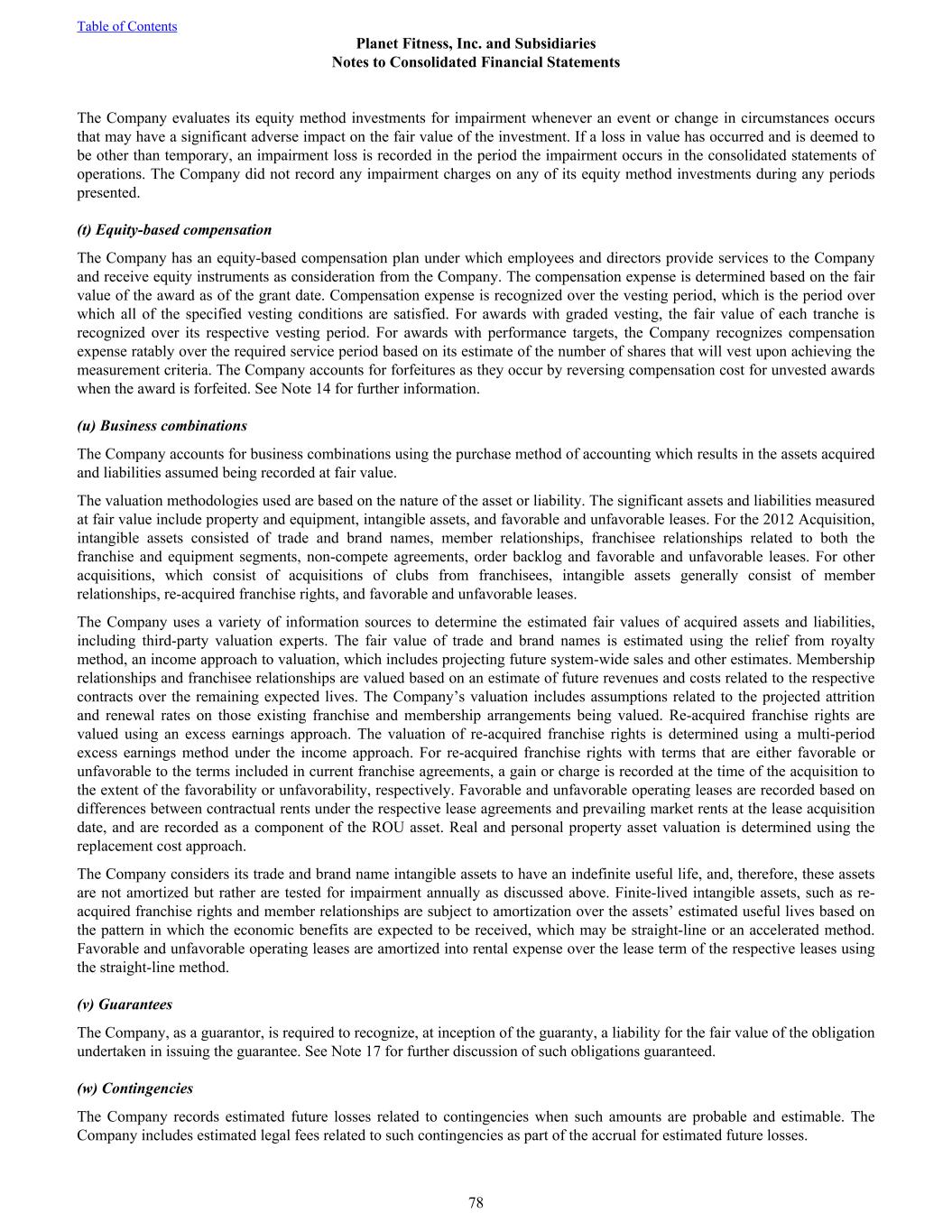 The Company evaluates its equity method investments for impairment whenever an event or change in circumstances occurs that may have a significant adverse impact on the fair value of the investment. If a loss in value has occurred and is deemed to be other than temporary, an impairment loss is recorded in the period the impairment occurs in the consolidated statements of operations. The Company did not record any impairment charges on any of its equity method investments during any periods presented. (t) Equity-based compensation The Company has an equity-based compensation plan under which employees and directors provide services to the Company and receive equity instruments as consideration from the Company. The compensation expense is determined based on the fair value of the award as of the grant date. Compensation expense is recognized over the vesting period, which is the period over which all of the specified vesting conditions are satisfied. For awards with graded vesting, the fair value of each tranche is recognized over its respective vesting period. For awards with performance targets, the Company recognizes compensation expense ratably over the required service period based on its estimate of the number of shares that will vest upon achieving the measurement criteria. The Company accounts for forfeitures as they occur by reversing compensation cost for unvested awards when the award is forfeited. See Note 14 for further information. (u) Business combinations The Company accounts for business combinations using the purchase method of accounting which results in the assets acquired and liabilities assumed being recorded at fair value. The valuation methodologies used are based on the nature of the asset or liability. The significant assets and liabilities measured at fair value include property and equipment, intangible assets, and favorable and unfavorable leases. For the 2012 Acquisition, intangible assets consisted of trade and brand names, member relationships, franchisee relationships related to both the franchise and equipment segments, non-compete agreements, order backlog and favorable and unfavorable leases. For other acquisitions, which consist of acquisitions of clubs from franchisees, intangible assets generally consist of member relationships, re-acquired franchise rights, and favorable and unfavorable leases. The Company uses a variety of information sources to determine the estimated fair values of acquired assets and liabilities, including third-party valuation experts. The fair value of trade and brand names is estimated using the relief from royalty method, an income approach to valuation, which includes projecting future system-wide sales and other estimates. Membership relationships and franchisee relationships are valued based on an estimate of future revenues and costs related to the respective contracts over the remaining expected lives. The Company’s valuation includes assumptions related to the projected attrition and renewal rates on those existing franchise and membership arrangements being valued. Re-acquired franchise rights are valued using an excess earnings approach. The valuation of re-acquired franchise rights is determined using a multi-period excess earnings method under the income approach. For re-acquired franchise rights with terms that are either favorable or unfavorable to the terms included in current franchise agreements, a gain or charge is recorded at the time of the acquisition to the extent of the favorability or unfavorability, respectively. Favorable and unfavorable operating leases are recorded based on differences between contractual rents under the respective lease agreements and prevailing market rents at the lease acquisition date, and are recorded as a component of the ROU asset. Real and personal property asset valuation is determined using the replacement cost approach. The Company considers its trade and brand name intangible assets to have an indefinite useful life, and, therefore, these assets are not amortized but rather are tested for impairment annually as discussed above. Finite-lived intangible assets, such as re- acquired franchise rights and member relationships are subject to amortization over the assets’ estimated useful lives based on the pattern in which the economic benefits are expected to be received, which may be straight-line or an accelerated method. Favorable and unfavorable operating leases are amortized into rental expense over the lease term of the respective leases using the straight-line method. (v) Guarantees The Company, as a guarantor, is required to recognize, at inception of the guaranty, a liability for the fair value of the obligation undertaken in issuing the guarantee. See Note 17 for further discussion of such obligations guaranteed. (w) Contingencies The Company records estimated future losses related to contingencies when such amounts are probable and estimable. The Company includes estimated legal fees related to such contingencies as part of the accrual for estimated future losses. Table of Contents Planet Fitness, Inc. and Subsidiaries Notes to Consolidated Financial Statements 78
