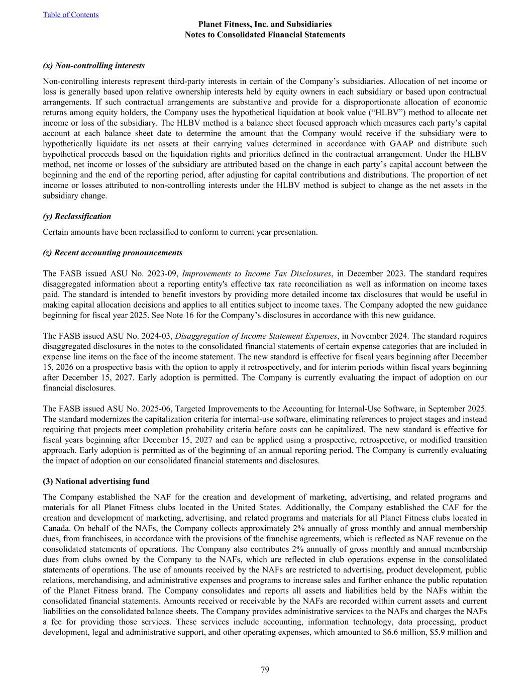 (x) Non-controlling interests Non-controlling interests represent third-party interests in certain of the Company’s subsidiaries. Allocation of net income or loss is generally based upon relative ownership interests held by equity owners in each subsidiary or based upon contractual arrangements. If such contractual arrangements are substantive and provide for a disproportionate allocation of economic returns among equity holders, the Company uses the hypothetical liquidation at book value (“HLBV”) method to allocate net income or loss of the subsidiary. The HLBV method is a balance sheet focused approach which measures each party’s capital account at each balance sheet date to determine the amount that the Company would receive if the subsidiary were to hypothetically liquidate its net assets at their carrying values determined in accordance with GAAP and distribute such hypothetical proceeds based on the liquidation rights and priorities defined in the contractual arrangement. Under the HLBV method, net income or losses of the subsidiary are attributed based on the change in each party’s capital account between the beginning and the end of the reporting period, after adjusting for capital contributions and distributions. The proportion of net income or losses attributed to non-controlling interests under the HLBV method is subject to change as the net assets in the subsidiary change. (y) Reclassification Certain amounts have been reclassified to conform to current year presentation. (z) Recent accounting pronouncements The FASB issued ASU No. 2023-09, Improvements to Income Tax Disclosures, in December 2023. The standard requires disaggregated information about a reporting entity's effective tax rate reconciliation as well as information on income taxes paid. The standard is intended to benefit investors by providing more detailed income tax disclosures that would be useful in making capital allocation decisions and applies to all entities subject to income taxes. The Company adopted the new guidance beginning for fiscal year 2025. See Note 16 for the Company’s disclosures in accordance with this new guidance. The FASB issued ASU No. 2024-03, Disaggregation of Income Statement Expenses, in November 2024. The standard requires disaggregated disclosures in the notes to the consolidated financial statements of certain expense categories that are included in expense line items on the face of the income statement. The new standard is effective for fiscal years beginning after December 15, 2026 on a prospective basis with the option to apply it retrospectively, and for interim periods within fiscal years beginning after December 15, 2027. Early adoption is permitted. The Company is currently evaluating the impact of adoption on our financial disclosures. The FASB issued ASU No. 2025-06, Targeted Improvements to the Accounting for Internal-Use Software, in September 2025. The standard modernizes the capitalization criteria for internal-use software, eliminating references to project stages and instead requiring that projects meet completion probability criteria before costs can be capitalized. The new standard is effective for fiscal years beginning after December 15, 2027 and can be applied using a prospective, retrospective, or modified transition approach. Early adoption is permitted as of the beginning of an annual reporting period. The Company is currently evaluating the impact of adoption on our consolidated financial statements and disclosures. (3) National advertising fund The Company established the NAF for the creation and development of marketing, advertising, and related programs and materials for all Planet Fitness clubs located in the United States. Additionally, the Company established the CAF for the creation and development of marketing, advertising, and related programs and materials for all Planet Fitness clubs located in Canada. On behalf of the NAFs, the Company collects approximately 2% annually of gross monthly and annual membership dues, from franchisees, in accordance with the provisions of the franchise agreements, which is reflected as NAF revenue on the consolidated statements of operations. The Company also contributes 2% annually of gross monthly and annual membership dues from clubs owned by the Company to the NAFs, which are reflected in club operations expense in the consolidated statements of operations. The use of amounts received by the NAFs are restricted to advertising, product development, public relations, merchandising, and administrative expenses and programs to increase sales and further enhance the public reputation of the Planet Fitness brand. The Company consolidates and reports all assets and liabilities held by the NAFs within the consolidated financial statements. Amounts received or receivable by the NAFs are recorded within current assets and current liabilities on the consolidated balance sheets. The Company provides administrative services to the NAFs and charges the NAFs a fee for providing those services. These services include accounting, information technology, data processing, product development, legal and administrative support, and other operating expenses, which amounted to $6.6 million, $5.9 million and Table of Contents Planet Fitness, Inc. and Subsidiaries Notes to Consolidated Financial Statements 79
