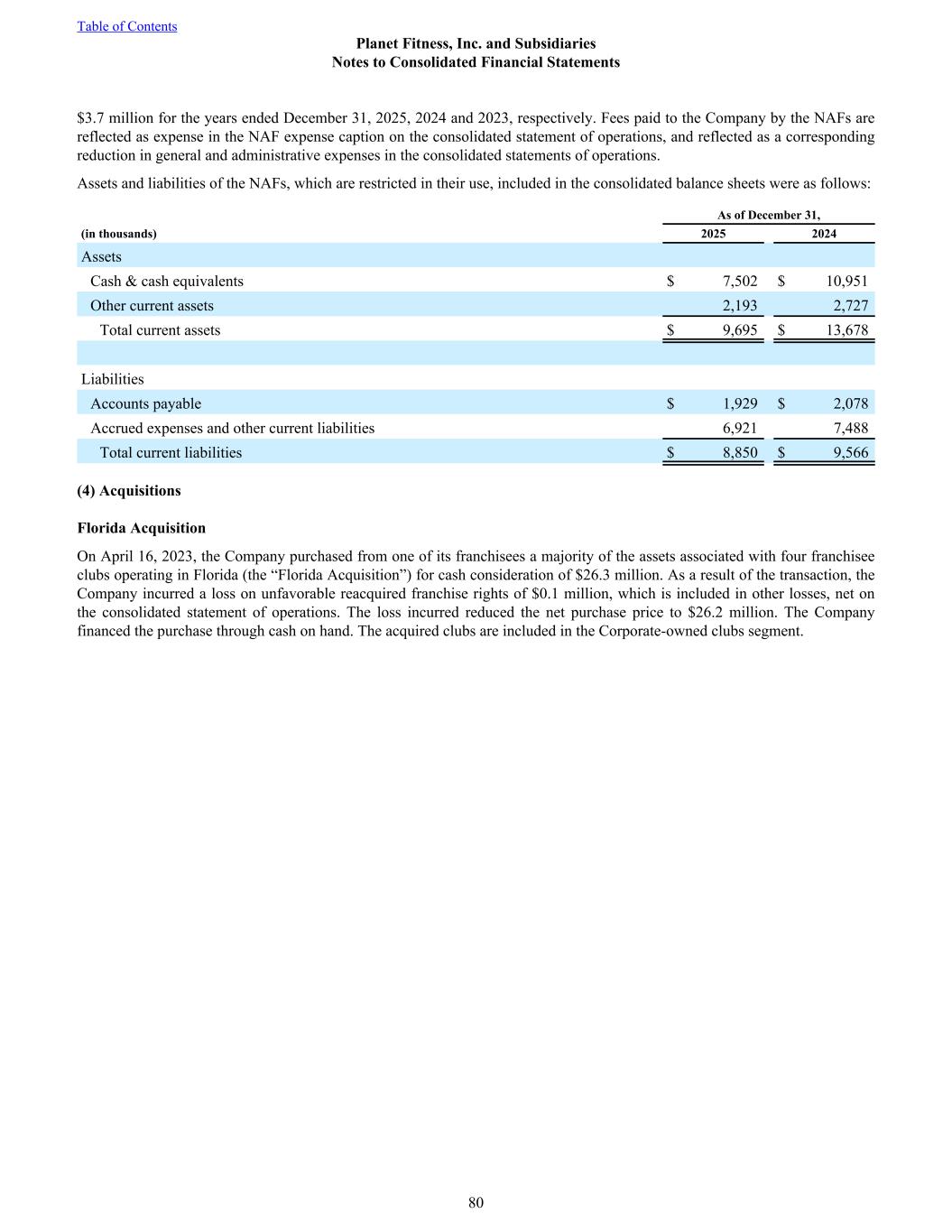 $3.7 million for the years ended December 31, 2025, 2024 and 2023, respectively. Fees paid to the Company by the NAFs are reflected as expense in the NAF expense caption on the consolidated statement of operations, and reflected as a corresponding reduction in general and administrative expenses in the consolidated statements of operations. Assets and liabilities of the NAFs, which are restricted in their use, included in the consolidated balance sheets were as follows: As of December 31, (in thousands) 2025 2024 Assets Cash & cash equivalents $ 7,502 $ 10,951 Other current assets 2,193 2,727 Total current assets $ 9,695 $ 13,678 Liabilities Accounts payable $ 1,929 $ 2,078 Accrued expenses and other current liabilities 6,921 7,488 Total current liabilities $ 8,850 $ 9,566 (4) Acquisitions Florida Acquisition On April 16, 2023, the Company purchased from one of its franchisees a majority of the assets associated with four franchisee clubs operating in Florida (the “Florida Acquisition”) for cash consideration of $26.3 million. As a result of the transaction, the Company incurred a loss on unfavorable reacquired franchise rights of $0.1 million, which is included in other losses, net on the consolidated statement of operations. The loss incurred reduced the net purchase price to $26.2 million. The Company financed the purchase through cash on hand. The acquired clubs are included in the Corporate-owned clubs segment. Table of Contents Planet Fitness, Inc. and Subsidiaries Notes to Consolidated Financial Statements 80