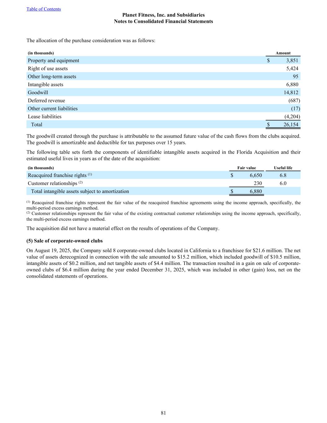 The allocation of the purchase consideration was as follows: (in thousands) Amount Property and equipment $ 3,851 Right of use assets 5,424 Other long-term assets 95 Intangible assets 6,880 Goodwill 14,812 Deferred revenue (687) Other current liabilities (17) Lease liabilities (4,204) Total $ 26,154 The goodwill created through the purchase is attributable to the assumed future value of the cash flows from the clubs acquired. The goodwill is amortizable and deductible for tax purposes over 15 years. The following table sets forth the components of identifiable intangible assets acquired in the Florida Acquisition and their estimated useful lives in years as of the date of the acquisition: (in thousands) Fair value Useful life Reacquired franchise rights (1) $ 6,650 6.8 Customer relationships (2) 230 6.0 Total intangible assets subject to amortization $ 6,880 (1) Reacquired franchise rights represent the fair value of the reacquired franchise agreements using the income approach, specifically, the multi-period excess earnings method. (2) Customer relationships represent the fair value of the existing contractual customer relationships using the income approach, specifically, the multi-period excess earnings method. The acquisition did not have a material effect on the results of operations of the Company. (5) Sale of corporate-owned clubs On August 19, 2025, the Company sold 8 corporate-owned clubs located in California to a franchisee for $21.6 million. The net value of assets derecognized in connection with the sale amounted to $15.2 million, which included goodwill of $10.5 million, intangible assets of $0.2 million, and net tangible assets of $4.4 million. The transaction resulted in a gain on sale of corporate- owned clubs of $6.4 million during the year ended December 31, 2025, which was included in other (gain) loss, net on the consolidated statements of operations. Table of Contents Planet Fitness, Inc. and Subsidiaries Notes to Consolidated Financial Statements 81