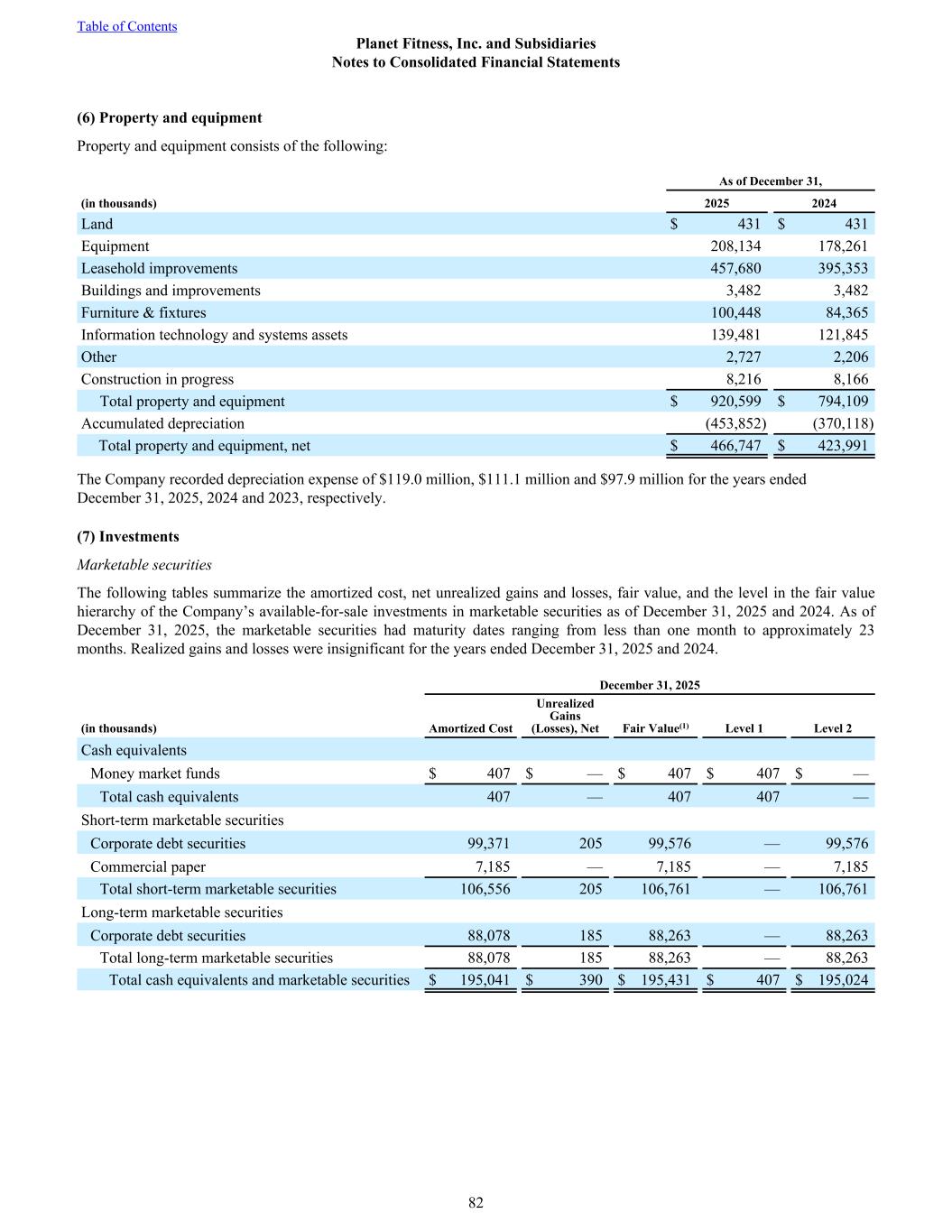 (6) Property and equipment Property and equipment consists of the following: As of December 31, (in thousands) 2025 2024 Land $ 431 $ 431 Equipment 208,134 178,261 Leasehold improvements 457,680 395,353 Buildings and improvements 3,482 3,482 Furniture & fixtures 100,448 84,365 Information technology and systems assets 139,481 121,845 Other 2,727 2,206 Construction in progress 8,216 8,166 Total property and equipment $ 920,599 $ 794,109 Accumulated depreciation (453,852) (370,118) Total property and equipment, net $ 466,747 $ 423,991 The Company recorded depreciation expense of $119.0 million, $111.1 million and $97.9 million for the years ended December 31, 2025, 2024 and 2023, respectively. (7) Investments Marketable securities The following tables summarize the amortized cost, net unrealized gains and losses, fair value, and the level in the fair value hierarchy of the Company’s available-for-sale investments in marketable securities as of December 31, 2025 and 2024. As of December 31, 2025, the marketable securities had maturity dates ranging from less than one month to approximately 23 months. Realized gains and losses were insignificant for the years ended December 31, 2025 and 2024. December 31, 2025 (in thousands) Amortized Cost Unrealized Gains (Losses), Net Fair Value(1) Level 1 Level 2 Cash equivalents Money market funds $ 407 $ — $ 407 $ 407 $ — Total cash equivalents 407 — 407 407 — Short-term marketable securities Corporate debt securities 99,371 205 99,576 — 99,576 Commercial paper 7,185 — 7,185 — 7,185 Total short-term marketable securities 106,556 205 106,761 — 106,761 Long-term marketable securities Corporate debt securities 88,078 185 88,263 — 88,263 Total long-term marketable securities 88,078 185 88,263 — 88,263 Total cash equivalents and marketable securities $ 195,041 $ 390 $ 195,431 $ 407 $ 195,024 Table of Contents Planet Fitness, Inc. and Subsidiaries Notes to Consolidated Financial Statements 82