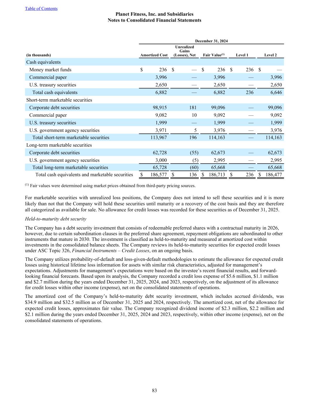 December 31, 2024 (in thousands) Amortized Cost Unrealized Gains (Losses), Net Fair Value(1) Level 1 Level 2 Cash equivalents Money market funds $ 236 $ — $ 236 $ 236 $ — Commercial paper 3,996 — 3,996 — 3,996 U.S. treasury securities 2,650 — 2,650 — 2,650 Total cash equivalents 6,882 — 6,882 236 6,646 Short-term marketable securities Corporate debt securities 98,915 181 99,096 — 99,096 Commercial paper 9,082 10 9,092 — 9,092 U.S. treasury securities 1,999 — 1,999 — 1,999 U.S. government agency securities 3,971 5 3,976 — 3,976 Total short-term marketable securities 113,967 196 114,163 — 114,163 Long-term marketable securities Corporate debt securities 62,728 (55) 62,673 — 62,673 U.S. government agency securities 3,000 (5) 2,995 — 2,995 Total long-term marketable securities 65,728 (60) 65,668 — 65,668 Total cash equivalents and marketable securities $ 186,577 $ 136 $ 186,713 $ 236 $ 186,477 (1) Fair values were determined using market prices obtained from third-party pricing sources. For marketable securities with unrealized loss positions, the Company does not intend to sell these securities and it is more likely than not that the Company will hold these securities until maturity or a recovery of the cost basis and they are therefore all categorized as available for sale. No allowance for credit losses was recorded for these securities as of December 31, 2025. Held-to-maturity debt security The Company has a debt security investment that consists of redeemable preferred shares with a contractual maturity in 2026, however, due to certain subordination clauses in the preferred share agreement, repayment obligations are subordinated to other instruments that mature in 2030. The investment is classified as held-to-maturity and measured at amortized cost within investments in the consolidated balance sheets. The Company reviews its held-to-maturity securities for expected credit losses under ASC Topic 326, Financial Instruments – Credit Losses, on an ongoing basis. The Company utilizes probability-of-default and loss-given-default methodologies to estimate the allowance for expected credit losses using historical lifetime loss information for assets with similar risk characteristics, adjusted for management’s expectations. Adjustments for management’s expectations were based on the investee’s recent financial results, and forward- looking financial forecasts. Based upon its analysis, the Company recorded a credit loss expense of $5.6 million, $1.1 million and $2.7 million during the years ended December 31, 2025, 2024, and 2023, respectively, on the adjustment of its allowance for credit losses within other income (expense), net on the consolidated statements of operations. The amortized cost of the Company’s held-to-maturity debt security investment, which includes accrued dividends, was $34.9 million and $32.5 million as of December 31, 2025 and 2024, respectively. The amortized cost, net of the allowance for expected credit losses, approximates fair value. The Company recognized dividend income of $2.3 million, $2.2 million and $2.1 million during the years ended December 31, 2025, 2024 and 2023, respectively, within other income (expense), net on the consolidated statements of operations. Table of Contents Planet Fitness, Inc. and Subsidiaries Notes to Consolidated Financial Statements 83