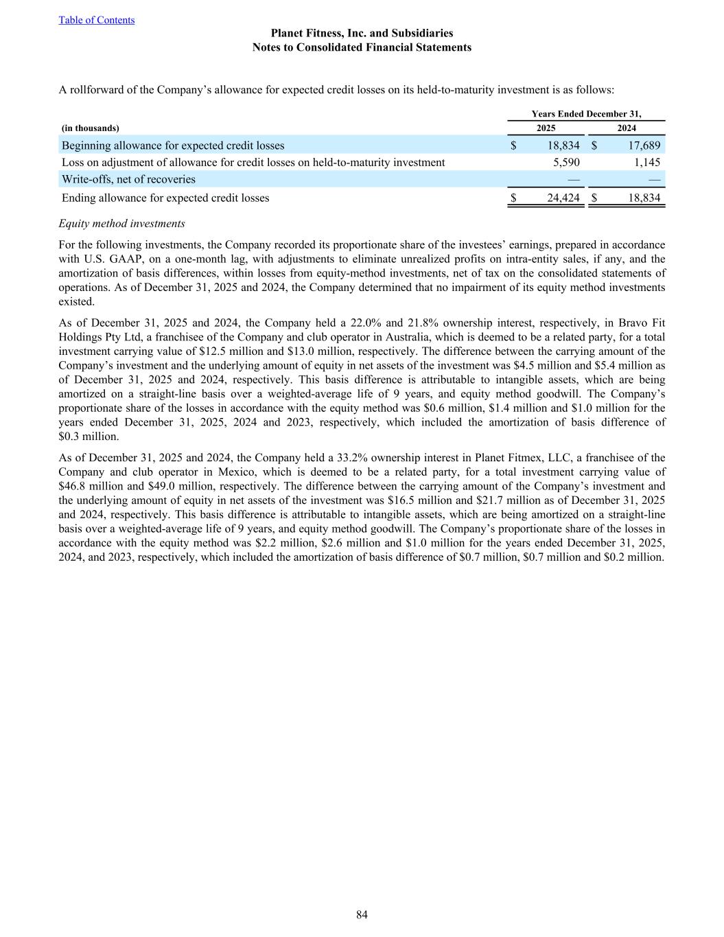 A rollforward of the Company’s allowance for expected credit losses on its held-to-maturity investment is as follows: Years Ended December 31, (in thousands) 2025 2024 Beginning allowance for expected credit losses $ 18,834 $ 17,689 Loss on adjustment of allowance for credit losses on held-to-maturity investment 5,590 1,145 Write-offs, net of recoveries — — Ending allowance for expected credit losses $ 24,424 $ 18,834 Equity method investments For the following investments, the Company recorded its proportionate share of the investees’ earnings, prepared in accordance with U.S. GAAP, on a one-month lag, with adjustments to eliminate unrealized profits on intra-entity sales, if any, and the amortization of basis differences, within losses from equity-method investments, net of tax on the consolidated statements of operations. As of December 31, 2025 and 2024, the Company determined that no impairment of its equity method investments existed. As of December 31, 2025 and 2024, the Company held a 22.0% and 21.8% ownership interest, respectively, in Bravo Fit Holdings Pty Ltd, a franchisee of the Company and club operator in Australia, which is deemed to be a related party, for a total investment carrying value of $12.5 million and $13.0 million, respectively. The difference between the carrying amount of the Company’s investment and the underlying amount of equity in net assets of the investment was $4.5 million and $5.4 million as of December 31, 2025 and 2024, respectively. This basis difference is attributable to intangible assets, which are being amortized on a straight-line basis over a weighted-average life of 9 years, and equity method goodwill. The Company’s proportionate share of the losses in accordance with the equity method was $0.6 million, $1.4 million and $1.0 million for the years ended December 31, 2025, 2024 and 2023, respectively, which included the amortization of basis difference of $0.3 million. As of December 31, 2025 and 2024, the Company held a 33.2% ownership interest in Planet Fitmex, LLC, a franchisee of the Company and club operator in Mexico, which is deemed to be a related party, for a total investment carrying value of $46.8 million and $49.0 million, respectively. The difference between the carrying amount of the Company’s investment and the underlying amount of equity in net assets of the investment was $16.5 million and $21.7 million as of December 31, 2025 and 2024, respectively. This basis difference is attributable to intangible assets, which are being amortized on a straight-line basis over a weighted-average life of 9 years, and equity method goodwill. The Company’s proportionate share of the losses in accordance with the equity method was $2.2 million, $2.6 million and $1.0 million for the years ended December 31, 2025, 2024, and 2023, respectively, which included the amortization of basis difference of $0.7 million, $0.7 million and $0.2 million. Table of Contents Planet Fitness, Inc. and Subsidiaries Notes to Consolidated Financial Statements 84