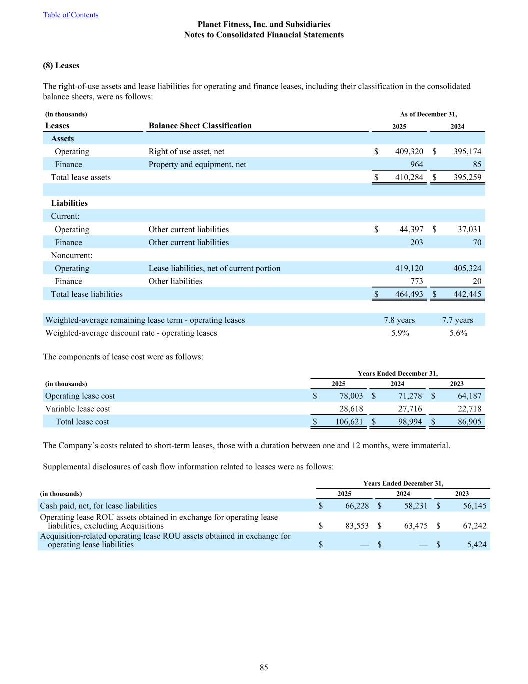 (8) Leases The right-of-use assets and lease liabilities for operating and finance leases, including their classification in the consolidated balance sheets, were as follows: (in thousands) As of December 31, Leases Balance Sheet Classification 2025 2024 Assets Operating Right of use asset, net $ 409,320 $ 395,174 Finance Property and equipment, net 964 85 Total lease assets $ 410,284 $ 395,259 Liabilities Current: Operating Other current liabilities $ 44,397 $ 37,031 Finance Other current liabilities 203 70 Noncurrent: Operating Lease liabilities, net of current portion 419,120 405,324 Finance Other liabilities 773 20 Total lease liabilities $ 464,493 $ 442,445 Weighted-average remaining lease term - operating leases 7.8 years 7.7 years Weighted-average discount rate - operating leases 5.9% 5.6% The components of lease cost were as follows: Years Ended December 31, (in thousands) 2025 2024 2023 Operating lease cost $ 78,003 $ 71,278 $ 64,187 Variable lease cost 28,618 27,716 22,718 Total lease cost $ 106,621 $ 98,994 $ 86,905 The Company’s costs related to short-term leases, those with a duration between one and 12 months, were immaterial. Supplemental disclosures of cash flow information related to leases were as follows: Years Ended December 31, (in thousands) 2025 2024 2023 Cash paid, net, for lease liabilities $ 66,228 $ 58,231 $ 56,145 Operating lease ROU assets obtained in exchange for operating lease liabilities, excluding Acquisitions $ 83,553 $ 63,475 $ 67,242 Acquisition-related operating lease ROU assets obtained in exchange for operating lease liabilities $ — $ — $ 5,424 Table of Contents Planet Fitness, Inc. and Subsidiaries Notes to Consolidated Financial Statements 85