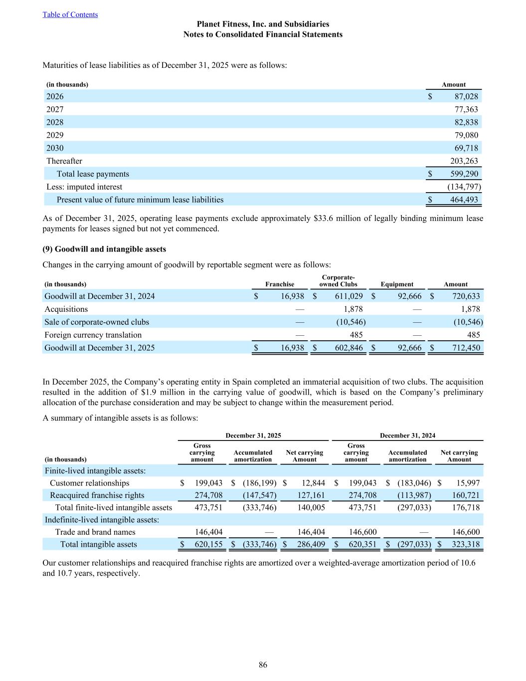 Maturities of lease liabilities as of December 31, 2025 were as follows: (in thousands) Amount 2026 $ 87,028 2027 77,363 2028 82,838 2029 79,080 2030 69,718 Thereafter 203,263 Total lease payments $ 599,290 Less: imputed interest (134,797) Present value of future minimum lease liabilities $ 464,493 As of December 31, 2025, operating lease payments exclude approximately $33.6 million of legally binding minimum lease payments for leases signed but not yet commenced. (9) Goodwill and intangible assets Changes in the carrying amount of goodwill by reportable segment were as follows: (in thousands) Franchise Corporate- owned Clubs Equipment Amount Goodwill at December 31, 2024 $ 16,938 $ 611,029 $ 92,666 $ 720,633 Acquisitions — 1,878 — 1,878 Sale of corporate-owned clubs — (10,546) — (10,546) Foreign currency translation — 485 — 485 Goodwill at December 31, 2025 $ 16,938 $ 602,846 $ 92,666 $ 712,450 In December 2025, the Company’s operating entity in Spain completed an immaterial acquisition of two clubs. The acquisition resulted in the addition of $1.9 million in the carrying value of goodwill, which is based on the Company’s preliminary allocation of the purchase consideration and may be subject to change within the measurement period. A summary of intangible assets is as follows: December 31, 2025 December 31, 2024 (in thousands) Gross carrying amount Accumulated amortization Net carrying Amount Gross carrying amount Accumulated amortization Net carrying Amount Finite-lived intangible assets: Customer relationships $ 199,043 $ (186,199) $ 12,844 $ 199,043 $ (183,046) $ 15,997 Reacquired franchise rights 274,708 (147,547) 127,161 274,708 (113,987) 160,721 Total finite-lived intangible assets 473,751 (333,746) 140,005 473,751 (297,033) 176,718 Indefinite-lived intangible assets: Trade and brand names 146,404 — 146,404 146,600 — 146,600 Total intangible assets $ 620,155 $ (333,746) $ 286,409 $ 620,351 $ (297,033) $ 323,318 Our customer relationships and reacquired franchise rights are amortized over a weighted-average amortization period of 10.6 and 10.7 years, respectively. Table of Contents Planet Fitness, Inc. and Subsidiaries Notes to Consolidated Financial Statements 86