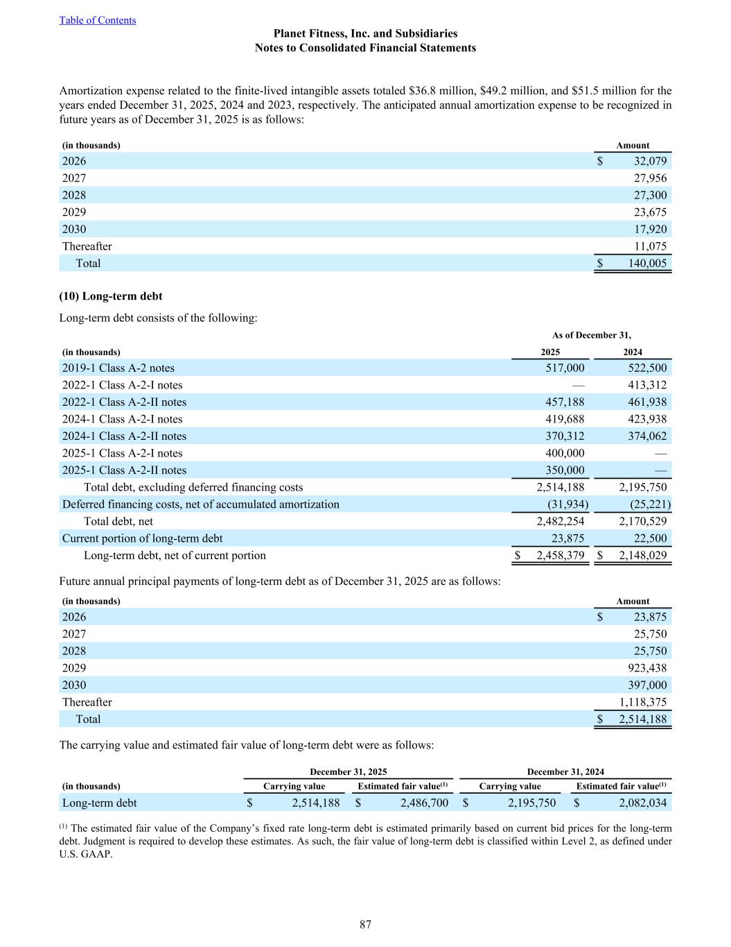Amortization expense related to the finite-lived intangible assets totaled $36.8 million, $49.2 million, and $51.5 million for the years ended December 31, 2025, 2024 and 2023, respectively. The anticipated annual amortization expense to be recognized in future years as of December 31, 2025 is as follows: (in thousands) Amount 2026 $ 32,079 2027 27,956 2028 27,300 2029 23,675 2030 17,920 Thereafter 11,075 Total $ 140,005 (10) Long-term debt Long-term debt consists of the following: As of December 31, (in thousands) 2025 2024 2019-1 Class A-2 notes 517,000 522,500 2022-1 Class A-2-I notes — 413,312 2022-1 Class A-2-II notes 457,188 461,938 2024-1 Class A-2-I notes 419,688 423,938 2024-1 Class A-2-II notes 370,312 374,062 2025-1 Class A-2-I notes 400,000 — 2025-1 Class A-2-II notes 350,000 — Total debt, excluding deferred financing costs 2,514,188 2,195,750 Deferred financing costs, net of accumulated amortization (31,934) (25,221) Total debt, net 2,482,254 2,170,529 Current portion of long-term debt 23,875 22,500 Long-term debt, net of current portion $ 2,458,379 $ 2,148,029 Future annual principal payments of long-term debt as of December 31, 2025 are as follows: (in thousands) Amount 2026 $ 23,875 2027 25,750 2028 25,750 2029 923,438 2030 397,000 Thereafter 1,118,375 Total $ 2,514,188 The carrying value and estimated fair value of long-term debt were as follows: December 31, 2025 December 31, 2024 (in thousands) Carrying value Estimated fair value(1) Carrying value Estimated fair value(1) Long-term debt $ 2,514,188 $ 2,486,700 $ 2,195,750 $ 2,082,034 (1) The estimated fair value of the Company’s fixed rate long-term debt is estimated primarily based on current bid prices for the long-term debt. Judgment is required to develop these estimates. As such, the fair value of long-term debt is classified within Level 2, as defined under U.S. GAAP. Table of Contents Planet Fitness, Inc. and Subsidiaries Notes to Consolidated Financial Statements 87