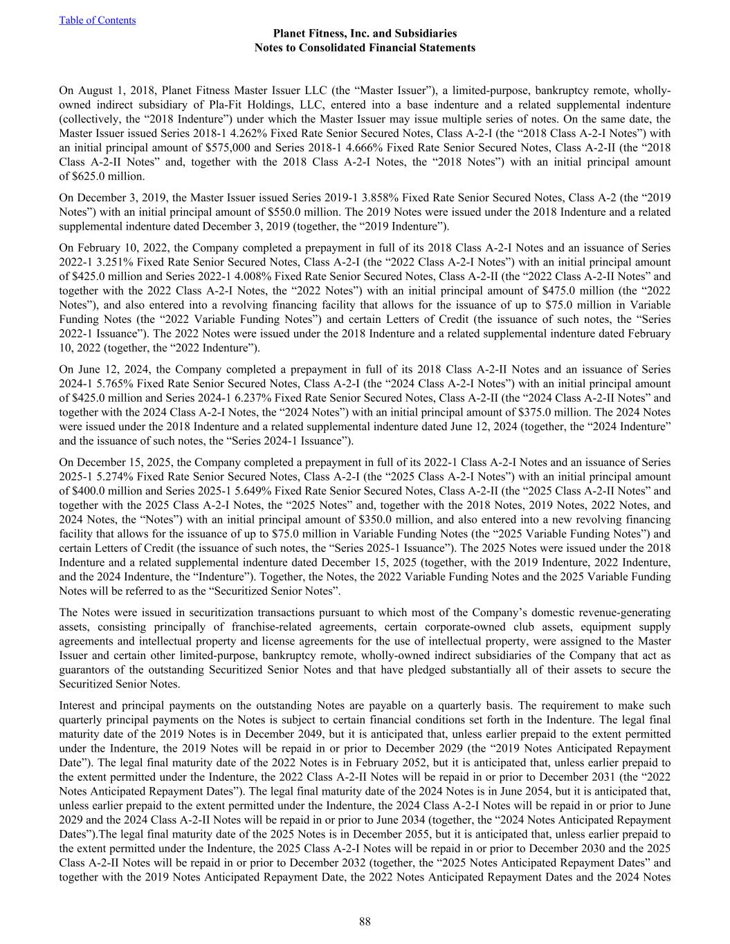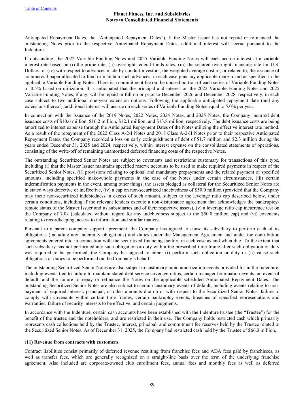 Anticipated Repayment Dates, the “Anticipated Repayment Dates”). If the Master Issuer has not repaid or refinanced the outstanding Notes prior to the respective Anticipated Repayment Dates, additional interest will accrue pursuant to the Indenture. If outstanding, the 2022 Variable Funding Notes and 2025 Variable Funding Notes will each accrue interest at a variable interest rate based on (i) the prime rate, (ii) overnight federal funds rates, (iii) the secured overnight financing rate for U.S. Dollars, or (iv) with respect to advances made by conduit investors, the weighted average cost of, or related to, the issuance of commercial paper allocated to fund or maintain such advances, in each case plus any applicable margin and as specified in the applicable Variable Funding Notes. There is a commitment fee on the unused portion of each series of Variable Funding Notes of 0.5% based on utilization. It is anticipated that the principal and interest on the 2022 Variable Funding Notes and 2025 Variable Funding Notes, if any, will be repaid in full on or prior to December 2026 and December 2028, respectively, in each case subject to two additional one-year extension options. Following the applicable anticipated repayment date (and any extensions thereof), additional interest will accrue on each series of Variable Funding Notes equal to 5.0% per year. In connection with the issuance of the 2019 Notes, 2022 Notes, 2024 Notes, and 2025 Notes, the Company incurred debt issuance costs of $10.6 million, $16.2 million, $12.1 million, and $13.8 million, respectively. The debt issuance costs are being amortized to interest expense through the Anticipated Repayment Dates of the Notes utilizing the effective interest rate method. As a result of the repayment of the 2022 Class A-2-I Notes and 2018 Class A-2-II Notes prior to their respective Anticipated Repayment Dates, the Company recorded a loss on early extinguishment of debt of $1.7 million and $2.3 million during the years ended December 31, 2025 and 2024, respectively, within interest expense on the consolidated statements of operations, consisting of the write-off of remaining unamortized deferred financing costs of the respective Notes. The outstanding Securitized Senior Notes are subject to covenants and restrictions customary for transactions of this type, including (i) that the Master Issuer maintains specified reserve accounts to be used to make required payments in respect of the Securitized Senior Notes, (ii) provisions relating to optional and mandatory prepayments and the related payment of specified amounts, including specified make-whole payments in the case of the Notes under certain circumstances, (iii) certain indemnification payments in the event, among other things, the assets pledged as collateral for the Securitized Senior Notes are in stated ways defective or ineffective, (iv) a cap on non-securitized indebtedness of $50.0 million (provided that the Company may incur non-securitized indebtedness in excess of such amount, subject to the leverage ratio cap described below, under certain conditions, including if the relevant lenders execute a non-disturbance agreement that acknowledges the bankruptcy- remote status of the Master Issuer and its subsidiaries and of their respective assets), (v) a leverage ratio cap incurrence test on the Company of 7.0x (calculated without regard for any indebtedness subject to the $50.0 million cap) and (vi) covenants relating to recordkeeping, access to information and similar matters. Pursuant to a parent company support agreement, the Company has agreed to cause its subsidiary to perform each of its obligations (including any indemnity obligations) and duties under the Management Agreement and under the contribution agreements entered into in connection with the securitized financing facility, in each case as and when due. To the extent that such subsidiary has not performed any such obligation or duty within the prescribed time frame after such obligation or duty was required to be performed, the Company has agreed to either (i) perform such obligation or duty or (ii) cause such obligations or duties to be performed on the Company’s behalf. The outstanding Securitized Senior Notes are also subject to customary rapid amortization events provided for in the Indenture, including events tied to failure to maintain stated debt service coverage ratios, certain manager termination events, an event of default, and the failure to repay or refinance the Notes on the applicable scheduled Anticipated Repayment Dates. The outstanding Securitized Senior Notes are also subject to certain customary events of default, including events relating to non- payment of required interest, principal, or other amounts due on or with respect to the Securitized Senior Notes, failure to comply with covenants within certain time frames, certain bankruptcy events, breaches of specified representations and warranties, failure of security interests to be effective, and certain judgments. In accordance with the Indenture, certain cash accounts have been established with the Indenture trustee (the “Trustee”) for the benefit of the trustee and the noteholders, and are restricted in their use. The Company holds restricted cash which primarily represents cash collections held by the Trustee, interest, principal, and commitment fee reserves held by the Trustee related to the Securitized Senior Notes. As of December 31, 2025, the Company had restricted cash held by the Trustee of $66.3 million. (11) Revenue from contracts with customers Contract liabilities consist primarily of deferred revenue resulting from franchise fees and ADA fees paid by franchisees, as well as transfer fees, which are generally recognized on a straight-line basis over the term of the underlying franchise agreement. Also included are corporate-owned club enrollment fees, annual fees and monthly fees as well as deferred Table of Contents Planet Fitness, 