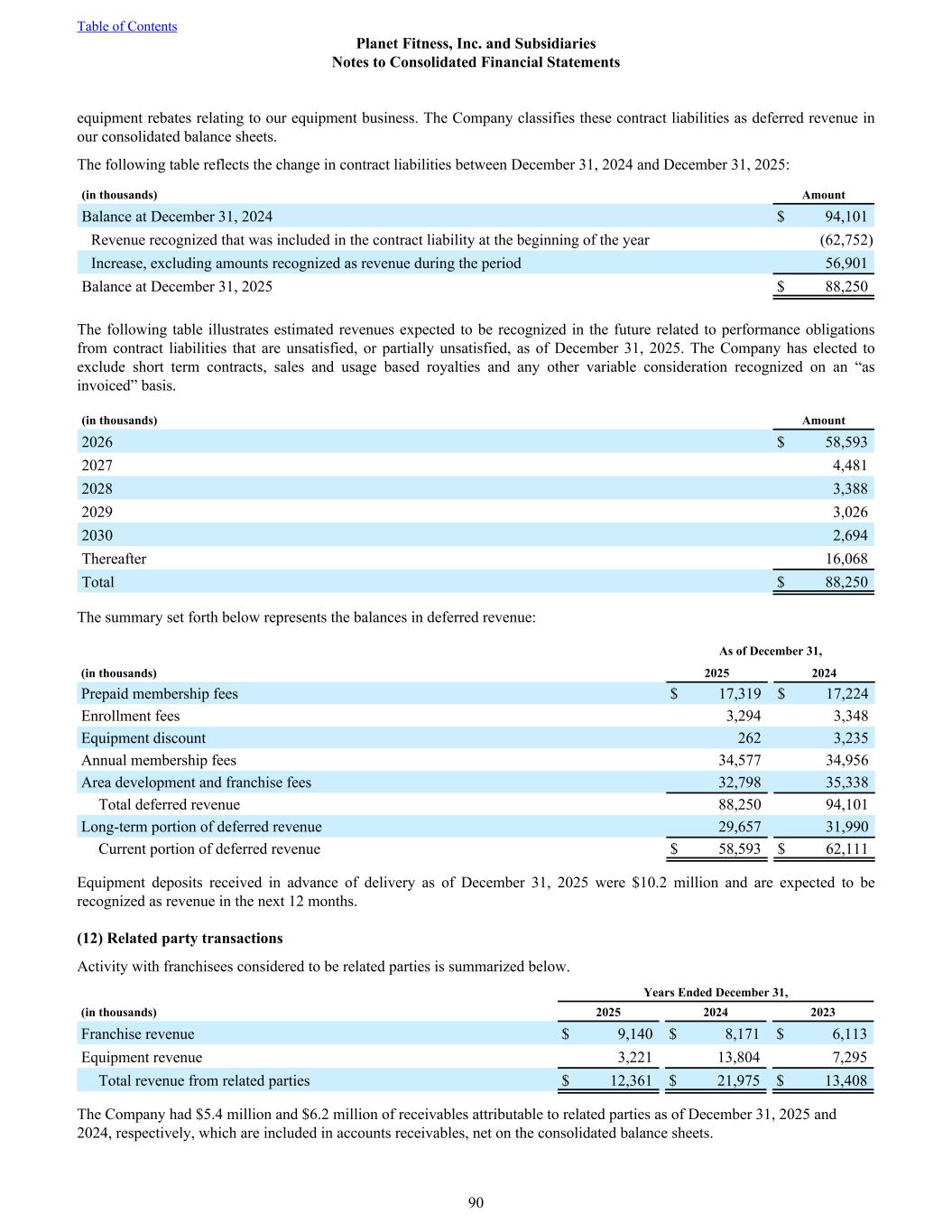 equipment rebates relating to our equipment business. The Company classifies these contract liabilities as deferred revenue in our consolidated balance sheets. The following table reflects the change in contract liabilities between December 31, 2024 and December 31, 2025: (in thousands) Amount Balance at December 31, 2024 $ 94,101 Revenue recognized that was included in the contract liability at the beginning of the year (62,752) Increase, excluding amounts recognized as revenue during the period 56,901 Balance at December 31, 2025 $ 88,250 The following table illustrates estimated revenues expected to be recognized in the future related to performance obligations from contract liabilities that are unsatisfied, or partially unsatisfied, as of December 31, 2025. The Company has elected to exclude short term contracts, sales and usage based royalties and any other variable consideration recognized on an “as invoiced” basis. (in thousands) Amount 2026 $ 58,593 2027 4,481 2028 3,388 2029 3,026 2030 2,694 Thereafter 16,068 Total $ 88,250 The summary set forth below represents the balances in deferred revenue: As of December 31, (in thousands) 2025 2024 Prepaid membership fees $ 17,319 $ 17,224 Enrollment fees 3,294 3,348 Equipment discount 262 3,235 Annual membership fees 34,577 34,956 Area development and franchise fees 32,798 35,338 Total deferred revenue 88,250 94,101 Long-term portion of deferred revenue 29,657 31,990 Current portion of deferred revenue $ 58,593 $ 62,111 Equipment deposits received in advance of delivery as of December 31, 2025 were $10.2 million and are expected to be recognized as revenue in the next 12 months. (12) Related party transactions Activity with franchisees considered to be related parties is summarized below. Years Ended December 31, (in thousands) 2025 2024 2023 Franchise revenue $ 9,140 $ 8,171 $ 6,113 Equipment revenue 3,221 13,804 7,295 Total revenue from related parties $ 12,361 $ 21,975 $ 13,408 The Company had $5.4 million and $6.2 million of receivables attributable to related parties as of December 31, 2025 and 2024, respectively, which are included in accounts receivables, net on the consolidated balance sheets. Table of Contents Planet Fitness, Inc. and Subsidiaries Notes to Consolidated Financial Statements 90