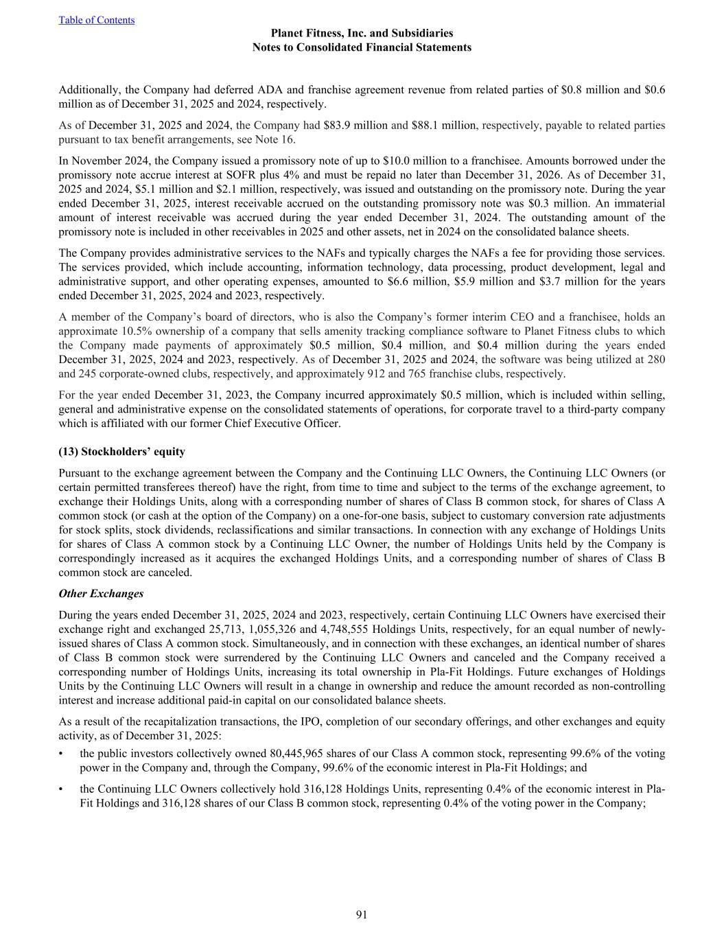 Additionally, the Company had deferred ADA and franchise agreement revenue from related parties of $0.8 million and $0.6 million as of December 31, 2025 and 2024, respectively. As of December 31, 2025 and 2024, the Company had $83.9 million and $88.1 million, respectively, payable to related parties pursuant to tax benefit arrangements, see Note 16. In November 2024, the Company issued a promissory note of up to $10.0 million to a franchisee. Amounts borrowed under the promissory note accrue interest at SOFR plus 4% and must be repaid no later than December 31, 2026. As of December 31, 2025 and 2024, $5.1 million and $2.1 million, respectively, was issued and outstanding on the promissory note. During the year ended December 31, 2025, interest receivable accrued on the outstanding promissory note was $0.3 million. An immaterial amount of interest receivable was accrued during the year ended December 31, 2024. The outstanding amount of the promissory note is included in other receivables in 2025 and other assets, net in 2024 on the consolidated balance sheets. The Company provides administrative services to the NAFs and typically charges the NAFs a fee for providing those services. The services provided, which include accounting, information technology, data processing, product development, legal and administrative support, and other operating expenses, amounted to $6.6 million, $5.9 million and $3.7 million for the years ended December 31, 2025, 2024 and 2023, respectively. A member of the Company’s board of directors, who is also the Company’s former interim CEO and a franchisee, holds an approximate 10.5% ownership of a company that sells amenity tracking compliance software to Planet Fitness clubs to which the Company made payments of approximately $0.5 million, $0.4 million, and $0.4 million during the years ended December 31, 2025, 2024 and 2023, respectively. As of December 31, 2025 and 2024, the software was being utilized at 280 and 245 corporate-owned clubs, respectively, and approximately 912 and 765 franchise clubs, respectively. For the year ended December 31, 2023, the Company incurred approximately $0.5 million, which is included within selling, general and administrative expense on the consolidated statements of operations, for corporate travel to a third-party company which is affiliated with our former Chief Executive Officer. (13) Stockholders’ equity Pursuant to the exchange agreement between the Company and the Continuing LLC Owners, the Continuing LLC Owners (or certain permitted transferees thereof) have the right, from time to time and subject to the terms of the exchange agreement, to exchange their Holdings Units, along with a corresponding number of shares of Class B common stock, for shares of Class A common stock (or cash at the option of the Company) on a one-for-one basis, subject to customary conversion rate adjustments for stock splits, stock dividends, reclassifications and similar transactions. In connection with any exchange of Holdings Units for shares of Class A common stock by a Continuing LLC Owner, the number of Holdings Units held by the Company is correspondingly increased as it acquires the exchanged Holdings Units, and a corresponding number of shares of Class B common stock are canceled. Other Exchanges During the years ended December 31, 2025, 2024 and 2023, respectively, certain Continuing LLC Owners have exercised their exchange right and exchanged 25,713, 1,055,326 and 4,748,555 Holdings Units, respectively, for an equal number of newly- issued shares of Class A common stock. Simultaneously, and in connection with these exchanges, an identical number of shares of Class B common stock were surrendered by the Continuing LLC Owners and canceled and the Company received a corresponding number of Holdings Units, increasing its total ownership in Pla-Fit Holdings. Future exchanges of Holdings Units by the Continuing LLC Owners will result in a change in ownership and reduce the amount recorded as non-controlling interest and increase additional paid-in capital on our consolidated balance sheets. As a result of the recapitalization transactions, the IPO, completion of our secondary offerings, and other exchanges and equity activity, as of December 31, 2025: • the public investors collectively owned 80,445,965 shares of our Class A common stock, representing 99.6% of the voting power in the Company and, through the Company, 99.6% of the economic interest in Pla-Fit Holdings; and • the Continuing LLC Owners collectively hold 316,128 Holdings Units, representing 0.4% of the economic interest in Pla- Fit Holdings and 316,128 shares of our Class B common stock, representing 0.4% of the voting power in the Company; Table of Contents Planet Fitness, Inc. and Subsidiaries Notes to Consolidated Financial Statements 91