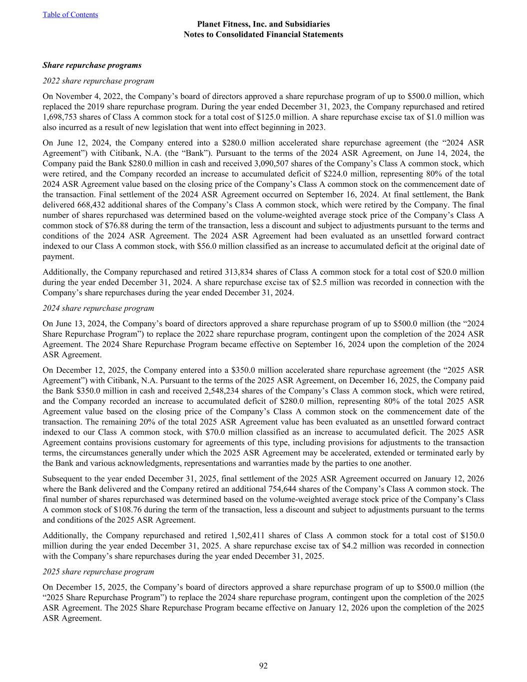 Share repurchase programs 2022 share repurchase program On November 4, 2022, the Company’s board of directors approved a share repurchase program of up to $500.0 million, which replaced the 2019 share repurchase program. During the year ended December 31, 2023, the Company repurchased and retired 1,698,753 shares of Class A common stock for a total cost of $125.0 million. A share repurchase excise tax of $1.0 million was also incurred as a result of new legislation that went into effect beginning in 2023. On June 12, 2024, the Company entered into a $280.0 million accelerated share repurchase agreement (the “2024 ASR Agreement”) with Citibank, N.A. (the “Bank”). Pursuant to the terms of the 2024 ASR Agreement, on June 14, 2024, the Company paid the Bank $280.0 million in cash and received 3,090,507 shares of the Company’s Class A common stock, which were retired, and the Company recorded an increase to accumulated deficit of $224.0 million, representing 80% of the total 2024 ASR Agreement value based on the closing price of the Company’s Class A common stock on the commencement date of the transaction. Final settlement of the 2024 ASR Agreement occurred on September 16, 2024. At final settlement, the Bank delivered 668,432 additional shares of the Company’s Class A common stock, which were retired by the Company. The final number of shares repurchased was determined based on the volume-weighted average stock price of the Company’s Class A common stock of $76.88 during the term of the transaction, less a discount and subject to adjustments pursuant to the terms and conditions of the 2024 ASR Agreement. The 2024 ASR Agreement had been evaluated as an unsettled forward contract indexed to our Class A common stock, with $56.0 million classified as an increase to accumulated deficit at the original date of payment. Additionally, the Company repurchased and retired 313,834 shares of Class A common stock for a total cost of $20.0 million during the year ended December 31, 2024. A share repurchase excise tax of $2.5 million was recorded in connection with the Company’s share repurchases during the year ended December 31, 2024. 2024 share repurchase program On June 13, 2024, the Company’s board of directors approved a share repurchase program of up to $500.0 million (the “2024 Share Repurchase Program”) to replace the 2022 share repurchase program, contingent upon the completion of the 2024 ASR Agreement. The 2024 Share Repurchase Program became effective on September 16, 2024 upon the completion of the 2024 ASR Agreement. On December 12, 2025, the Company entered into a $350.0 million accelerated share repurchase agreement (the “2025 ASR Agreement”) with Citibank, N.A. Pursuant to the terms of the 2025 ASR Agreement, on December 16, 2025, the Company paid the Bank $350.0 million in cash and received 2,548,234 shares of the Company’s Class A common stock, which were retired, and the Company recorded an increase to accumulated deficit of $280.0 million, representing 80% of the total 2025 ASR Agreement value based on the closing price of the Company’s Class A common stock on the commencement date of the transaction. The remaining 20% of the total 2025 ASR Agreement value has been evaluated as an unsettled forward contract indexed to our Class A common stock, with $70.0 million classified as an increase to accumulated deficit. The 2025 ASR Agreement contains provisions customary for agreements of this type, including provisions for adjustments to the transaction terms, the circumstances generally under which the 2025 ASR Agreement may be accelerated, extended or terminated early by the Bank and various acknowledgments, representations and warranties made by the parties to one another. Subsequent to the year ended December 31, 2025, final settlement of the 2025 ASR Agreement occurred on January 12, 2026 where the Bank delivered and the Company retired an additional 754,644 shares of the Company’s Class A common stock. The final number of shares repurchased was determined based on the volume-weighted average stock price of the Company’s Class A common stock of $108.76 during the term of the transaction, less a discount and subject to adjustments pursuant to the terms and conditions of the 2025 ASR Agreement. Additionally, the Company repurchased and retired 1,502,411 shares of Class A common stock for a total cost of $150.0 million during the year ended December 31, 2025. A share repurchase excise tax of $4.2 million was recorded in connection with the Company’s share repurchases during the year ended December 31, 2025. 2025 share repurchase program On December 15, 2025, the Company’s board of directors approved a share repurchase program of up to $500.0 million (the “2025 Share Repurchase Program”) to replace the 2024 share repurchase program, contingent upon the completion of the 2025 ASR Agreement. The 2025 Share Repurchase Program became effective on January 12, 2026 upon the completion of the 2025 ASR Agreement. Table of Contents Planet Fitness, Inc. and Subsidiaries Notes to Consolidated Financial Statements 92