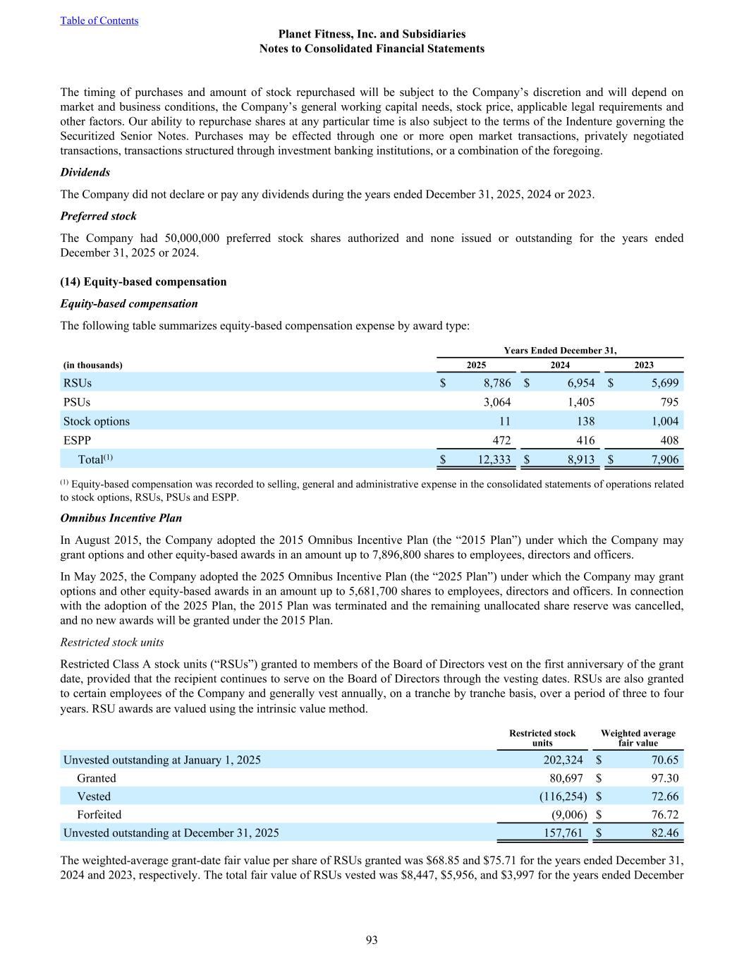The timing of purchases and amount of stock repurchased will be subject to the Company’s discretion and will depend on market and business conditions, the Company’s general working capital needs, stock price, applicable legal requirements and other factors. Our ability to repurchase shares at any particular time is also subject to the terms of the Indenture governing the Securitized Senior Notes. Purchases may be effected through one or more open market transactions, privately negotiated transactions, transactions structured through investment banking institutions, or a combination of the foregoing. Dividends The Company did not declare or pay any dividends during the years ended December 31, 2025, 2024 or 2023. Preferred stock The Company had 50,000,000 preferred stock shares authorized and none issued or outstanding for the years ended December 31, 2025 or 2024. (14) Equity-based compensation Equity-based compensation The following table summarizes equity-based compensation expense by award type: Years Ended December 31, (in thousands) 2025 2024 2023 RSUs $ 8,786 $ 6,954 $ 5,699 PSUs 3,064 1,405 795 Stock options 11 138 1,004 ESPP 472 416 408 Total(1) $ 12,333 $ 8,913 $ 7,906 (1) Equity-based compensation was recorded to selling, general and administrative expense in the consolidated statements of operations related to stock options, RSUs, PSUs and ESPP. Omnibus Incentive Plan In August 2015, the Company adopted the 2015 Omnibus Incentive Plan (the “2015 Plan”) under which the Company may grant options and other equity-based awards in an amount up to 7,896,800 shares to employees, directors and officers. In May 2025, the Company adopted the 2025 Omnibus Incentive Plan (the “2025 Plan”) under which the Company may grant options and other equity-based awards in an amount up to 5,681,700 shares to employees, directors and officers. In connection with the adoption of the 2025 Plan, the 2015 Plan was terminated and the remaining unallocated share reserve was cancelled, and no new awards will be granted under the 2015 Plan. Restricted stock units Restricted Class A stock units (“RSUs”) granted to members of the Board of Directors vest on the first anniversary of the grant date, provided that the recipient continues to serve on the Board of Directors through the vesting dates. RSUs are also granted to certain employees of the Company and generally vest annually, on a tranche by tranche basis, over a period of three to four years. RSU awards are valued using the intrinsic value method. Restricted stock units Weighted average fair value Unvested outstanding at January 1, 2025 202,324 $ 70.65 Granted 80,697 $ 97.30 Vested (116,254) $ 72.66 Forfeited (9,006) $ 76.72 Unvested outstanding at December 31, 2025 157,761 $ 82.46 The weighted-average grant-date fair value per share of RSUs granted was $68.85 and $75.71 for the years ended December 31, 2024 and 2023, respectively. The total fair value of RSUs vested was $8,447, $5,956, and $3,997 for the years ended December Table of Contents Planet Fitness, Inc. and Subsidiaries Notes to Consolidated Financial Statements 93