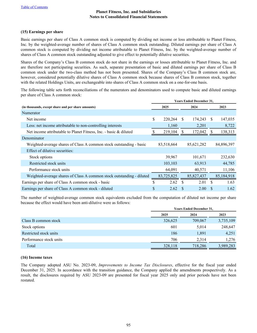 (15) Earnings per share Basic earnings per share of Class A common stock is computed by dividing net income or loss attributable to Planet Fitness, Inc. by the weighted-average number of shares of Class A common stock outstanding. Diluted earnings per share of Class A common stock is computed by dividing net income attributable to Planet Fitness, Inc. by the weighted-average number of shares of Class A common stock outstanding adjusted to give effect to potentially dilutive securities. Shares of the Company’s Class B common stock do not share in the earnings or losses attributable to Planet Fitness, Inc. and are therefore not participating securities. As such, separate presentation of basic and diluted earnings per share of Class B common stock under the two-class method has not been presented. Shares of the Company’s Class B common stock are, however, considered potentially dilutive shares of Class A common stock because shares of Class B common stock, together with the related Holdings Units, are exchangeable into shares of Class A common stock on a one-for-one basis. The following table sets forth reconciliations of the numerators and denominators used to compute basic and diluted earnings per share of Class A common stock: Years Ended December 31, (in thousands, except share and per share amounts) 2025 2024 2023 Numerator Net income $ 220,264 $ 174,243 $ 147,035 Less: net income attributable to non-controlling interests 1,160 2,201 8,722 Net income attributable to Planet Fitness, Inc. - basic & diluted $ 219,104 $ 172,042 $ 138,313 Denominator Weighted-average shares of Class A common stock outstanding - basic 83,518,664 85,621,282 84,896,397 Effect of dilutive securities: Stock options 39,967 101,671 232,630 Restricted stock units 103,103 63,913 44,785 Performance stock units 64,091 40,571 11,106 Weighted-average shares of Class A common stock outstanding - diluted 83,725,825 85,827,437 85,184,918 Earnings per share of Class A common stock - basic $ 2.62 $ 2.01 $ 1.63 Earnings per share of Class A common stock - diluted $ 2.62 $ 2.00 $ 1.62 The number of weighted-average common stock equivalents excluded from the computation of diluted net income per share because the effect would have been anti-dilutive were as follows: Years Ended December 31, 2025 2024 2023 Class B common stock 326,625 709,067 3,735,109 Stock options 601 5,014 248,647 Restricted stock units 186 1,891 4,251 Performance stock units 706 2,314 1,276 Total 328,118 718,286 3,989,283 (16) Income taxes The Company adopted ASU No. 2023-09, Improvements to Income Tax Disclosures, effective for the fiscal year ended December 31, 2025. In accordance with the transition guidance, the Company applied the amendments prospectively. As a result, the disclosures required by ASU 2023-09 are presented for fiscal year 2025 only and prior periods have not been restated. Table of Contents Planet Fitness, Inc. and Subsidiaries Notes to Consolidated Financial Statements 95