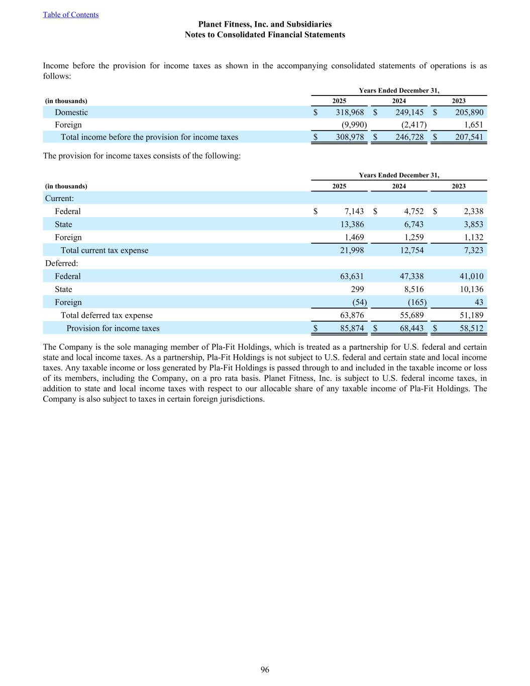 Income before the provision for income taxes as shown in the accompanying consolidated statements of operations is as follows: Years Ended December 31, (in thousands) 2025 2024 2023 Domestic $ 318,968 $ 249,145 $ 205,890 Foreign (9,990) (2,417) 1,651 Total income before the provision for income taxes $ 308,978 $ 246,728 $ 207,541 The provision for income taxes consists of the following: Years Ended December 31, (in thousands) 2025 2024 2023 Current: Federal $ 7,143 $ 4,752 $ 2,338 State 13,386 6,743 3,853 Foreign 1,469 1,259 1,132 Total current tax expense 21,998 12,754 7,323 Deferred: Federal 63,631 47,338 41,010 State 299 8,516 10,136 Foreign (54) (165) 43 Total deferred tax expense 63,876 55,689 51,189 Provision for income taxes $ 85,874 $ 68,443 $ 58,512 The Company is the sole managing member of Pla-Fit Holdings, which is treated as a partnership for U.S. federal and certain state and local income taxes. As a partnership, Pla-Fit Holdings is not subject to U.S. federal and certain state and local income taxes. Any taxable income or loss generated by Pla-Fit Holdings is passed through to and included in the taxable income or loss of its members, including the Company, on a pro rata basis. Planet Fitness, Inc. is subject to U.S. federal income taxes, in addition to state and local income taxes with respect to our allocable share of any taxable income of Pla-Fit Holdings. The Company is also subject to taxes in certain foreign jurisdictions. Table of Contents Planet Fitness, Inc. and Subsidiaries Notes to Consolidated Financial Statements 96