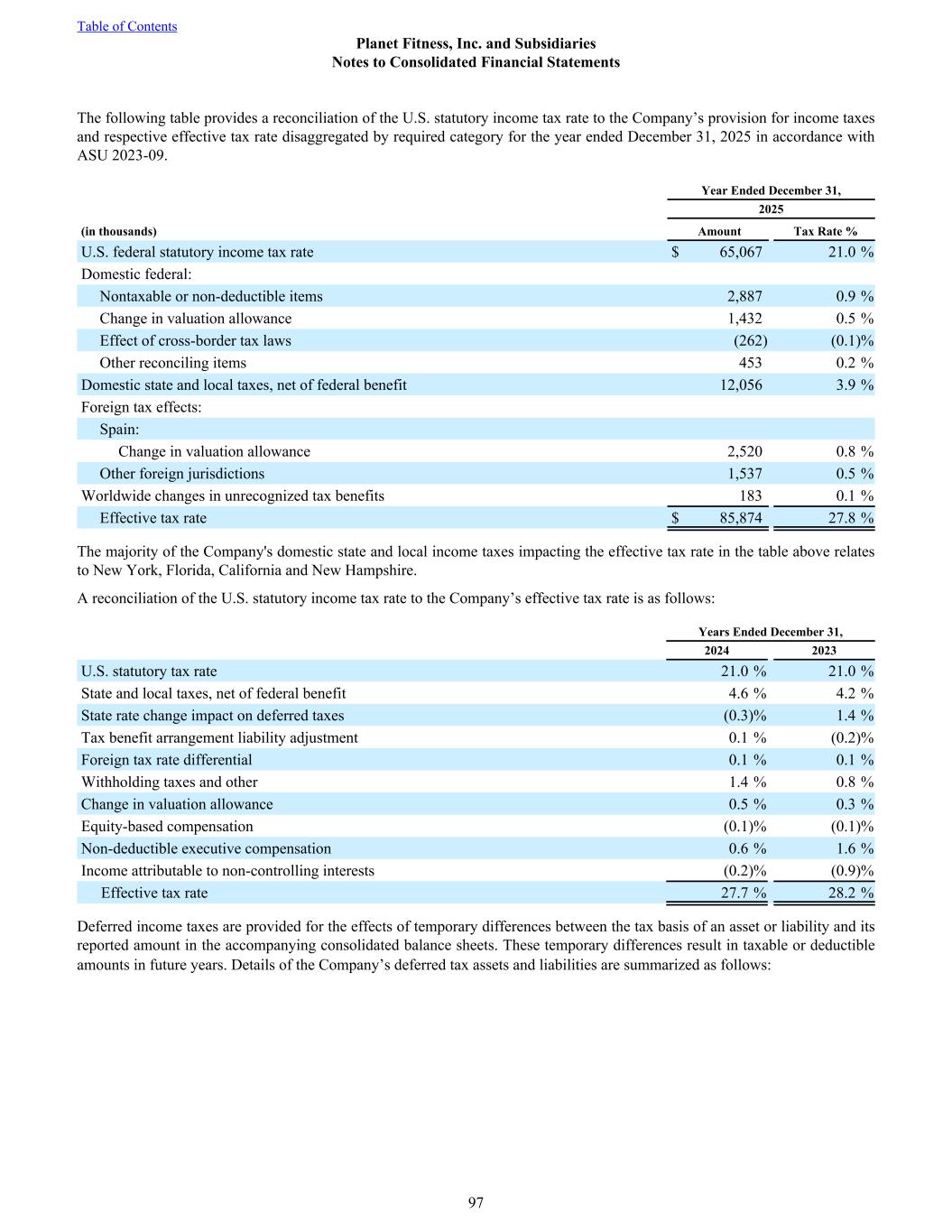 The following table provides a reconciliation of the U.S. statutory income tax rate to the Company’s provision for income taxes and respective effective tax rate disaggregated by required category for the year ended December 31, 2025 in accordance with ASU 2023-09. Year Ended December 31, 2025 (in thousands) Amount Tax Rate % U.S. federal statutory income tax rate $ 65,067 21.0 % Domestic federal: Nontaxable or non-deductible items 2,887 0.9 % Change in valuation allowance 1,432 0.5 % Effect of cross-border tax laws (262) (0.1) % Other reconciling items 453 0.2 % Domestic state and local taxes, net of federal benefit 12,056 3.9 % Foreign tax effects: Spain: Change in valuation allowance 2,520 0.8 % Other foreign jurisdictions 1,537 0.5 % Worldwide changes in unrecognized tax benefits 183 0.1 % Effective tax rate $ 85,874 27.8 % The majority of the Company's domestic state and local income taxes impacting the effective tax rate in the table above relates to New York, Florida, California and New Hampshire. A reconciliation of the U.S. statutory income tax rate to the Company’s effective tax rate is as follows: Years Ended December 31, 2024 2023 U.S. statutory tax rate 21.0 % 21.0 % State and local taxes, net of federal benefit 4.6 % 4.2 % State rate change impact on deferred taxes (0.3) % 1.4 % Tax benefit arrangement liability adjustment 0.1 % (0.2) % Foreign tax rate differential 0.1 % 0.1 % Withholding taxes and other 1.4 % 0.8 % Change in valuation allowance 0.5 % 0.3 % Equity-based compensation (0.1) % (0.1) % Non-deductible executive compensation 0.6 % 1.6 % Income attributable to non-controlling interests (0.2) % (0.9) % Effective tax rate 27.7 % 28.2 % Deferred income taxes are provided for the effects of temporary differences between the tax basis of an asset or liability and its reported amount in the accompanying consolidated balance sheets. These temporary differences result in taxable or deductible amounts in future years. Details of the Company’s deferred tax assets and liabilities are summarized as follows: Table of Contents Planet Fitness, Inc. and Subsidiaries Notes to Consolidated Financial Statements 97