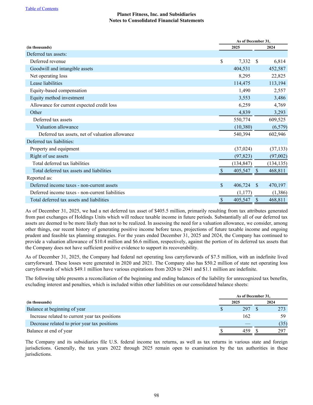 As of December 31, (in thousands) 2025 2024 Deferred tax assets: Deferred revenue $ 7,332 $ 6,814 Goodwill and intangible assets 404,531 452,587 Net operating loss 8,295 22,825 Lease liabilities 114,475 113,194 Equity-based compensation 1,490 2,557 Equity method investment 3,553 3,486 Allowance for current expected credit loss 6,259 4,769 Other 4,839 3,293 Deferred tax assets 550,774 609,525 Valuation allowance (10,380) (6,579) Deferred tax assets, net of valuation allowance 540,394 602,946 Deferred tax liabilities: Property and equipment (37,024) (37,133) Right of use assets (97,823) (97,002) Total deferred tax liabilities (134,847) (134,135) Total deferred tax assets and liabilities $ 405,547 $ 468,811 Reported as: Deferred income taxes - non-current assets $ 406,724 $ 470,197 Deferred income taxes - non-current liabilities (1,177) (1,386) Total deferred tax assets and liabilities $ 405,547 $ 468,811 As of December 31, 2025, we had a net deferred tax asset of $405.5 million, primarily resulting from tax attributes generated from past exchanges of Holdings Units which will reduce taxable income in future periods. Substantially all of our deferred tax assets are deemed to be more likely than not to be realized. In assessing the need for a valuation allowance, we consider, among other things, our recent history of generating positive income before taxes, projections of future taxable income and ongoing prudent and feasible tax planning strategies. For the years ended December 31, 2025 and 2024, the Company has continued to provide a valuation allowance of $10.4 million and $6.6 million, respectively, against the portion of its deferred tax assets that the Company does not have sufficient positive evidence to support its recoverability. As of December 31, 2025, the Company had federal net operating loss carryforwards of $7.5 million, with an indefinite lived carryforward. These losses were generated in 2020 and 2021. The Company also has $50.2 million of state net operating loss carryforwards of which $49.1 million have various expirations from 2026 to 2041 and $1.1 million are indefinite. The following table presents a reconciliation of the beginning and ending balances of the liability for unrecognized tax benefits, excluding interest and penalties, which is included within other liabilities on our consolidated balance sheets: As of December 31, (in thousands) 2025 2024 Balance at beginning of year $ 297 $ 273 Increase related to current year tax positions 162 59 Decrease related to prior year tax positions — (35) Balance at end of year $ 459 $ 297 The Company and its subsidiaries file U.S. federal income tax returns, as well as tax returns in various state and foreign jurisdictions. Generally, the tax years 2022 through 2025 remain open to examination by the tax authorities in these jurisdictions. Table of Contents Planet Fitness, Inc. and Subsidiaries Notes to Consolidated Financial Statements 98