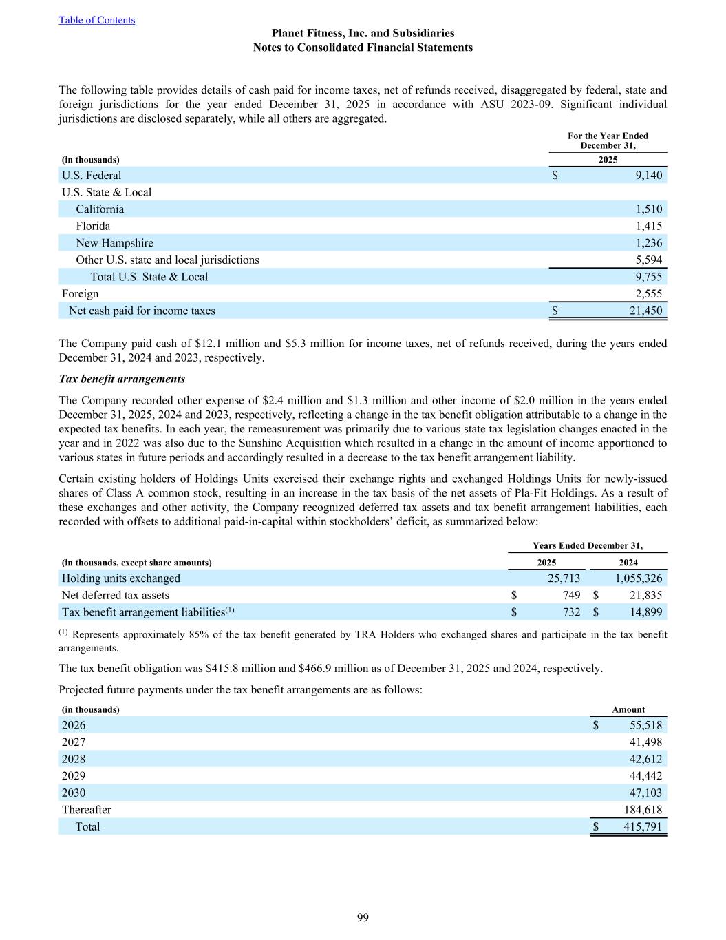 The following table provides details of cash paid for income taxes, net of refunds received, disaggregated by federal, state and foreign jurisdictions for the year ended December 31, 2025 in accordance with ASU 2023-09. Significant individual jurisdictions are disclosed separately, while all others are aggregated. For the Year Ended December 31, (in thousands) 2025 U.S. Federal $ 9,140 U.S. State & Local California 1,510 Florida 1,415 New Hampshire 1,236 Other U.S. state and local jurisdictions 5,594 Total U.S. State & Local 9,755 Foreign 2,555 Net cash paid for income taxes $ 21,450 The Company paid cash of $12.1 million and $5.3 million for income taxes, net of refunds received, during the years ended December 31, 2024 and 2023, respectively. Tax benefit arrangements The Company recorded other expense of $2.4 million and $1.3 million and other income of $2.0 million in the years ended December 31, 2025, 2024 and 2023, respectively, reflecting a change in the tax benefit obligation attributable to a change in the expected tax benefits. In each year, the remeasurement was primarily due to various state tax legislation changes enacted in the year and in 2022 was also due to the Sunshine Acquisition which resulted in a change in the amount of income apportioned to various states in future periods and accordingly resulted in a decrease to the tax benefit arrangement liability. Certain existing holders of Holdings Units exercised their exchange rights and exchanged Holdings Units for newly-issued shares of Class A common stock, resulting in an increase in the tax basis of the net assets of Pla-Fit Holdings. As a result of these exchanges and other activity, the Company recognized deferred tax assets and tax benefit arrangement liabilities, each recorded with offsets to additional paid-in-capital within stockholders’ deficit, as summarized below: Years Ended December 31, (in thousands, except share amounts) 2025 2024 Holding units exchanged 25,713 1,055,326 Net deferred tax assets $ 749 $ 21,835 Tax benefit arrangement liabilities(1) $ 732 $ 14,899 (1) Represents approximately 85% of the tax benefit generated by TRA Holders who exchanged shares and participate in the tax benefit arrangements. The tax benefit obligation was $415.8 million and $466.9 million as of December 31, 2025 and 2024, respectively. Projected future payments under the tax benefit arrangements are as follows: (in thousands) Amount 2026 $ 55,518 2027 41,498 2028 42,612 2029 44,442 2030 47,103 Thereafter 184,618 Total $ 415,791 Table of Contents Planet Fitness, Inc. and Subsidiaries Notes to Consolidated Financial Statements 99
