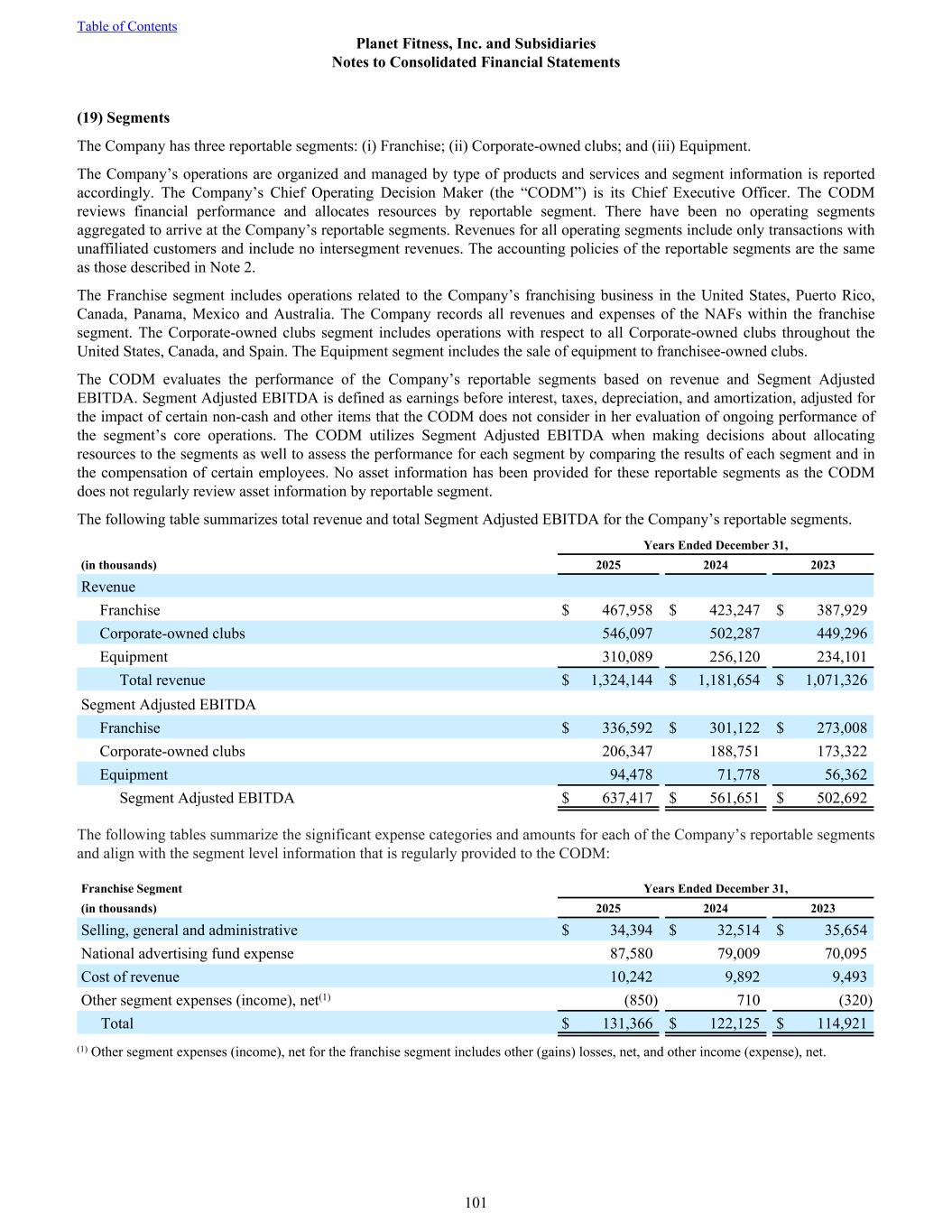 (19) Segments The Company has three reportable segments: (i) Franchise; (ii) Corporate-owned clubs; and (iii) Equipment. The Company’s operations are organized and managed by type of products and services and segment information is reported accordingly. The Company’s Chief Operating Decision Maker (the “CODM”) is its Chief Executive Officer. The CODM reviews financial performance and allocates resources by reportable segment. There have been no operating segments aggregated to arrive at the Company’s reportable segments. Revenues for all operating segments include only transactions with unaffiliated customers and include no intersegment revenues. The accounting policies of the reportable segments are the same as those described in Note 2. The Franchise segment includes operations related to the Company’s franchising business in the United States, Puerto Rico, Canada, Panama, Mexico and Australia. The Company records all revenues and expenses of the NAFs within the franchise segment. The Corporate-owned clubs segment includes operations with respect to all Corporate-owned clubs throughout the United States, Canada, and Spain. The Equipment segment includes the sale of equipment to franchisee-owned clubs. The CODM evaluates the performance of the Company’s reportable segments based on revenue and Segment Adjusted EBITDA. Segment Adjusted EBITDA is defined as earnings before interest, taxes, depreciation, and amortization, adjusted for the impact of certain non-cash and other items that the CODM does not consider in her evaluation of ongoing performance of the segment’s core operations. The CODM utilizes Segment Adjusted EBITDA when making decisions about allocating resources to the segments as well to assess the performance for each segment by comparing the results of each segment and in the compensation of certain employees. No asset information has been provided for these reportable segments as the CODM does not regularly review asset information by reportable segment. The following table summarizes total revenue and total Segment Adjusted EBITDA for the Company’s reportable segments. Years Ended December 31, (in thousands) 2025 2024 2023 Revenue Franchise $ 467,958 $ 423,247 $ 387,929 Corporate-owned clubs 546,097 502,287 449,296 Equipment 310,089 256,120 234,101 Total revenue $ 1,324,144 $ 1,181,654 $ 1,071,326 Segment Adjusted EBITDA Franchise $ 336,592 $ 301,122 $ 273,008 Corporate-owned clubs 206,347 188,751 173,322 Equipment 94,478 71,778 56,362 Segment Adjusted EBITDA $ 637,417 $ 561,651 $ 502,692 The following tables summarize the significant expense categories and amounts for each of the Company’s reportable segments and align with the segment level information that is regularly provided to the CODM: Franchise Segment Years Ended December 31, (in thousands) 2025 2024 2023 Selling, general and administrative $ 34,394 $ 32,514 $ 35,654 National advertising fund expense 87,580 79,009 70,095 Cost of revenue 10,242 9,892 9,493 Other segment expenses (income), net(1) (850) 710 (320) Total $ 131,366 $ 122,125 $ 114,921 (1) Other segment expenses (income), net for the franchise segment includes other (gains) losses, net, and other income (expense), net. Table of Contents Planet Fitness, Inc. and Subsidiaries Notes to Consolidated Financial Statements 101