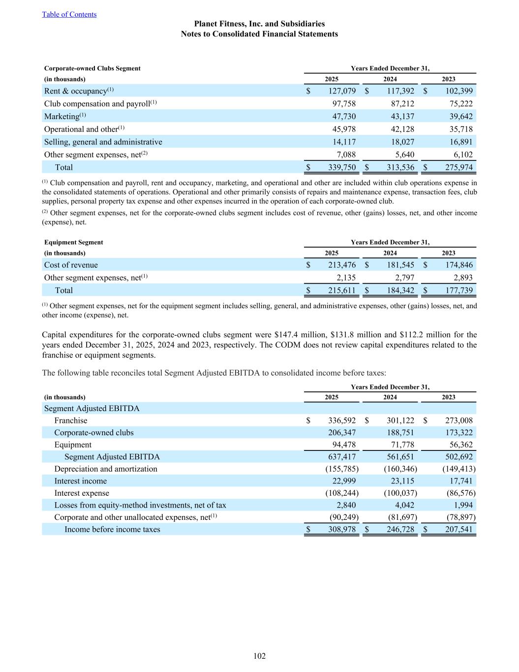 Corporate-owned Clubs Segment Years Ended December 31, (in thousands) 2025 2024 2023 Rent & occupancy(1) $ 127,079 $ 117,392 $ 102,399 Club compensation and payroll(1) 97,758 87,212 75,222 Marketing(1) 47,730 43,137 39,642 Operational and other(1) 45,978 42,128 35,718 Selling, general and administrative 14,117 18,027 16,891 Other segment expenses, net(2) 7,088 5,640 6,102 Total $ 339,750 $ 313,536 $ 275,974 (1) Club compensation and payroll, rent and occupancy, marketing, and operational and other are included within club operations expense in the consolidated statements of operations. Operational and other primarily consists of repairs and maintenance expense, transaction fees, club supplies, personal property tax expense and other expenses incurred in the operation of each corporate-owned club. (2) Other segment expenses, net for the corporate-owned clubs segment includes cost of revenue, other (gains) losses, net, and other income (expense), net. Equipment Segment Years Ended December 31, (in thousands) 2025 2024 2023 Cost of revenue $ 213,476 $ 181,545 $ 174,846 Other segment expenses, net(1) 2,135 2,797 2,893 Total $ 215,611 $ 184,342 $ 177,739 (1) Other segment expenses, net for the equipment segment includes selling, general, and administrative expenses, other (gains) losses, net, and other income (expense), net. Capital expenditures for the corporate-owned clubs segment were $147.4 million, $131.8 million and $112.2 million for the years ended December 31, 2025, 2024 and 2023, respectively. The CODM does not review capital expenditures related to the franchise or equipment segments. The following table reconciles total Segment Adjusted EBITDA to consolidated income before taxes: Years Ended December 31, (in thousands) 2025 2024 2023 Segment Adjusted EBITDA Franchise $ 336,592 $ 301,122 $ 273,008 Corporate-owned clubs 206,347 188,751 173,322 Equipment 94,478 71,778 56,362 Segment Adjusted EBITDA 637,417 561,651 502,692 Depreciation and amortization (155,785) (160,346) (149,413) Interest income 22,999 23,115 17,741 Interest expense (108,244) (100,037) (86,576) Losses from equity-method investments, net of tax 2,840 4,042 1,994 Corporate and other unallocated expenses, net(1) (90,249) (81,697) (78,897) Income before income taxes $ 308,978 $ 246,728 $ 207,541 Table of Contents Planet Fitness, Inc. and Subsidiaries Notes to Consolidated Financial Statements 102