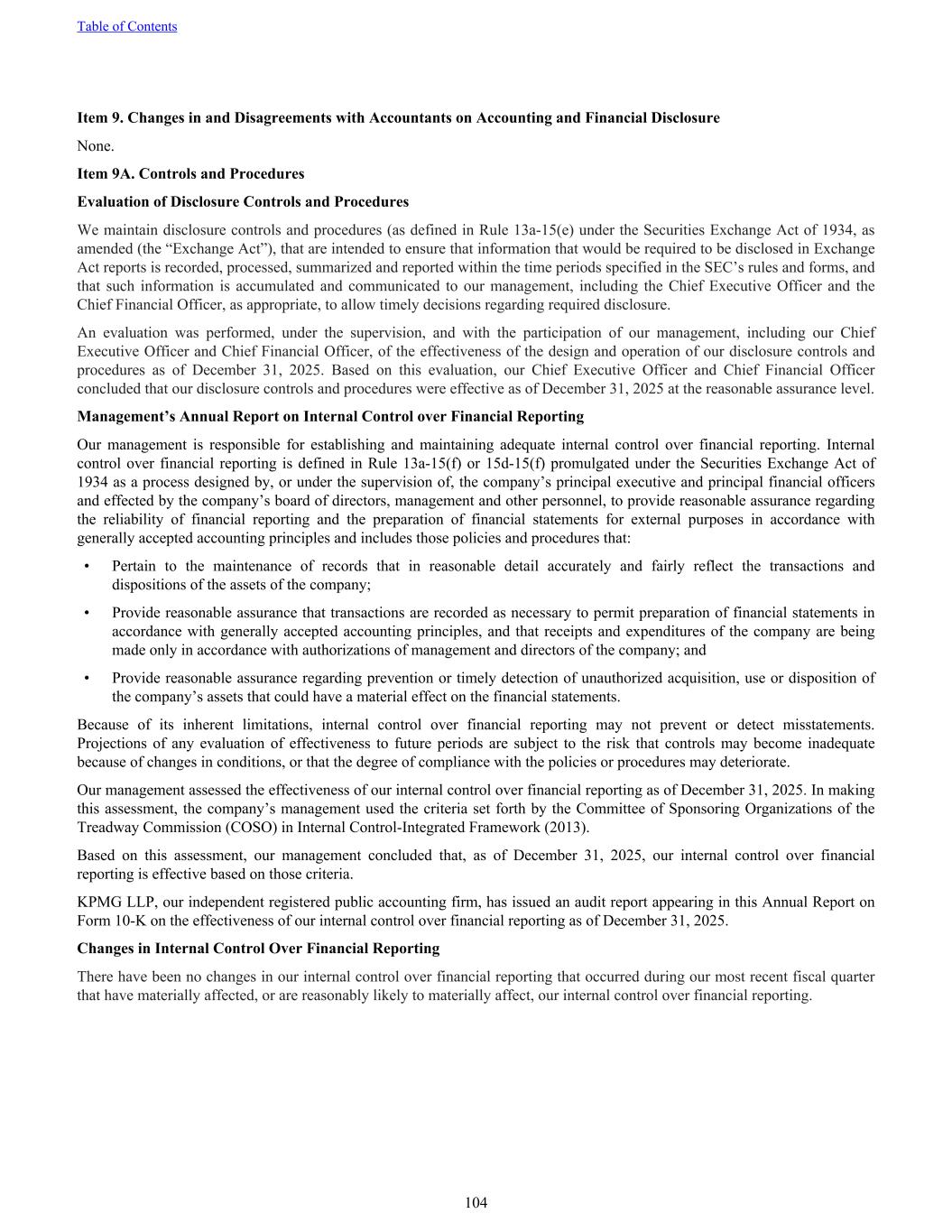 Item 9. Changes in and Disagreements with Accountants on Accounting and Financial Disclosure None. Item 9A. Controls and Procedures Evaluation of Disclosure Controls and Procedures We maintain disclosure controls and procedures (as defined in Rule 13a-15(e) under the Securities Exchange Act of 1934, as amended (the “Exchange Act”), that are intended to ensure that information that would be required to be disclosed in Exchange Act reports is recorded, processed, summarized and reported within the time periods specified in the SEC’s rules and forms, and that such information is accumulated and communicated to our management, including the Chief Executive Officer and the Chief Financial Officer, as appropriate, to allow timely decisions regarding required disclosure. An evaluation was performed, under the supervision, and with the participation of our management, including our Chief Executive Officer and Chief Financial Officer, of the effectiveness of the design and operation of our disclosure controls and procedures as of December 31, 2025. Based on this evaluation, our Chief Executive Officer and Chief Financial Officer concluded that our disclosure controls and procedures were effective as of December 31, 2025 at the reasonable assurance level. Management’s Annual Report on Internal Control over Financial Reporting Our management is responsible for establishing and maintaining adequate internal control over financial reporting. Internal control over financial reporting is defined in Rule 13a-15(f) or 15d-15(f) promulgated under the Securities Exchange Act of 1934 as a process designed by, or under the supervision of, the company’s principal executive and principal financial officers and effected by the company’s board of directors, management and other personnel, to provide reasonable assurance regarding the reliability of financial reporting and the preparation of financial statements for external purposes in accordance with generally accepted accounting principles and includes those policies and procedures that: • Pertain to the maintenance of records that in reasonable detail accurately and fairly reflect the transactions and dispositions of the assets of the company; • Provide reasonable assurance that transactions are recorded as necessary to permit preparation of financial statements in accordance with generally accepted accounting principles, and that receipts and expenditures of the company are being made only in accordance with authorizations of management and directors of the company; and • Provide reasonable assurance regarding prevention or timely detection of unauthorized acquisition, use or disposition of the company’s assets that could have a material effect on the financial statements. Because of its inherent limitations, internal control over financial reporting may not prevent or detect misstatements. Projections of any evaluation of effectiveness to future periods are subject to the risk that controls may become inadequate because of changes in conditions, or that the degree of compliance with the policies or procedures may deteriorate. Our management assessed the effectiveness of our internal control over financial reporting as of December 31, 2025. In making this assessment, the company’s management used the criteria set forth by the Committee of Sponsoring Organizations of the Treadway Commission (COSO) in Internal Control-Integrated Framework (2013). Based on this assessment, our management concluded that, as of December 31, 2025, our internal control over financial reporting is effective based on those criteria. KPMG LLP, our independent registered public accounting firm, has issued an audit report appearing in this Annual Report on Form 10-K on the effectiveness of our internal control over financial reporting as of December 31, 2025. Changes in Internal Control Over Financial Reporting There have been no changes in our internal control over financial reporting that occurred during our most recent fiscal quarter that have materially affected, or are reasonably likely to materially affect, our internal control over financial reporting. Table of Contents 104