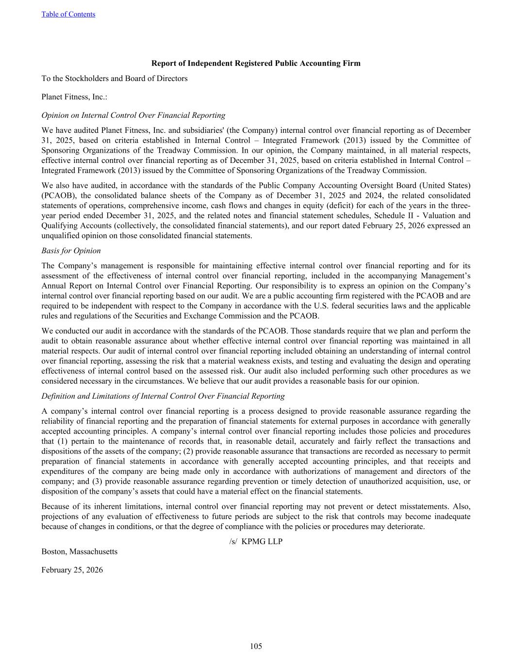 Report of Independent Registered Public Accounting Firm To the Stockholders and Board of Directors Planet Fitness, Inc.: Opinion on Internal Control Over Financial Reporting We have audited Planet Fitness, Inc. and subsidiaries' (the Company) internal control over financial reporting as of December 31, 2025, based on criteria established in Internal Control – Integrated Framework (2013) issued by the Committee of Sponsoring Organizations of the Treadway Commission. In our opinion, the Company maintained, in all material respects, effective internal control over financial reporting as of December 31, 2025, based on criteria established in Internal Control – Integrated Framework (2013) issued by the Committee of Sponsoring Organizations of the Treadway Commission. We also have audited, in accordance with the standards of the Public Company Accounting Oversight Board (United States) (PCAOB), the consolidated balance sheets of the Company as of December 31, 2025 and 2024, the related consolidated statements of operations, comprehensive income, cash flows and changes in equity (deficit) for each of the years in the three- year period ended December 31, 2025, and the related notes and financial statement schedules, Schedule II - Valuation and Qualifying Accounts (collectively, the consolidated financial statements), and our report dated February 25, 2026 expressed an unqualified opinion on those consolidated financial statements. Basis for Opinion The Company’s management is responsible for maintaining effective internal control over financial reporting and for its assessment of the effectiveness of internal control over financial reporting, included in the accompanying Management’s Annual Report on Internal Control over Financial Reporting. Our responsibility is to express an opinion on the Company’s internal control over financial reporting based on our audit. We are a public accounting firm registered with the PCAOB and are required to be independent with respect to the Company in accordance with the U.S. federal securities laws and the applicable rules and regulations of the Securities and Exchange Commission and the PCAOB. We conducted our audit in accordance with the standards of the PCAOB. Those standards require that we plan and perform the audit to obtain reasonable assurance about whether effective internal control over financial reporting was maintained in all material respects. Our audit of internal control over financial reporting included obtaining an understanding of internal control over financial reporting, assessing the risk that a material weakness exists, and testing and evaluating the design and operating effectiveness of internal control based on the assessed risk. Our audit also included performing such other procedures as we considered necessary in the circumstances. We believe that our audit provides a reasonable basis for our opinion. Definition and Limitations of Internal Control Over Financial Reporting A company’s internal control over financial reporting is a process designed to provide reasonable assurance regarding the reliability of financial reporting and the preparation of financial statements for external purposes in accordance with generally accepted accounting principles. A company’s internal control over financial reporting includes those policies and procedures that (1) pertain to the maintenance of records that, in reasonable detail, accurately and fairly reflect the transactions and dispositions of the assets of the company; (2) provide reasonable assurance that transactions are recorded as necessary to permit preparation of financial statements in accordance with generally accepted accounting principles, and that receipts and expenditures of the company are being made only in accordance with authorizations of management and directors of the company; and (3) provide reasonable assurance regarding prevention or timely detection of unauthorized acquisition, use, or disposition of the company’s assets that could have a material effect on the financial statements. Because of its inherent limitations, internal control over financial reporting may not prevent or detect misstatements. Also, projections of any evaluation of effectiveness to future periods are subject to the risk that controls may become inadequate because of changes in conditions, or that the degree of compliance with the policies or procedures may deteriorate. /s/ KPMG LLP Boston, Massachusetts February 25, 2026 Table of Contents 105