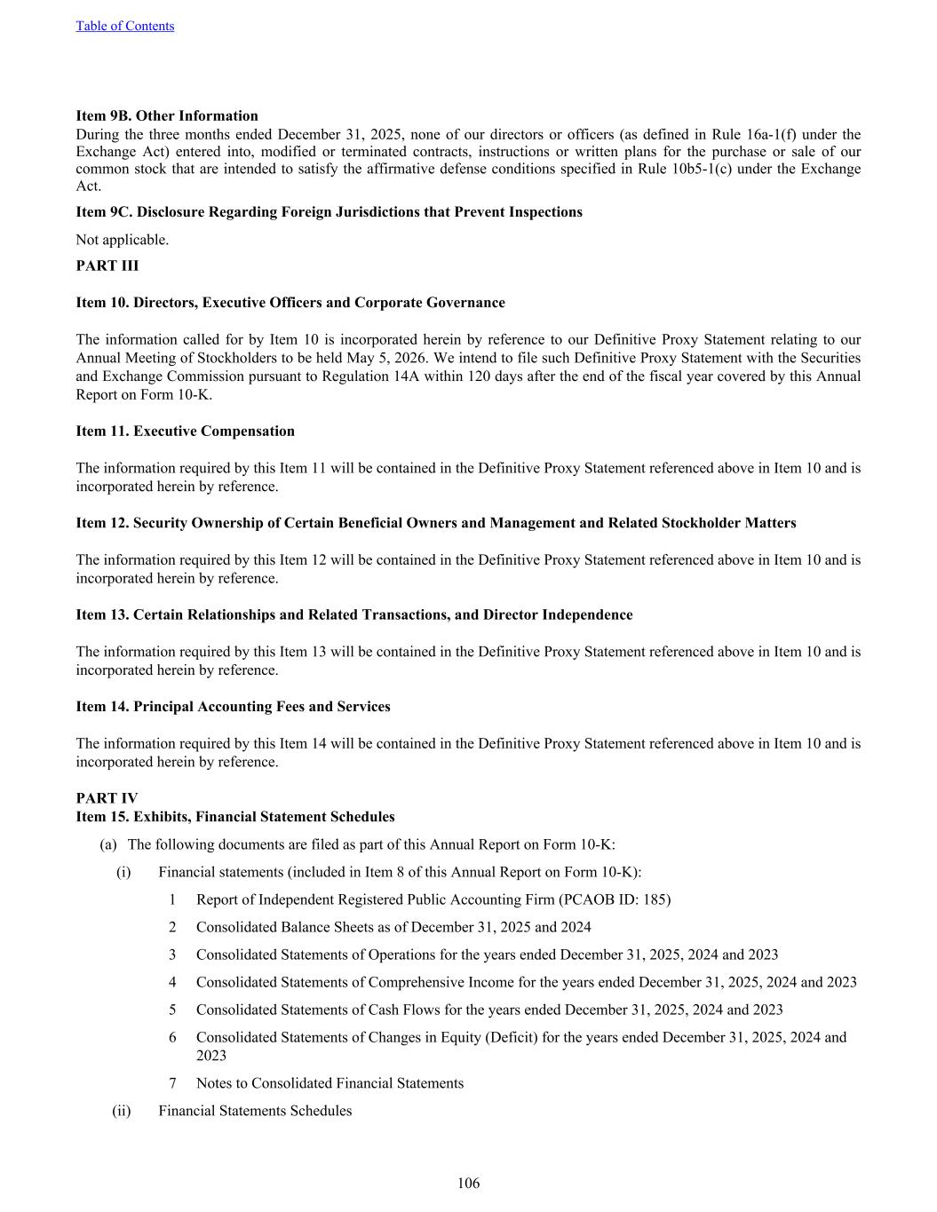 Item 9B. Other Information During the three months ended December 31, 2025, none of our directors or officers (as defined in Rule 16a-1(f) under the Exchange Act) entered into, modified or terminated contracts, instructions or written plans for the purchase or sale of our common stock that are intended to satisfy the affirmative defense conditions specified in Rule 10b5-1(c) under the Exchange Act. Item 9C. Disclosure Regarding Foreign Jurisdictions that Prevent Inspections Not applicable. PART III Item 10. Directors, Executive Officers and Corporate Governance The information called for by Item 10 is incorporated herein by reference to our Definitive Proxy Statement relating to our Annual Meeting of Stockholders to be held May 5, 2026. We intend to file such Definitive Proxy Statement with the Securities and Exchange Commission pursuant to Regulation 14A within 120 days after the end of the fiscal year covered by this Annual Report on Form 10-K. Item 11. Executive Compensation The information required by this Item 11 will be contained in the Definitive Proxy Statement referenced above in Item 10 and is incorporated herein by reference. Item 12. Security Ownership of Certain Beneficial Owners and Management and Related Stockholder Matters The information required by this Item 12 will be contained in the Definitive Proxy Statement referenced above in Item 10 and is incorporated herein by reference. Item 13. Certain Relationships and Related Transactions, and Director Independence The information required by this Item 13 will be contained in the Definitive Proxy Statement referenced above in Item 10 and is incorporated herein by reference. Item 14. Principal Accounting Fees and Services The information required by this Item 14 will be contained in the Definitive Proxy Statement referenced above in Item 10 and is incorporated herein by reference. PART IV Item 15. Exhibits, Financial Statement Schedules (a) The following documents are filed as part of this Annual Report on Form 10-K: (i) Financial statements (included in Item 8 of this Annual Report on Form 10-K): 1 Report of Independent Registered Public Accounting Firm (PCAOB ID: 185) 2 Consolidated Balance Sheets as of December 31, 2025 and 2024 3 Consolidated Statements of Operations for the years ended December 31, 2025, 2024 and 2023 4 Consolidated Statements of Comprehensive Income for the years ended December 31, 2025, 2024 and 2023 5 Consolidated Statements of Cash Flows for the years ended December 31, 2025, 2024 and 2023 6 Consolidated Statements of Changes in Equity (Deficit) for the years ended December 31, 2025, 2024 and 2023 7 Notes to Consolidated Financial Statements (ii) Financial Statements Schedules Table of Contents 106