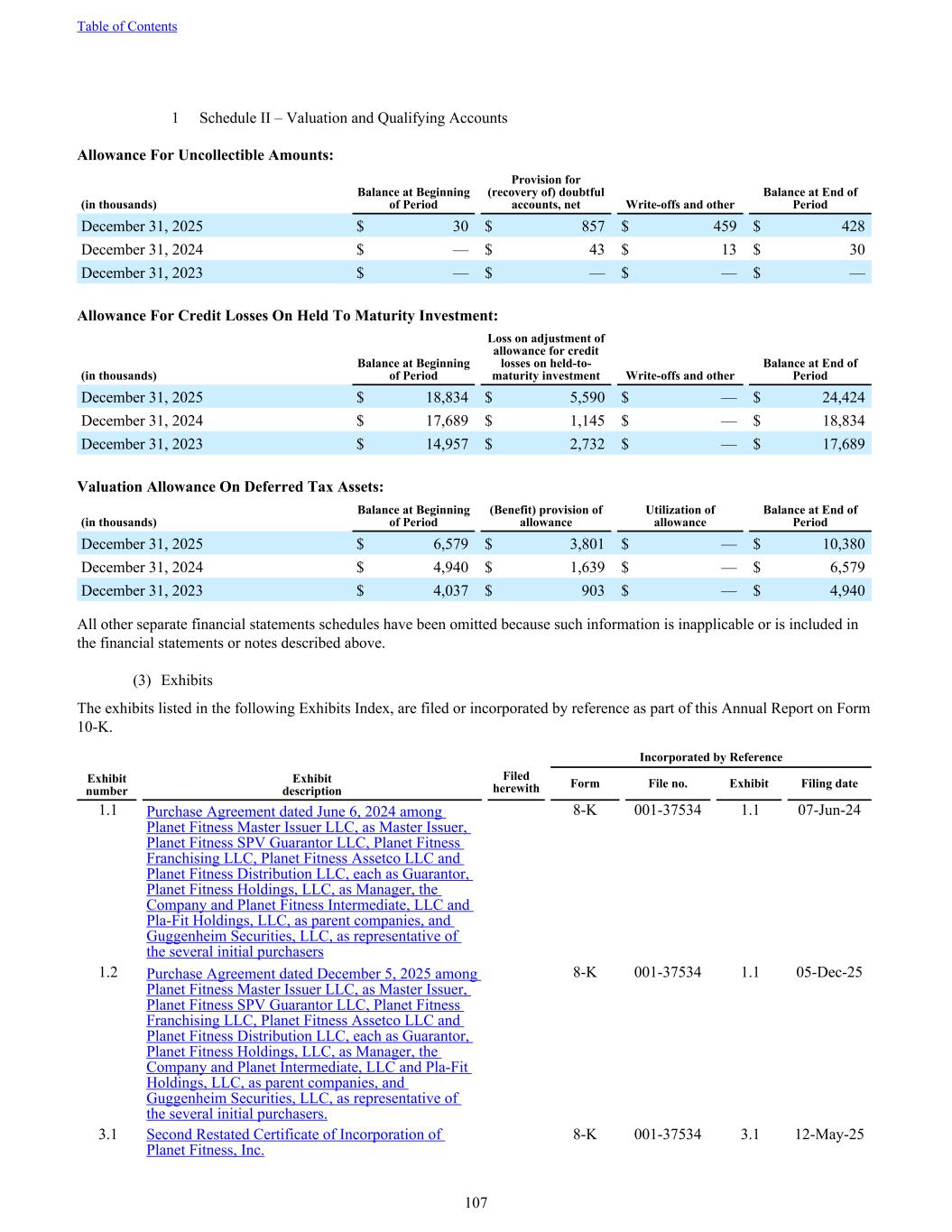 1 Schedule II – Valuation and Qualifying Accounts Allowance For Uncollectible Amounts: (in thousands) Balance at Beginning of Period Provision for (recovery of) doubtful accounts, net Write-offs and other Balance at End of Period December 31, 2025 $ 30 $ 857 $ 459 $ 428 December 31, 2024 $ — $ 43 $ 13 $ 30 December 31, 2023 $ — $ — $ — $ — Allowance For Credit Losses On Held To Maturity Investment: (in thousands) Balance at Beginning of Period Loss on adjustment of allowance for credit losses on held-to- maturity investment Write-offs and other Balance at End of Period December 31, 2025 $ 18,834 $ 5,590 $ — $ 24,424 December 31, 2024 $ 17,689 $ 1,145 $ — $ 18,834 December 31, 2023 $ 14,957 $ 2,732 $ — $ 17,689 Valuation Allowance On Deferred Tax Assets: (in thousands) Balance at Beginning of Period (Benefit) provision of allowance Utilization of allowance Balance at End of Period December 31, 2025 $ 6,579 $ 3,801 $ — $ 10,380 December 31, 2024 $ 4,940 $ 1,639 $ — $ 6,579 December 31, 2023 $ 4,037 $ 903 $ — $ 4,940 All other separate financial statements schedules have been omitted because such information is inapplicable or is included in the financial statements or notes described above. (3) Exhibits The exhibits listed in the following Exhibits Index, are filed or incorporated by reference as part of this Annual Report on Form 10-K. 1.1 Purchase Agreement dated June 6, 2024 among Planet Fitness Master Issuer LLC, as Master Issuer, Planet Fitness SPV Guarantor LLC, Planet Fitness Franchising LLC, Planet Fitness Assetco LLC and Planet Fitness Distribution LLC, each as Guarantor, Planet Fitness Holdings, LLC, as Manager, the Company and Planet Fitness Intermediate, LLC and Pla-Fit Holdings, LLC, as parent companies, and Guggenheim Securities, LLC, as representative of the several initial purchasers 8-K 001-37534 1.1 07-Jun-24 1.2 Purchase Agreement dated December 5, 2025 among Planet Fitness Master Issuer LLC, as Master Issuer, Planet Fitness SPV Guarantor LLC, Planet Fitness Franchising LLC, Planet Fitness Assetco LLC and Planet Fitness Distribution LLC, each as Guarantor, Planet Fitness Holdings, LLC, as Manager, the Company and Planet Intermediate, LLC and Pla-Fit Holdings, LLC, as parent companies, and Guggenheim Securities, LLC, as representative of the several initial purchasers. 8-K 001-37534 1.1 05-Dec-25 3.1 Second Restated Certificate of Incorporation of Planet Fitness, Inc. 8-K 001-37534 3.1 12-May-25 Incorporated by Reference Exhibit number Exhibit description Filed herewith Form File no. Exhibit Filing date Table of Contents 107