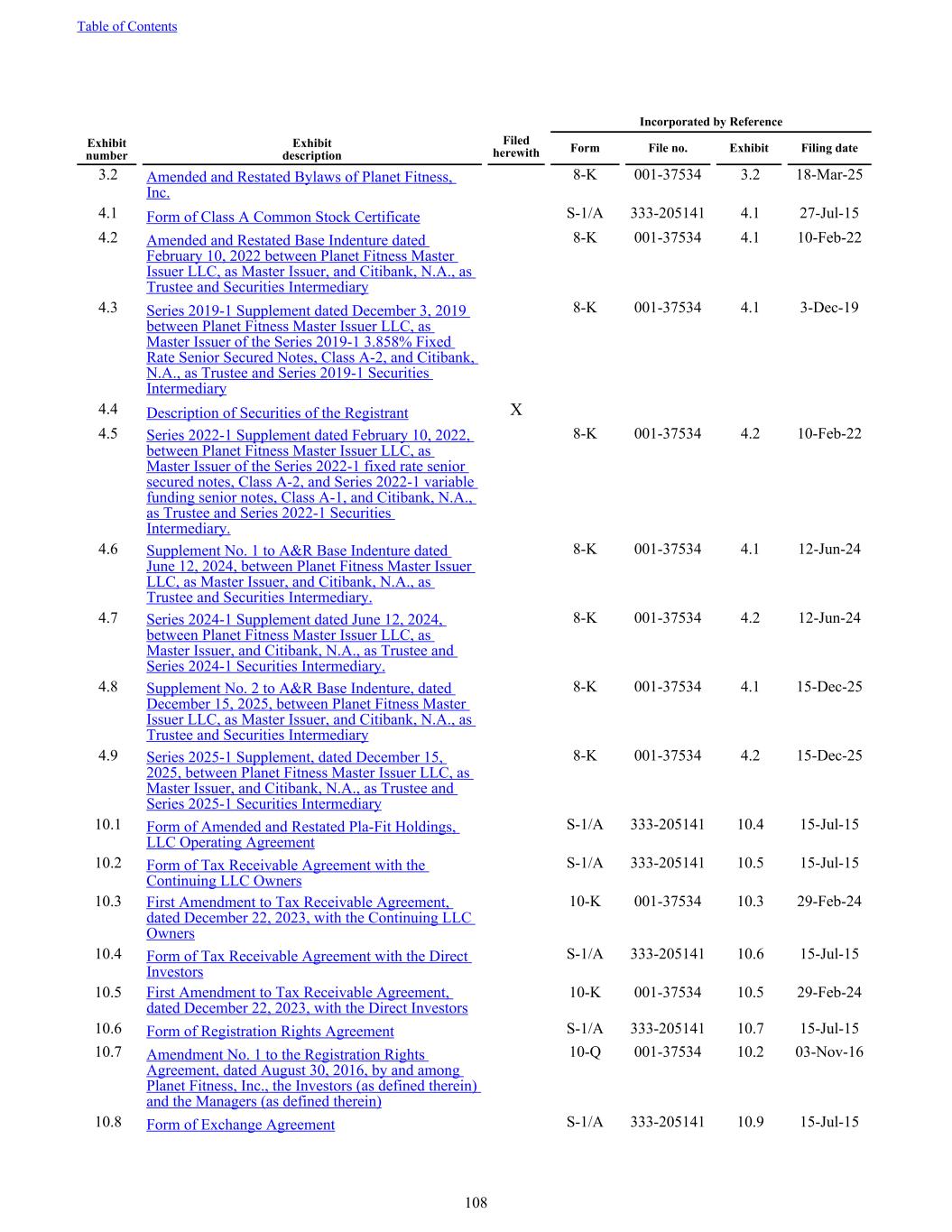 3.2 Amended and Restated Bylaws of Planet Fitness, Inc. 8-K 001-37534 3.2 18-Mar-25 4.1 Form of Class A Common Stock Certificate S-1/A 333-205141 4.1 27-Jul-15 4.2 Amended and Restated Base Indenture dated February 10, 2022 between Planet Fitness Master Issuer LLC, as Master Issuer, and Citibank, N.A., as Trustee and Securities Intermediary 8-K 001-37534 4.1 10-Feb-22 4.3 Series 2019-1 Supplement dated December 3, 2019 between Planet Fitness Master Issuer LLC, as Master Issuer of the Series 2019-1 3.858% Fixed Rate Senior Secured Notes, Class A-2, and Citibank, N.A., as Trustee and Series 2019-1 Securities Intermediary 8-K 001-37534 4.1 3-Dec-19 4.4 Description of Securities of the Registrant X 4.5 Series 2022-1 Supplement dated February 10, 2022, between Planet Fitness Master Issuer LLC, as Master Issuer of the Series 2022-1 fixed rate senior secured notes, Class A-2, and Series 2022-1 variable funding senior notes, Class A-1, and Citibank, N.A., as Trustee and Series 2022-1 Securities Intermediary. 8-K 001-37534 4.2 10-Feb-22 4.6 Supplement No. 1 to A&R Base Indenture dated June 12, 2024, between Planet Fitness Master Issuer LLC, as Master Issuer, and Citibank, N.A., as Trustee and Securities Intermediary. 8-K 001-37534 4.1 12-Jun-24 4.7 Series 2024-1 Supplement dated June 12, 2024, between Planet Fitness Master Issuer LLC, as Master Issuer, and Citibank, N.A., as Trustee and Series 2024-1 Securities Intermediary. 8-K 001-37534 4.2 12-Jun-24 4.8 Supplement No. 2 to A&R Base Indenture, dated December 15, 2025, between Planet Fitness Master Issuer LLC, as Master Issuer, and Citibank, N.A., as Trustee and Securities Intermediary 8-K 001-37534 4.1 15-Dec-25 4.9 Series 2025-1 Supplement, dated December 15, 2025, between Planet Fitness Master Issuer LLC, as Master Issuer, and Citibank, N.A., as Trustee and Series 2025-1 Securities Intermediary 8-K 001-37534 4.2 15-Dec-25 10.1 Form of Amended and Restated Pla-Fit Holdings, LLC Operating Agreement S-1/A 333-205141 10.4 15-Jul-15 10.2 Form of Tax Receivable Agreement with the Continuing LLC Owners S-1/A 333-205141 10.5 15-Jul-15 10.3 First Amendment to Tax Receivable Agreement, dated December 22, 2023, with the Continuing LLC Owners 10-K 001-37534 10.3 29-Feb-24 10.4 Form of Tax Receivable Agreement with the Direct Investors S-1/A 333-205141 10.6 15-Jul-15 10.5 First Amendment to Tax Receivable Agreement, dated December 22, 2023, with the Direct Investors 10-K 001-37534 10.5 29-Feb-24 10.6 Form of Registration Rights Agreement S-1/A 333-205141 10.7 15-Jul-15 10.7 Amendment No. 1 to the Registration Rights Agreement, dated August 30, 2016, by and among Planet Fitness, Inc., the Investors (as defined therein) and the Managers (as defined therein) 10-Q 001-37534 10.2 03-Nov-16 10.8 Form of Exchange Agreement S-1/A 333-205141 10.9 15-Jul-15 Incorporated by Reference Exhibit number Exhibit description Filed herewith Form File no. Exhibit Filing date Table of Contents 108