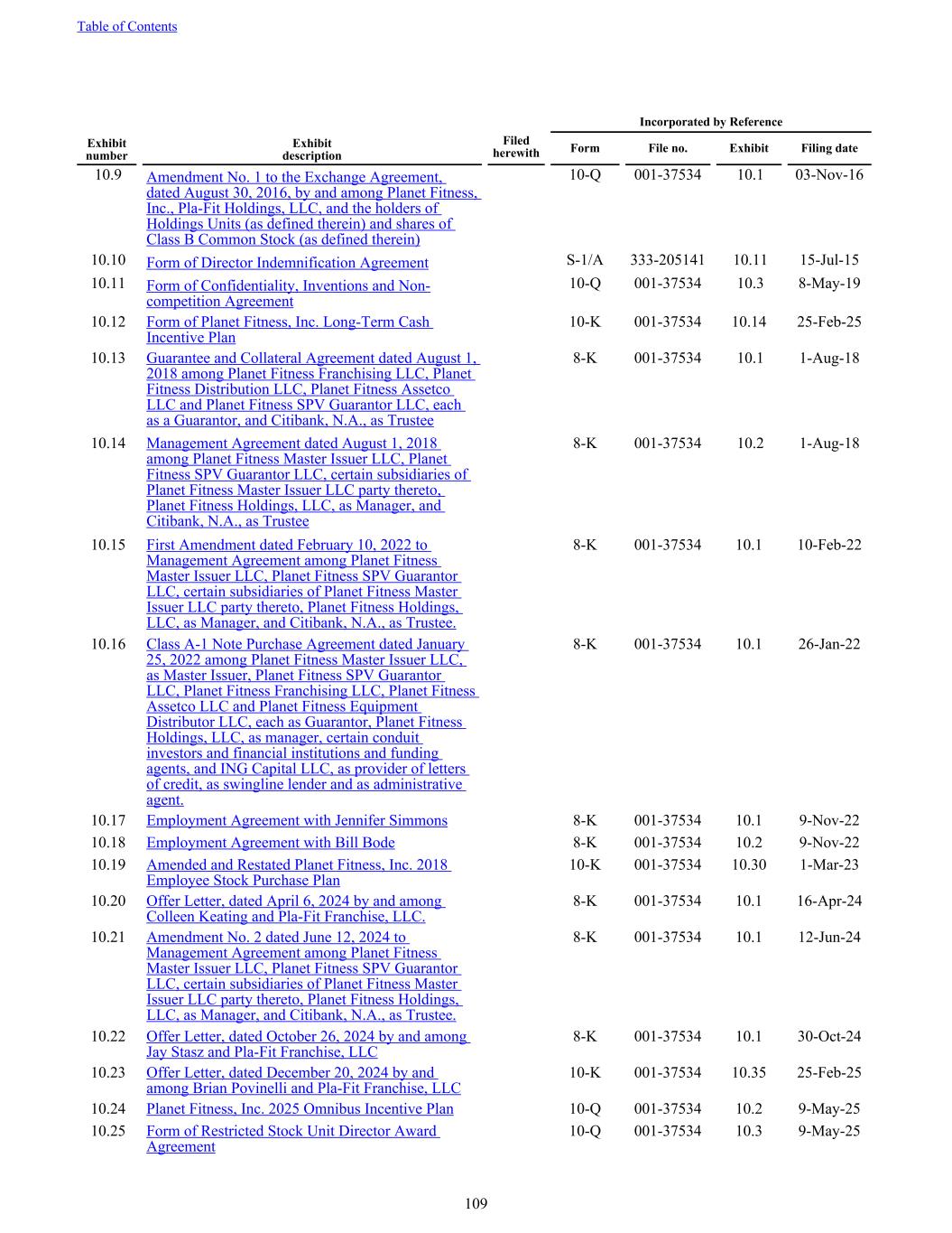 10.9 Amendment No. 1 to the Exchange Agreement, dated August 30, 2016, by and among Planet Fitness, Inc., Pla-Fit Holdings, LLC, and the holders of Holdings Units (as defined therein) and shares of Class B Common Stock (as defined therein) 10-Q 001-37534 10.1 03-Nov-16 10.10 Form of Director Indemnification Agreement S-1/A 333-205141 10.11 15-Jul-15 10.11 Form of Confidentiality, Inventions and Non- competition Agreement 10-Q 001-37534 10.3 8-May-19 10.12 Form of Planet Fitness, Inc. Long-Term Cash Incentive Plan 10-K 001-37534 10.14 25-Feb-25 10.13 Guarantee and Collateral Agreement dated August 1, 2018 among Planet Fitness Franchising LLC, Planet Fitness Distribution LLC, Planet Fitness Assetco LLC and Planet Fitness SPV Guarantor LLC, each as a Guarantor, and Citibank, N.A., as Trustee 8-K 001-37534 10.1 1-Aug-18 10.14 Management Agreement dated August 1, 2018 among Planet Fitness Master Issuer LLC, Planet Fitness SPV Guarantor LLC, certain subsidiaries of Planet Fitness Master Issuer LLC party thereto, Planet Fitness Holdings, LLC, as Manager, and Citibank, N.A., as Trustee 8-K 001-37534 10.2 1-Aug-18 10.15 First Amendment dated February 10, 2022 to Management Agreement among Planet Fitness Master Issuer LLC, Planet Fitness SPV Guarantor LLC, certain subsidiaries of Planet Fitness Master Issuer LLC party thereto, Planet Fitness Holdings, LLC, as Manager, and Citibank, N.A., as Trustee. 8-K 001-37534 10.1 10-Feb-22 10.16 Class A-1 Note Purchase Agreement dated January 25, 2022 among Planet Fitness Master Issuer LLC, as Master Issuer, Planet Fitness SPV Guarantor LLC, Planet Fitness Franchising LLC, Planet Fitness Assetco LLC and Planet Fitness Equipment Distributor LLC, each as Guarantor, Planet Fitness Holdings, LLC, as manager, certain conduit investors and financial institutions and funding agents, and ING Capital LLC, as provider of letters of credit, as swingline lender and as administrative agent. 8-K 001-37534 10.1 26-Jan-22 10.17 Employment Agreement with Jennifer Simmons 8-K 001-37534 10.1 9-Nov-22 10.18 Employment Agreement with Bill Bode 8-K 001-37534 10.2 9-Nov-22 10.19 Amended and Restated Planet Fitness, Inc. 2018 Employee Stock Purchase Plan 10-K 001-37534 10.30 1-Mar-23 10.20 Offer Letter, dated April 6, 2024 by and among Colleen Keating and Pla-Fit Franchise, LLC. 8-K 001-37534 10.1 16-Apr-24 10.21 Amendment No. 2 dated June 12, 2024 to Management Agreement among Planet Fitness Master Issuer LLC, Planet Fitness SPV Guarantor LLC, certain subsidiaries of Planet Fitness Master Issuer LLC party thereto, Planet Fitness Holdings, LLC, as Manager, and Citibank, N.A., as Trustee. 8-K 001-37534 10.1 12-Jun-24 10.22 Offer Letter, dated October 26, 2024 by and among Jay Stasz and Pla-Fit Franchise, LLC 8-K 001-37534 10.1 30-Oct-24 10.23 Offer Letter, dated December 20, 2024 by and among Brian Povinelli and Pla-Fit Franchise, LLC 10-K 001-37534 10.35 25-Feb-25 10.24 Planet Fitness, Inc. 2025 Omnibus Incentive Plan 10-Q 001-37534 10.2 9-May-25 10.25 Form of Restricted Stock Unit Director Award Agreement 10-Q 001-37534 10.3 9-May-25 Incorporated by Reference Exhibit number Exhibit description Filed herewith Form File no. Exhibit Filing date Table of Contents 109