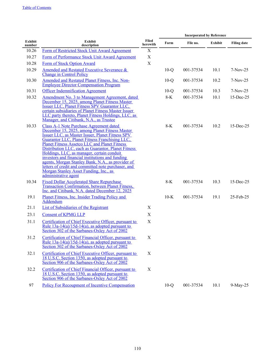 10.26 Form of Restricted Stock Unit Award Agreement X 10.27 Form of Performance Stock Unit Award Agreement X 10.28 Form of Stock Option Award X 10.29 Amended and Restated Executive Severance & Change in Control Policy 10-Q 001-37534 10.1 7-Nov-25 10.30 Amended and Restated Planet Fitness, Inc. Non- Employee Director Compensation Program 10-Q 001-37534 10.2 7-Nov-25 10.31 Officer Indemnification Agreement 10-Q 001-37534 10.3 7-Nov-25 10.32 Amendment No. 3 to Management Agreement, dated December 15, 2025, among Planet Fitness Master Issuer LLC, Planet Fitness SPV Guarantor LLC, certain subsidiaries of Planet Fitness Master Issuer LLC party thereto, Planet Fitness Holdings, LLC, as Manager, and Citibank, N.A., as Trustee 8-K 001-37534 10.1 15-Dec-25 10.33 Class A-1 Note Purchase Agreement dated December 15, 2025, among Planet Fitness Master Issuer LLC, as Master Issuer, Planet Fitness SPV Guarantor LLC, Planet Fitness Franchising LLC, Planet Fitness Assetco LLC and Planet Fitness Distribution LLC, each as Guarantor, Planet Fitness Holdings, LLC, as manager, certain conduit investors and financial institutions and funding agents, Morgan Stanley Bank, N.A., as provider of letters of credit and committed note purchaser, and Morgan Stanley Asset Funding, Inc., as administrative agent 8-K 001-37534 10.2 15-Dec-25 10.34 Fixed Dollar Accelerated Share Repurchase Transaction Confirmation, between Planet Fitness, Inc. and Citibank, N.A. dated December 12, 2025 8-K 001-37534 10.3 15-Dec-25 19.1 Planet Fitness, Inc. Insider Trading Policy and Addendum 10-K 001-37534 19.1 25-Feb-25 21.1 List of Subsidiaries of the Registrant X 23.1 Consent of KPMG LLP X 31.1 Certification of Chief Executive Officer, pursuant to Rule 13a-14(a)/15d-14(a), as adopted pursuant to Section 302 of the Sarbanes-Oxley Act of 2002 X 31.2 Certification of Chief Financial Officer, pursuant to Rule 13a-14(a)/15d-14(a), as adopted pursuant to Section 302 of the Sarbanes-Oxley Act of 2002 X 32.1 Certification of Chief Executive Officer, pursuant to 18 U.S.C. Section 1350, as adopted pursuant to Section 906 of the Sarbanes-Oxley Act of 2002 X 32.2 Certification of Chief Financial Officer, pursuant to 18 U.S.C. Section 1350, as adopted pursuant to Section 906 of the Sarbanes-Oxley Act of 2002 X 97 Policy For Recoupment of Incentive Compensation 10-Q 001-37534 10.1 9-May-25 Incorporated by Reference Exhibit number Exhibit description Filed herewith Form File no. Exhibit Filing date Table of Contents 110
