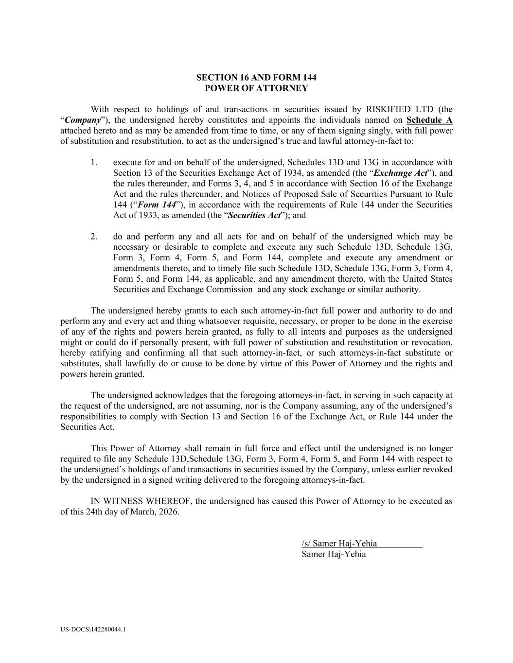 US-DOCS\142280044.1 SECTION 16 AND FORM 144 POWER OF ATTORNEY With respect to holdings of and transactions in securities issued by RISKIFIED LTD (the “Company”), the undersigned hereby constitutes and appoints the individuals named on Schedule A attached hereto and as may be amended from time to time, or any of them signing singly, with full power of substitution and resubstitution, to act as the undersigned’s true and lawful attorney-in-fact to: 1. execute for and on behalf of the undersigned, Schedules 13D and 13G in accordance with Section 13 of the Securities Exchange Act of 1934, as amended (the “Exchange Act”), and the rules thereunder, and Forms 3, 4, and 5 in accordance with Section 16 of the Exchange Act and the rules thereunder, and Notices of Proposed Sale of Securities Pursuant to Rule 144 (“Form 144”), in accordance with the requirements of Rule 144 under the Securities Act of 1933, as amended (the “Securities Act”); and 2. do and perform any and all acts for and on behalf of the undersigned which may be necessary or desirable to complete and execute any such Schedule 13D, Schedule 13G, Form 3, Form 4, Form 5, and Form 144, complete and execute any amendment or amendments thereto, and to timely file such Schedule 13D, Schedule 13G, Form 3, Form 4, Form 5, and Form 144, as applicable, and any amendment thereto, with the United States Securities and Exchange Commission and any stock exchange or similar authority. The undersigned hereby grants to each such attorney-in-fact full power and authority to do and perform any and every act and thing whatsoever requisite, necessary, or proper to be done in the exercise of any of the rights and powers herein granted, as fully to all intents and purposes as the undersigned might or could do if personally present, with full power of substitution and resubstitution or revocation, hereby ratifying and confirming all that such attorney-in-fact, or such attorneys-in-fact substitute or substitutes, shall lawfully do or cause to be done by virtue of this Power of Attorney and the rights and powers herein granted. The undersigned acknowledges that the foregoing attorneys-in-fact, in serving in such capacity at the request of the undersigned, are not assuming, nor is the Company assuming, any of the undersigned’s responsibilities to comply with Section 13 and Section 16 of the Exchange Act, or Rule 144 under the Securities Act. This Power of Attorney shall remain in full force and effect until the undersigned is no longer required to file any Schedule 13D,Schedule 13G, Form 3, Form 4, Form 5, and Form 144 with respect to the undersigned’s holdings of and transactions in securities issued by the Company, unless earlier revoked by the undersigned in a signed writing delivered to the foregoing attorneys-in-fact. IN WITNESS WHEREOF, the undersigned has caused this Power of Attorney to be executed as of this 24th day of March, 2026. /s/ Samer Haj-Yehia Samer Haj-Yehia