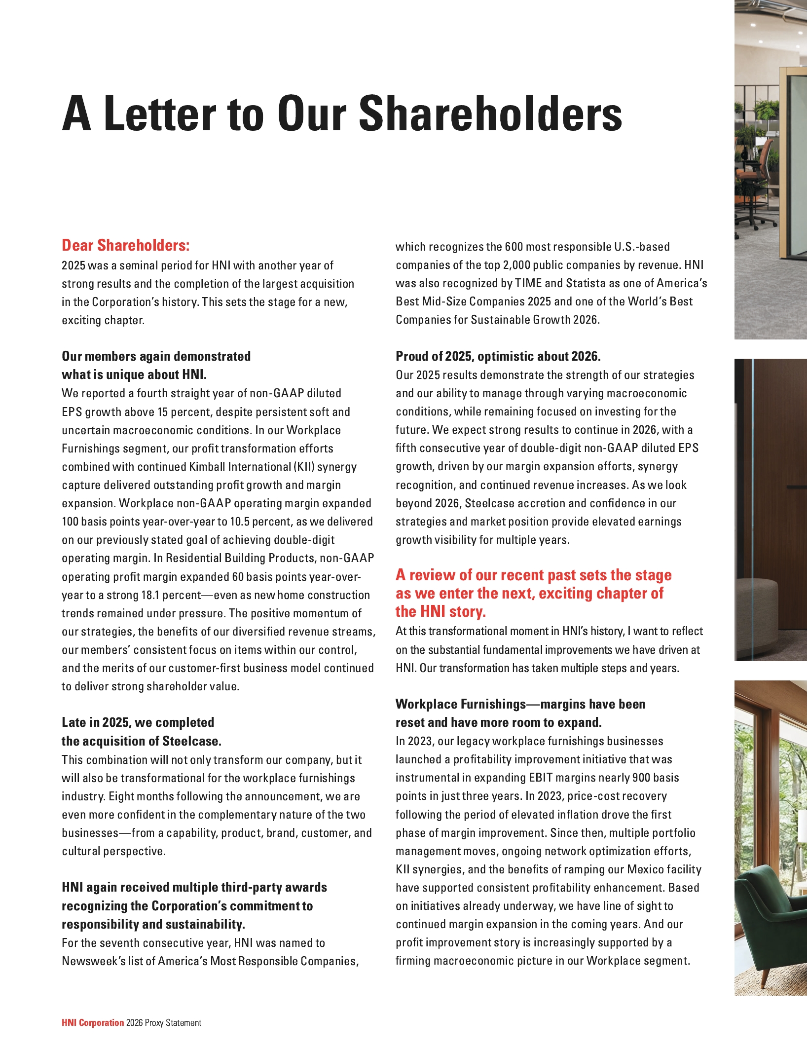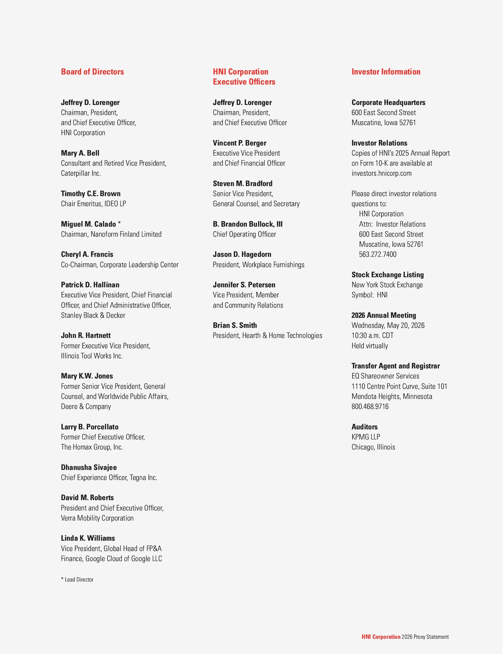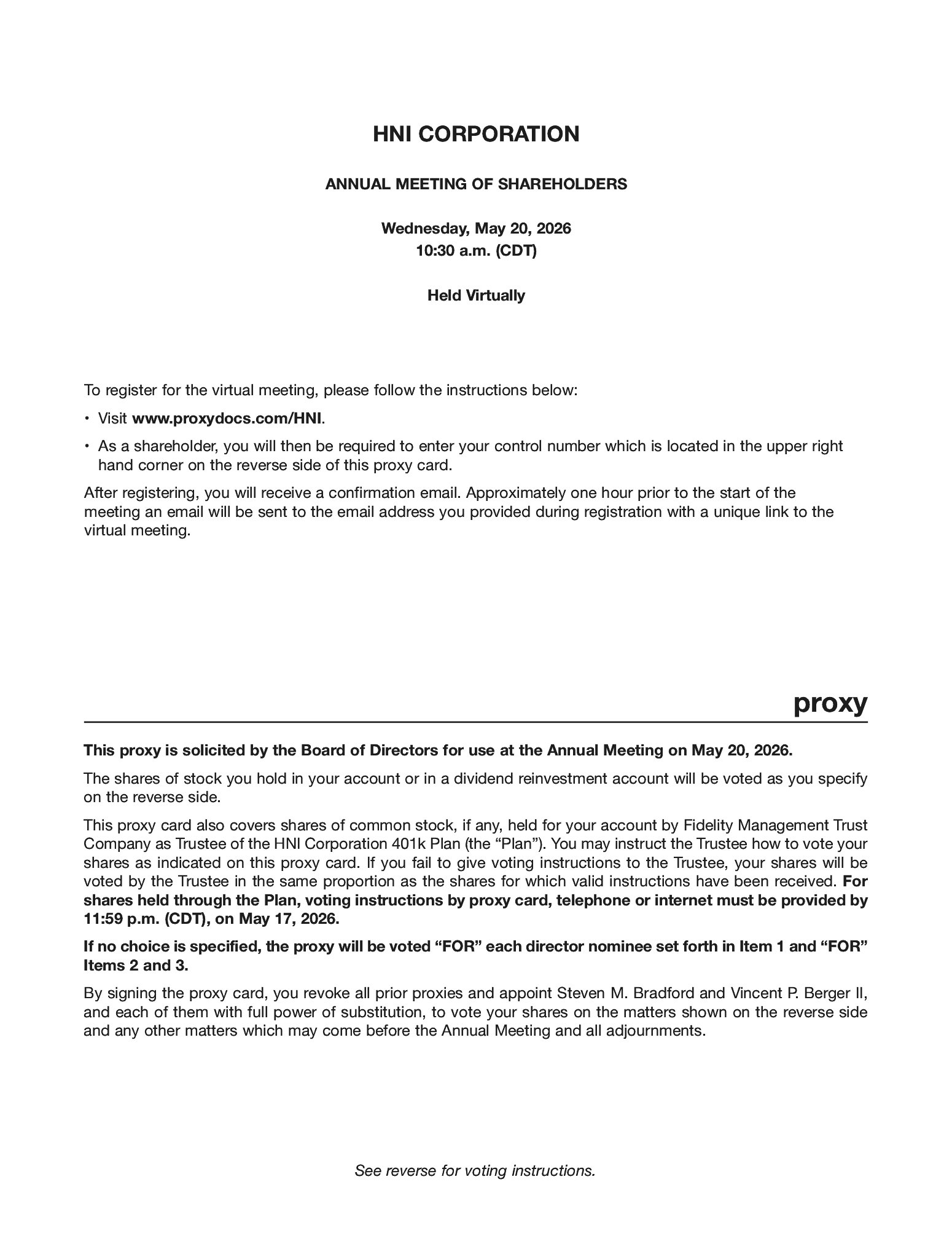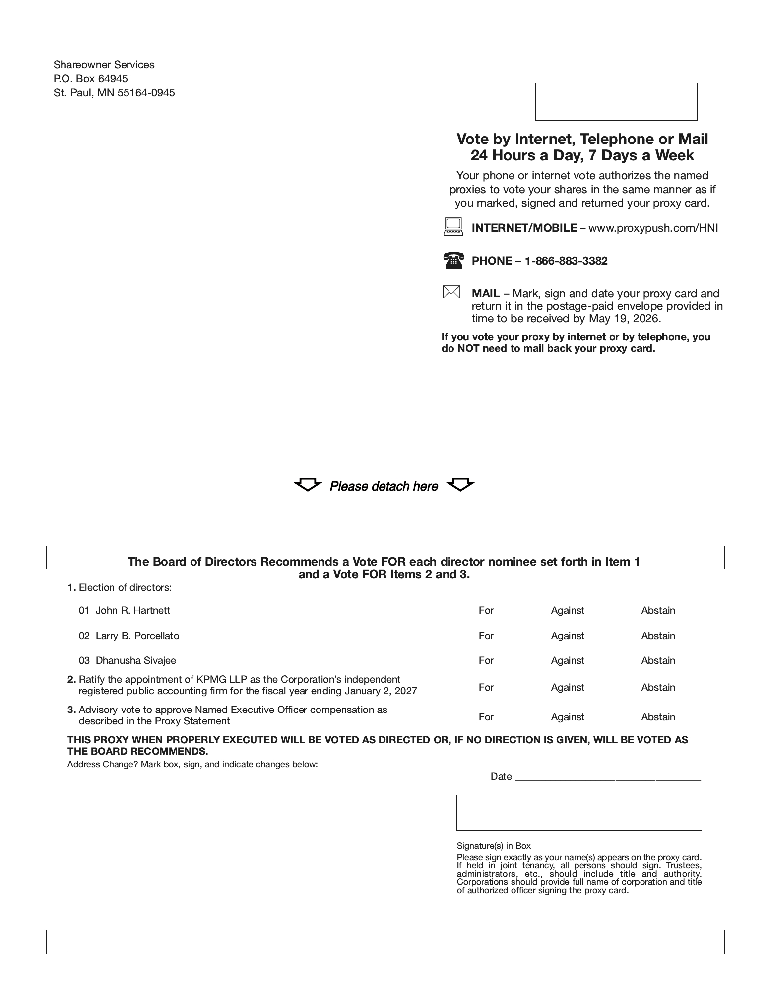 If you hold shares of the Corporation’s common stock as a stockholder of record, you have the right to vote those shares at the Annual Meeting during the meeting at the Corporation’s virtual meeting website at proxydocs.com/HNI. To be admitted at the Annual Meeting and vote your shares, you must register in advance and provide the Control Number contained in the Important Notice Regarding the Availability of Proxy Materials for the Shareholder Meeting to be Held on May 20, 2026 (the “Notice”) or proxy card. After completion of your registration, further instructions, including a unique link to access the Annual Meeting, will be emailed to you.
