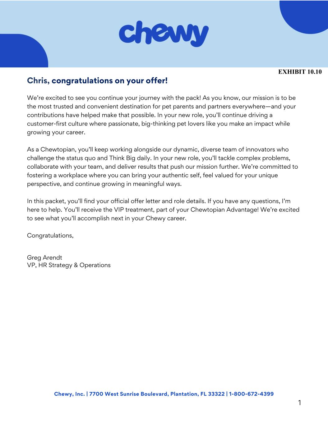 Chewy, Inc. | 7700 West Sunrise Boulevard, Plantation, FL 33322 | 1-800-672-4399 1 Chris, congratulations on your offer! We’re excited to see you continue your journey with the pack! As you know, our mission is to be the most trusted and convenient destination for pet parents and partners everywhere—and your contributions have helped make that possible. In your new role, you’ll continue driving a customer-first culture where passionate, big-thinking pet lovers like you make an impact while growing your career. As a Chewtopian, you’ll keep working alongside our dynamic, diverse team of innovators who challenge the status quo and Think Big daily. In your new role, you’ll tackle complex problems, collaborate with your team, and deliver results that push our mission further. We’re committed to fostering a workplace where you can bring your authentic self, feel valued for your unique perspective, and continue growing in meaningful ways. In this packet, you’ll find your official offer letter and role details. If you have any questions, I’m here to help. You’ll receive the VIP treatment, part of your Chewtopian Advantage! We’re excited to see what you’ll accomplish next in your Chewy career. Congratulations, Greg Arendt VP, HR Strategy & Operations EXHIBIT 10.10