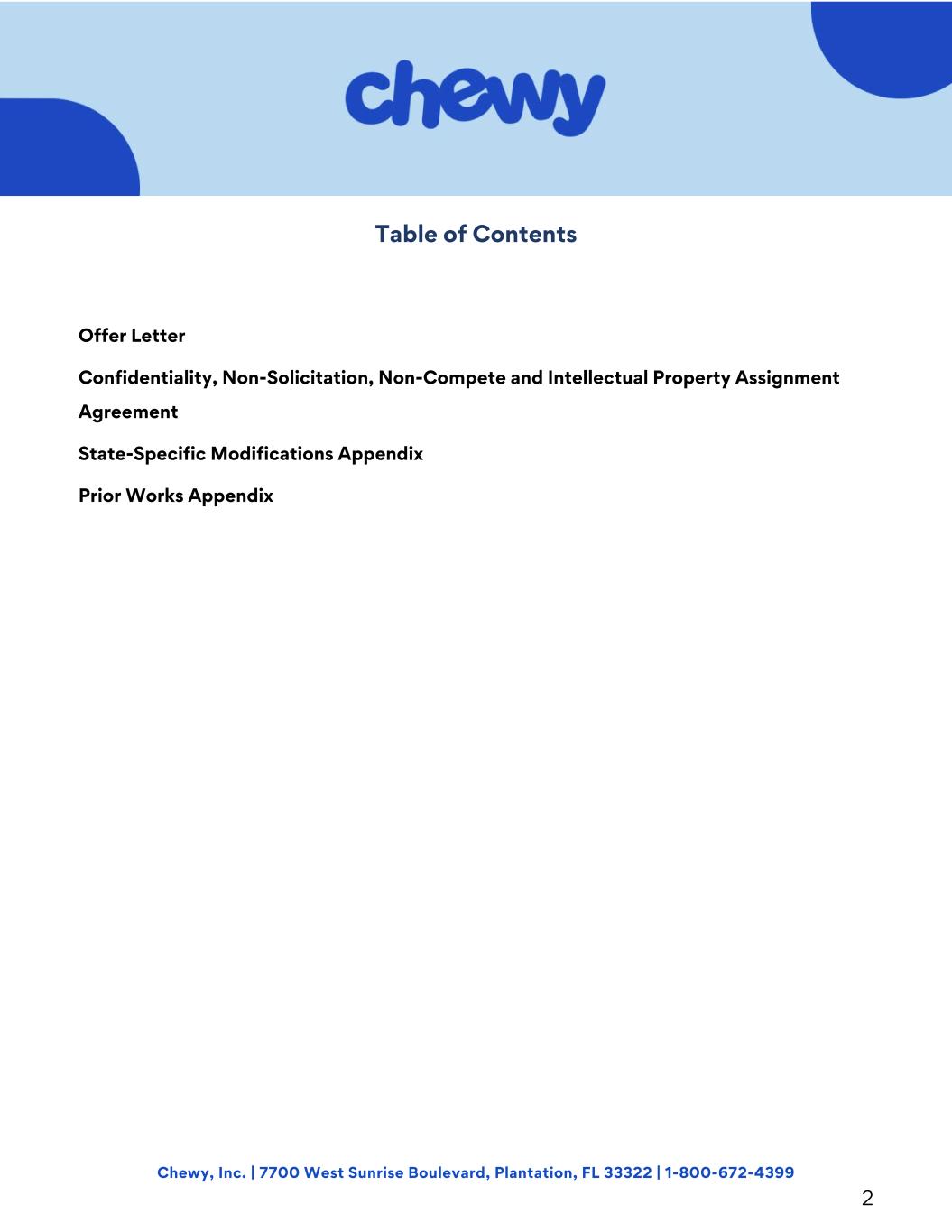 Chewy, Inc. | 7700 West Sunrise Boulevard, Plantation, FL 33322 | 1-800-672-4399 2 Table of Contents Offer Letter Confidentiality, Non-Solicitation, Non-Compete and Intellectual Property Assignment Agreement State-Specific Modifications Appendix Prior Works Appendix