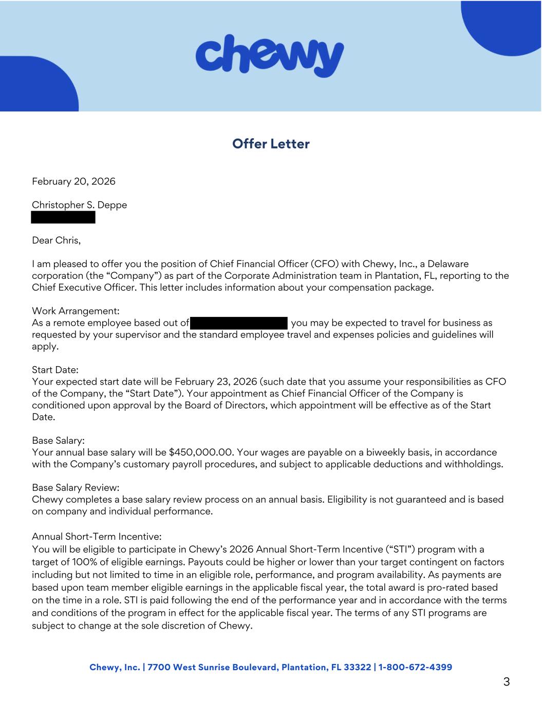 Chewy, Inc. | 7700 West Sunrise Boulevard, Plantation, FL 33322 | 1-800-672-4399 3 Offer Letter February 20, 2026 Christopher S. Deppe Dear Chris, I am pleased to offer you the position of Chief Financial Officer (CFO) with Chewy, Inc., a Delaware corporation (the “Company”) as part of the Corporate Administration team in Plantation, FL, reporting to the Chief Executive Officer. This letter includes information about your compensation package. Work Arrangement: As a remote employee based out of you may be expected to travel for business as requested by your supervisor and the standard employee travel and expenses policies and guidelines will apply. Start Date: Your expected start date will be February 23, 2026 (such date that you assume your responsibilities as CFO of the Company, the “Start Date”). Your appointment as Chief Financial Officer of the Company is conditioned upon approval by the Board of Directors, which appointment will be effective as of the Start Date. Base Salary: Your annual base salary will be $450,000.00. Your wages are payable on a biweekly basis, in accordance with the Company’s customary payroll procedures, and subject to applicable deductions and withholdings. Base Salary Review: Chewy completes a base salary review process on an annual basis. Eligibility is not guaranteed and is based on company and individual performance. Annual Short-Term Incentive: You will be eligible to participate in Chewy’s 2026 Annual Short-Term Incentive (“STI”) program with a target of 100% of eligible earnings. Payouts could be higher or lower than your target contingent on factors including but not limited to time in an eligible role, performance, and program availability. As payments are based upon team member eligible earnings in the applicable fiscal year, the total award is pro-rated based on the time in a role. STI is paid following the end of the performance year and in accordance with the terms and conditions of the program in effect for the applicable fiscal year. The terms of any STI programs are subject to change at the sole discretion of Chewy.