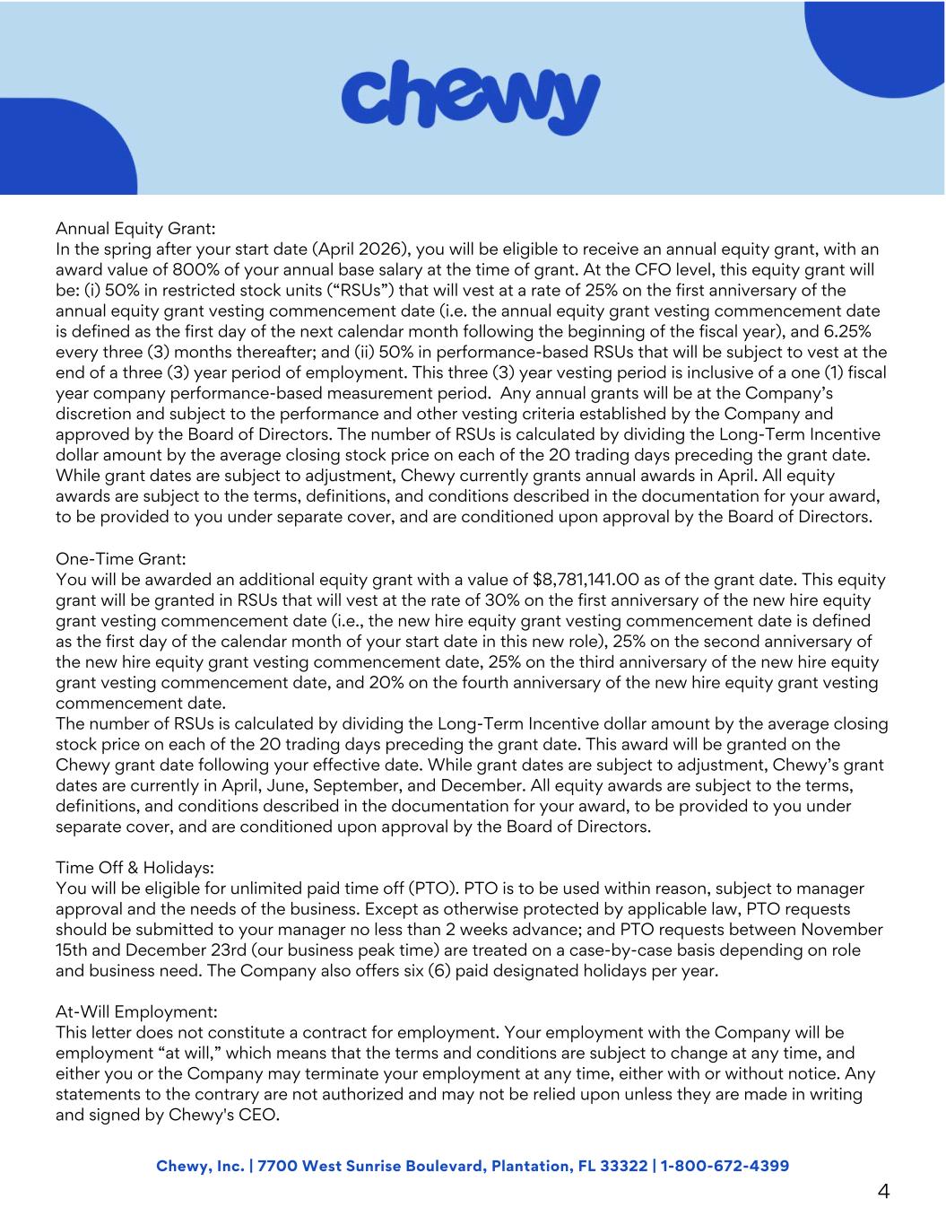 Chewy, Inc. | 7700 West Sunrise Boulevard, Plantation, FL 33322 | 1-800-672-4399 4 Annual Equity Grant: In the spring after your start date (April 2026), you will be eligible to receive an annual equity grant, with an award value of 800% of your annual base salary at the time of grant. At the CFO level, this equity grant will be: (i) 50% in restricted stock units (“RSUs”) that will vest at a rate of 25% on the first anniversary of the annual equity grant vesting commencement date (i.e. the annual equity grant vesting commencement date is defined as the first day of the next calendar month following the beginning of the fiscal year), and 6.25% every three (3) months thereafter; and (ii) 50% in performance-based RSUs that will be subject to vest at the end of a three (3) year period of employment. This three (3) year vesting period is inclusive of a one (1) fiscal year company performance-based measurement period. Any annual grants will be at the Company’s discretion and subject to the performance and other vesting criteria established by the Company and approved by the Board of Directors. The number of RSUs is calculated by dividing the Long-Term Incentive dollar amount by the average closing stock price on each of the 20 trading days preceding the grant date. While grant dates are subject to adjustment, Chewy currently grants annual awards in April. All equity awards are subject to the terms, definitions, and conditions described in the documentation for your award, to be provided to you under separate cover, and are conditioned upon approval by the Board of Directors. One-Time Grant: You will be awarded an additional equity grant with a value of $8,781,141.00 as of the grant date. This equity grant will be granted in RSUs that will vest at the rate of 30% on the first anniversary of the new hire equity grant vesting commencement date (i.e., the new hire equity grant vesting commencement date is defined as the first day of the calendar month of your start date in this new role), 25% on the second anniversary of the new hire equity grant vesting commencement date, 25% on the third anniversary of the new hire equity grant vesting commencement date, and 20% on the fourth anniversary of the new hire equity grant vesting commencement date. The number of RSUs is calculated by dividing the Long-Term Incentive dollar amount by the average closing stock price on each of the 20 trading days preceding the grant date. This award will be granted on the Chewy grant date following your effective date. While grant dates are subject to adjustment, Chewy’s grant dates are currently in April, June, September, and December. All equity awards are subject to the terms, definitions, and conditions described in the documentation for your award, to be provided to you under separate cover, and are conditioned upon approval by the Board of Directors. Time Off & Holidays: You will be eligible for unlimited paid time off (PTO). PTO is to be used within reason, subject to manager approval and the needs of the business. Except as otherwise protected by applicable law, PTO requests should be submitted to your manager no less than 2 weeks advance; and PTO requests between November 15th and December 23rd (our business peak time) are treated on a case-by-case basis depending on role and business need. The Company also offers six (6) paid designated holidays per year. At-Will Employment: This letter does not constitute a contract for employment. Your employment with the Company will be employment “at will,” which means that the terms and conditions are subject to change at any time, and either you or the Company may terminate your employment at any time, either with or without notice. Any statements to the contrary are not authorized and may not be relied upon unless they are made in writing and signed by Chewy's CEO.