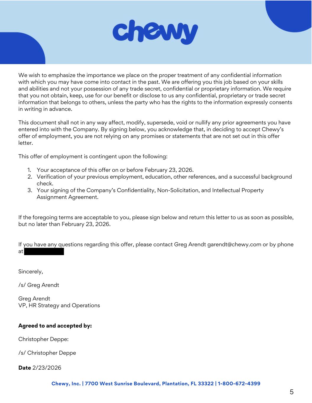5 We wish to emphasize the importance we place on the proper treatment of any confidential information with which you may have come into contact in the past. We are offering you this job based on your skills and abilities and not your possession of any trade secret, confidential or proprietary information. We require that you not obtain, keep, use for our benefit or disclose to us any confidential, proprietary or trade secret information that belongs to others, unless the party who has the rights to the information expressly consents in writing in advance. This document shall not in any way affect, modify, supersede, void or nullify any prior agreements you have entered into with the Company. By signing below, you acknowledge that, in deciding to accept Chewy’s offer of employment, you are not relying on any promises or statements that are not set out in this offer letter. This offer of employment is contingent upon the following: 1. Your acceptance of this offer on or before February 23, 2026. 2. Verification of your previous employment, education, other references, and a successful background check. 3. Your signing of the Company’s Confidentiality, Non-Solicitation, and Intellectual Property Assignment Agreement. If the foregoing terms are acceptable to you, please sign below and return this letter to us as soon as possible, but no later than February 23, 2026. If you have any questions regarding this offer, please contact Greg Arendt garendt@chewy.com or by phone at Sincerely, /s/ Greg Arendt Greg Arendt VP, HR Strategy and Operations Agreed to and accepted by: Christopher Deppe: /s/ Christopher Deppe Date 2/23/2026 Chewy, Inc. | 7700 West Sunrise Boulevard, Plantation, FL 33322 | 1-800-672-4399