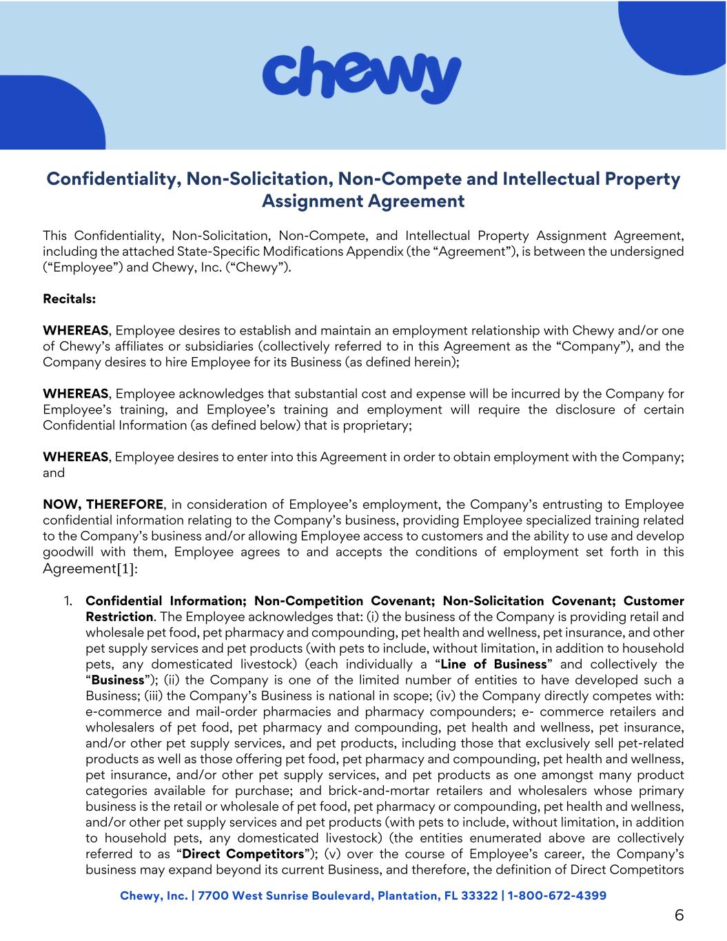 Chewy, Inc. | 7700 West Sunrise Boulevard, Plantation, FL 33322 | 1-800-672-4399 6 Confidentiality, Non-Solicitation, Non-Compete and Intellectual Property Assignment Agreement This Confidentiality, Non-Solicitation, Non-Compete, and Intellectual Property Assignment Agreement, including the attached State-Specific Modifications Appendix (the “Agreement”), is between the undersigned (“Employee”) and Chewy, Inc. (“Chewy”). Recitals: WHEREAS, Employee desires to establish and maintain an employment relationship with Chewy and/or one of Chewy’s affiliates or subsidiaries (collectively referred to in this Agreement as the “Company”), and the Company desires to hire Employee for its Business (as defined herein); WHEREAS, Employee acknowledges that substantial cost and expense will be incurred by the Company for Employee’s training, and Employee’s training and employment will require the disclosure of certain Confidential Information (as defined below) that is proprietary; WHEREAS, Employee desires to enter into this Agreement in order to obtain employment with the Company; and NOW, THEREFORE, in consideration of Employee’s employment, the Company’s entrusting to Employee confidential information relating to the Company’s business, providing Employee specialized training related to the Company’s business and/or allowing Employee access to customers and the ability to use and develop goodwill with them, Employee agrees to and accepts the conditions of employment set forth in this Agreement[1]: 1. Confidential Information; Non-Competition Covenant; Non-Solicitation Covenant; Customer Restriction. The Employee acknowledges that: (i) the business of the Company is providing retail and wholesale pet food, pet pharmacy and compounding, pet health and wellness, pet insurance, and other pet supply services and pet products (with pets to include, without limitation, in addition to household pets, any domesticated livestock) (each individually a “Line of Business” and collectively the “Business”); (ii) the Company is one of the limited number of entities to have developed such a Business; (iii) the Company’s Business is national in scope; (iv) the Company directly competes with: e-commerce and mail-order pharmacies and pharmacy compounders; e- commerce retailers and wholesalers of pet food, pet pharmacy and compounding, pet health and wellness, pet insurance, and/or other pet supply services, and pet products, including those that exclusively sell pet-related products as well as those offering pet food, pet pharmacy and compounding, pet health and wellness, pet insurance, and/or other pet supply services, and pet products as one amongst many product categories available for purchase; and brick-and-mortar retailers and wholesalers whose primary business is the retail or wholesale of pet food, pet pharmacy or compounding, pet health and wellness, and/or other pet supply services and pet products (with pets to include, without limitation, in addition to household pets, any domesticated livestock) (the entities enumerated above are collectively referred to as “Direct Competitors”); (v) over the course of Employee’s career, the Company’s business may expand beyond its current Business, and therefore, the definition of Direct Competitors