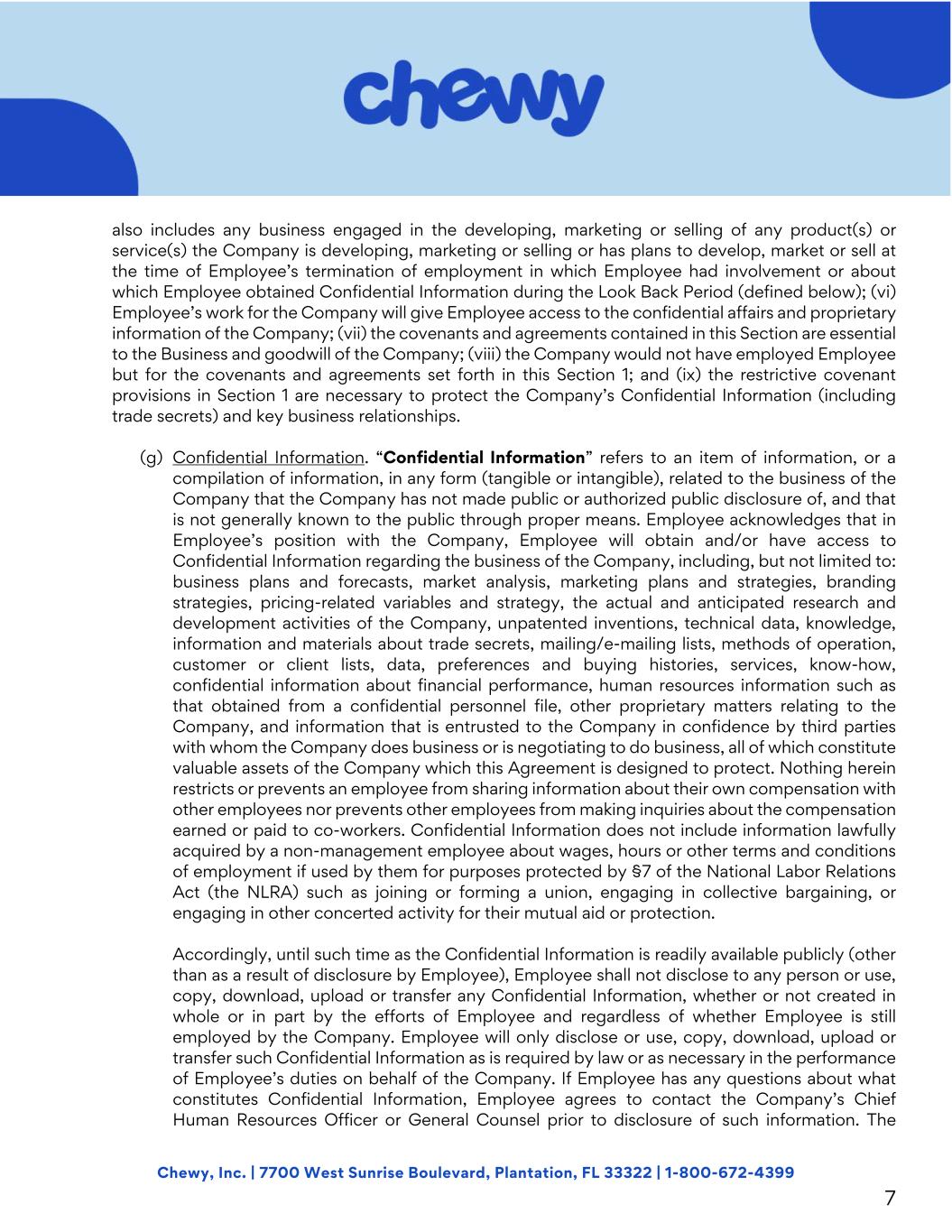 Chewy, Inc. | 7700 West Sunrise Boulevard, Plantation, FL 33322 | 1-800-672-4399 7 also includes any business engaged in the developing, marketing or selling of any product(s) or service(s) the Company is developing, marketing or selling or has plans to develop, market or sell at the time of Employee’s termination of employment in which Employee had involvement or about which Employee obtained Confidential Information during the Look Back Period (defined below); (vi) Employee’s work for the Company will give Employee access to the confidential affairs and proprietary information of the Company; (vii) the covenants and agreements contained in this Section are essential to the Business and goodwill of the Company; (viii) the Company would not have employed Employee but for the covenants and agreements set forth in this Section 1; and (ix) the restrictive covenant provisions in Section 1 are necessary to protect the Company’s Confidential Information (including trade secrets) and key business relationships. (g) Confidential Information. “Confidential Information” refers to an item of information, or a compilation of information, in any form (tangible or intangible), related to the business of the Company that the Company has not made public or authorized public disclosure of, and that is not generally known to the public through proper means. Employee acknowledges that in Employee’s position with the Company, Employee will obtain and/or have access to Confidential Information regarding the business of the Company, including, but not limited to: business plans and forecasts, market analysis, marketing plans and strategies, branding strategies, pricing-related variables and strategy, the actual and anticipated research and development activities of the Company, unpatented inventions, technical data, knowledge, information and materials about trade secrets, mailing/e-mailing lists, methods of operation, customer or client lists, data, preferences and buying histories, services, know-how, confidential information about financial performance, human resources information such as that obtained from a confidential personnel file, other proprietary matters relating to the Company, and information that is entrusted to the Company in confidence by third parties with whom the Company does business or is negotiating to do business, all of which constitute valuable assets of the Company which this Agreement is designed to protect. Nothing herein restricts or prevents an employee from sharing information about their own compensation with other employees nor prevents other employees from making inquiries about the compensation earned or paid to co-workers. Confidential Information does not include information lawfully acquired by a non-management employee about wages, hours or other terms and conditions of employment if used by them for purposes protected by §7 of the National Labor Relations Act (the NLRA) such as joining or forming a union, engaging in collective bargaining, or engaging in other concerted activity for their mutual aid or protection. Accordingly, until such time as the Confidential Information is readily available publicly (other than as a result of disclosure by Employee), Employee shall not disclose to any person or use, copy, download, upload or transfer any Confidential Information, whether or not created in whole or in part by the efforts of Employee and regardless of whether Employee is still employed by the Company. Employee will only disclose or use, copy, download, upload or transfer such Confidential Information as is required by law or as necessary in the performance of Employee’s duties on behalf of the Company. If Employee has any questions about what constitutes Confidential Information, Employee agrees to contact the Company’s Chief Human Resources Officer or General Counsel prior to disclosure of such information. The